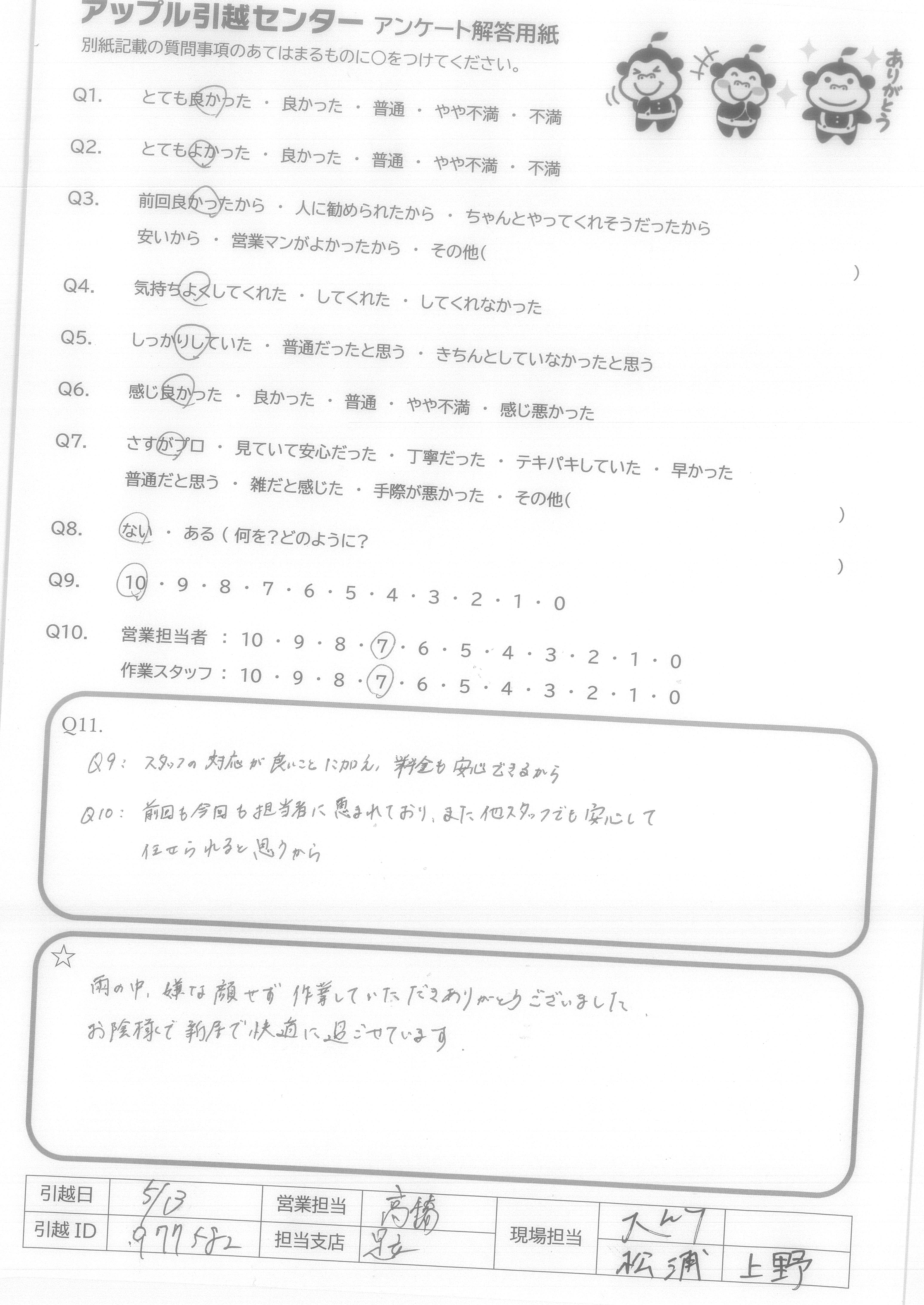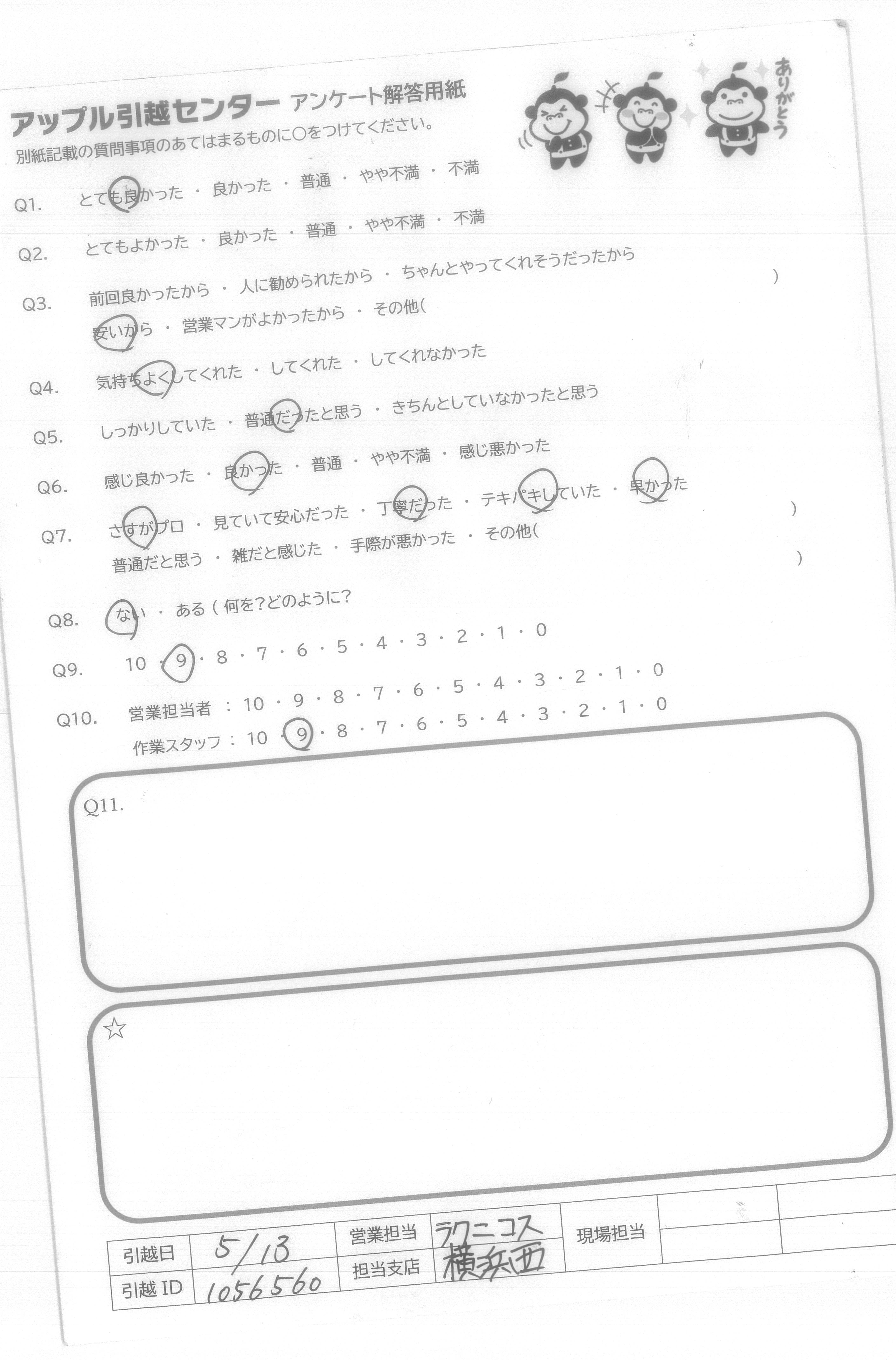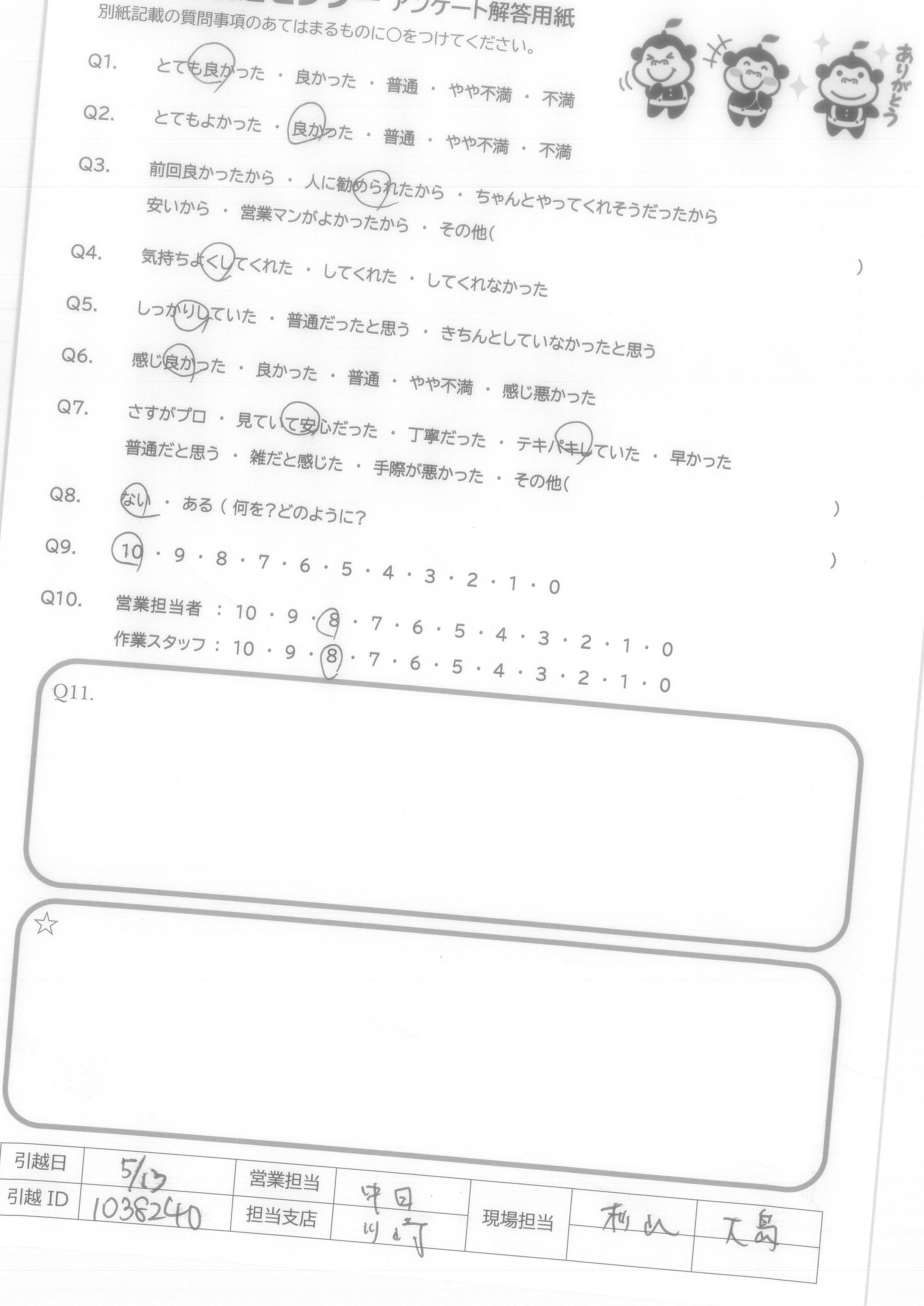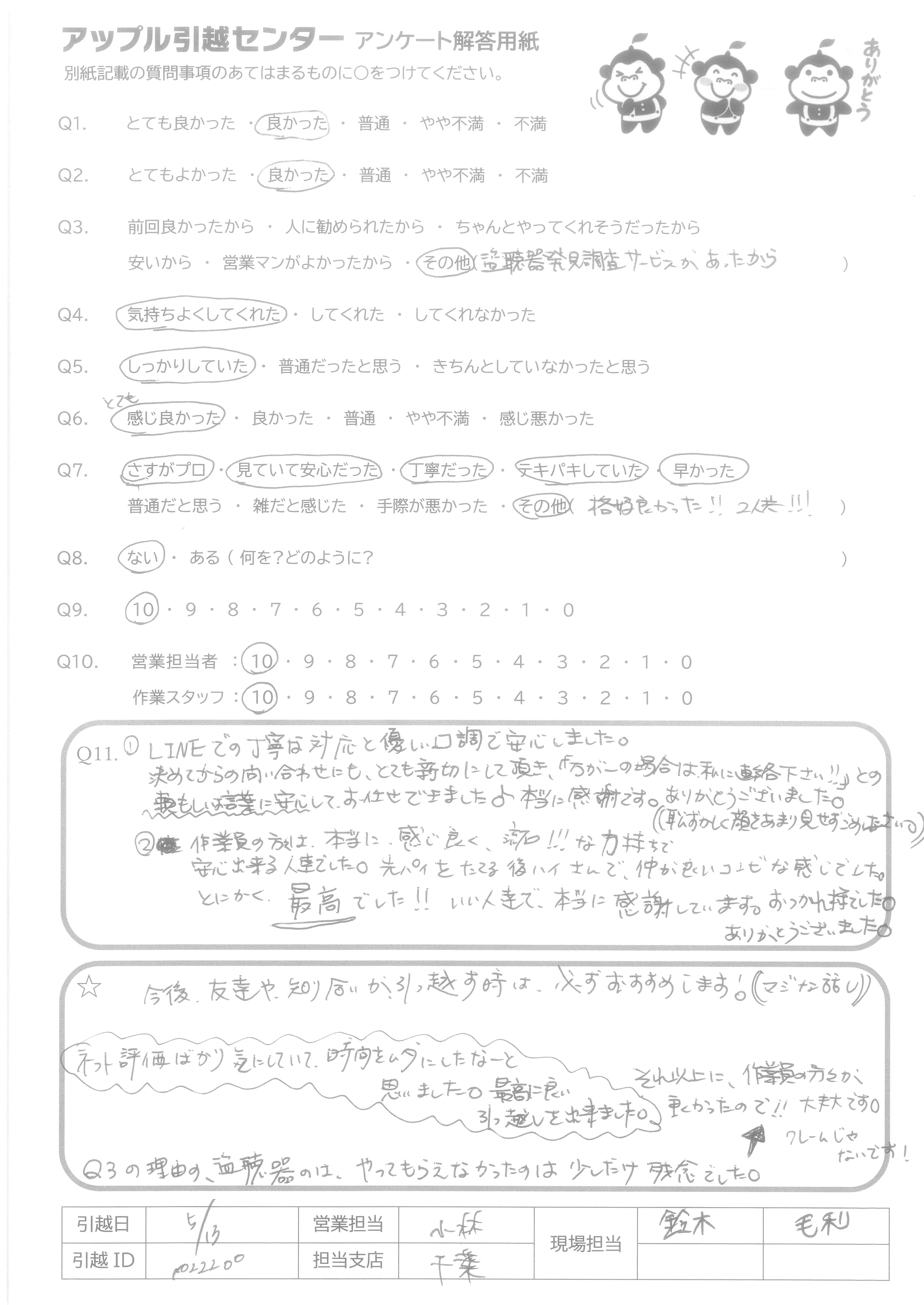 A.引っ越し業者さんにお願いするのは初めてでしたので不安と緊張でしたが、時間確認の電話対応の時点でとても感じの良い丁寧な印象を受けました。勿論その後も、終始安心してお願いすることができ、IKEA製品の解体と組み立ても素早くやって下さり本当に感動致しました。新しい生活が気持ち良くスタートできたのは今回担当して下さったスタッフさんのおかげです。ありがとうございました。