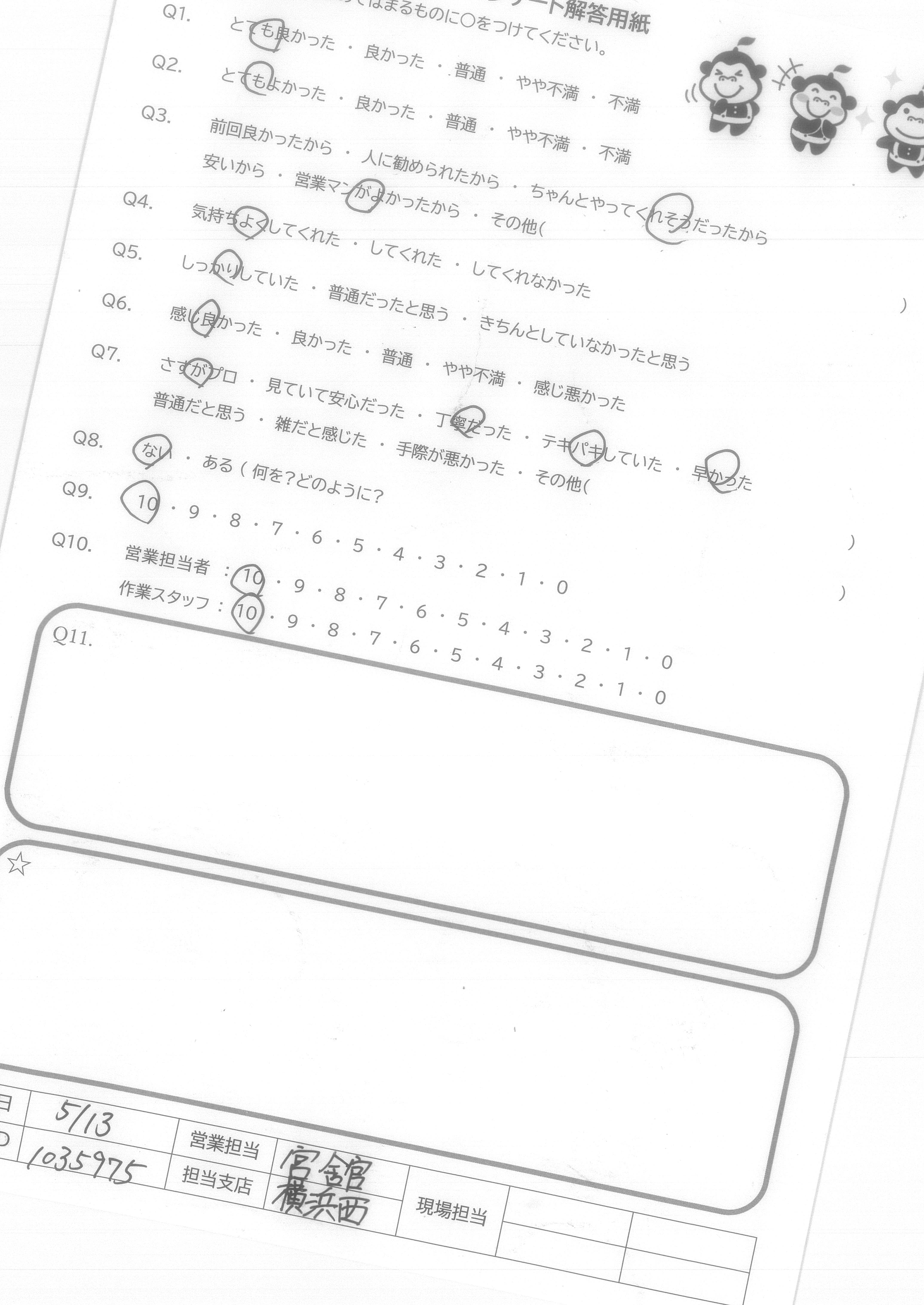 A.営業担当の方、現場担当の方共々、質問に適格に返答され、フォローアップもしっかりしてくれましたので安心してお願い出来ました。