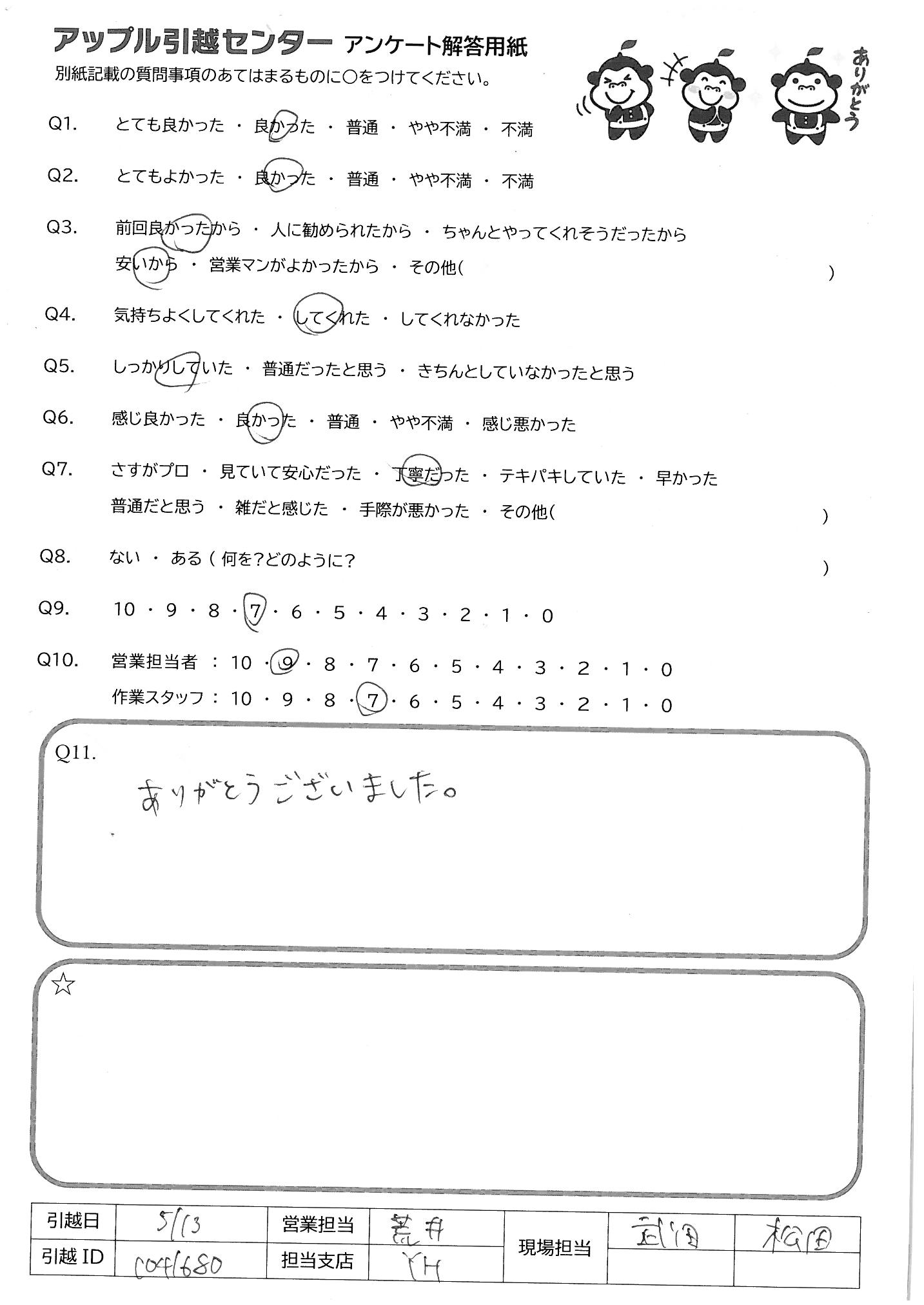 引越し日:2021年05月13日 エリア:神奈川県厚木市