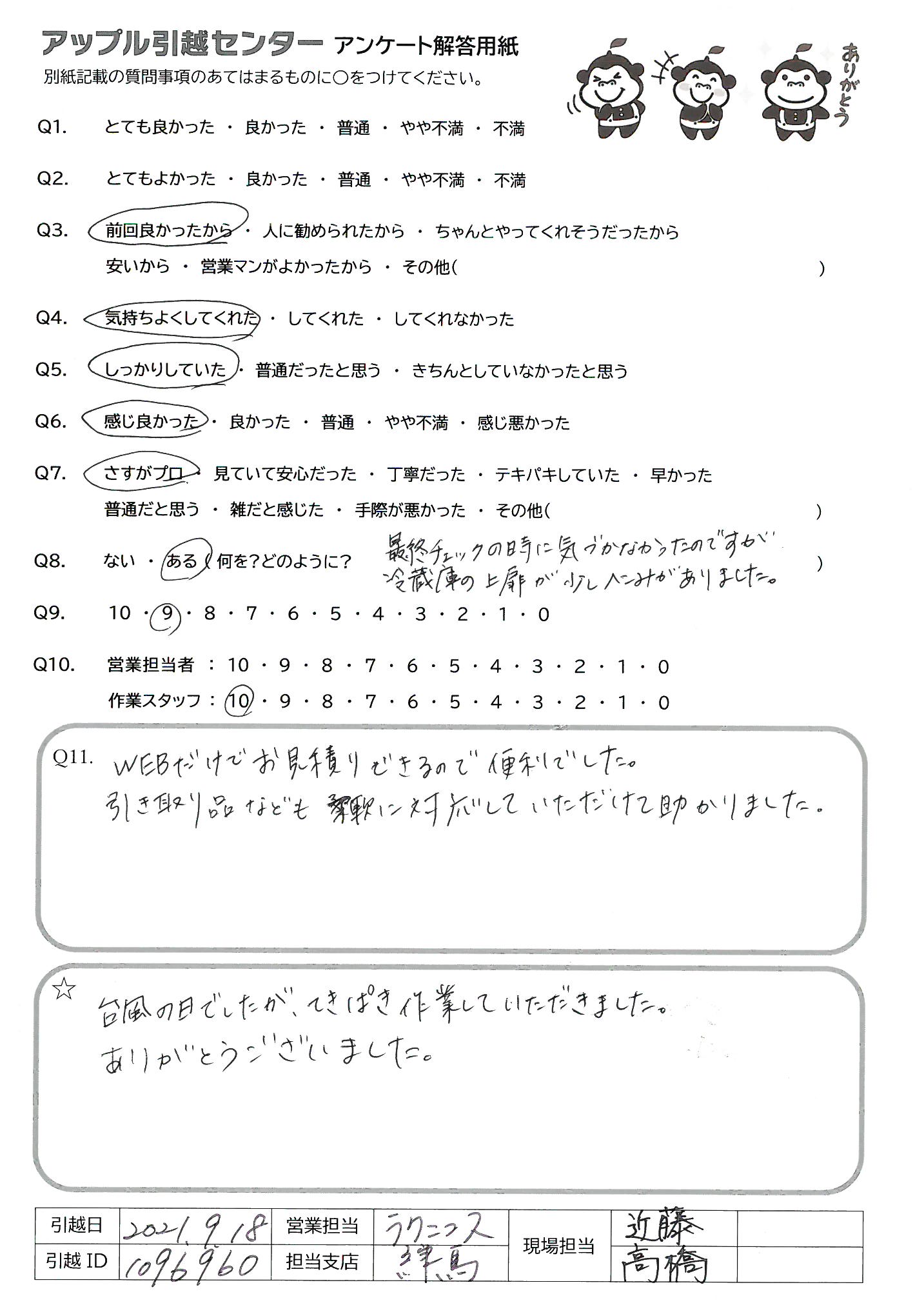 A.当日作業に当たってくださったタカハシ様、マツバラ様、本当にありがとうございました。 お陰様で迅速に安価で引っ越しができました。 また機会がありましたら何卒宜しくお願い致します。