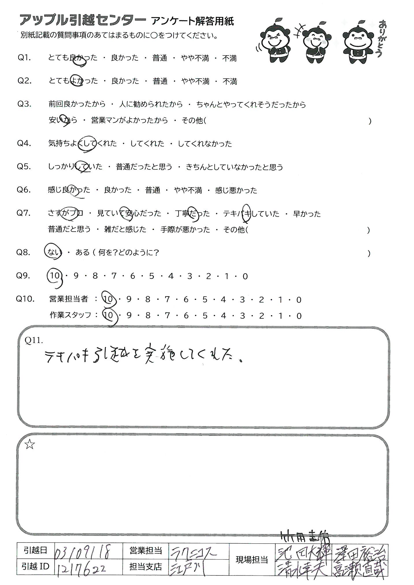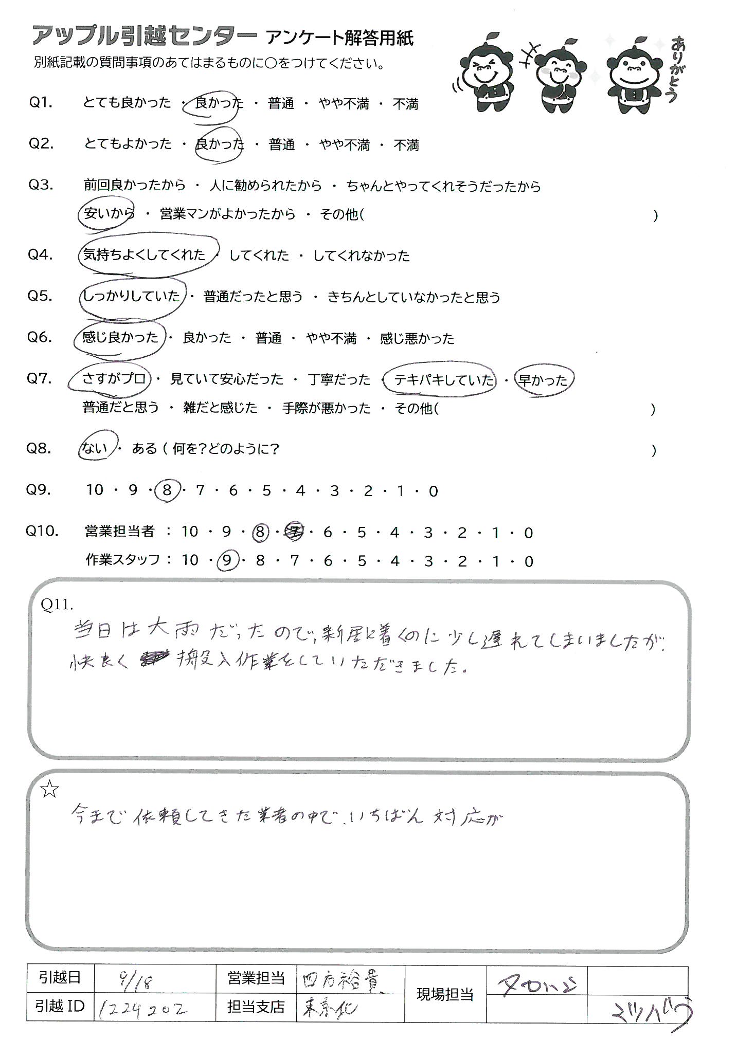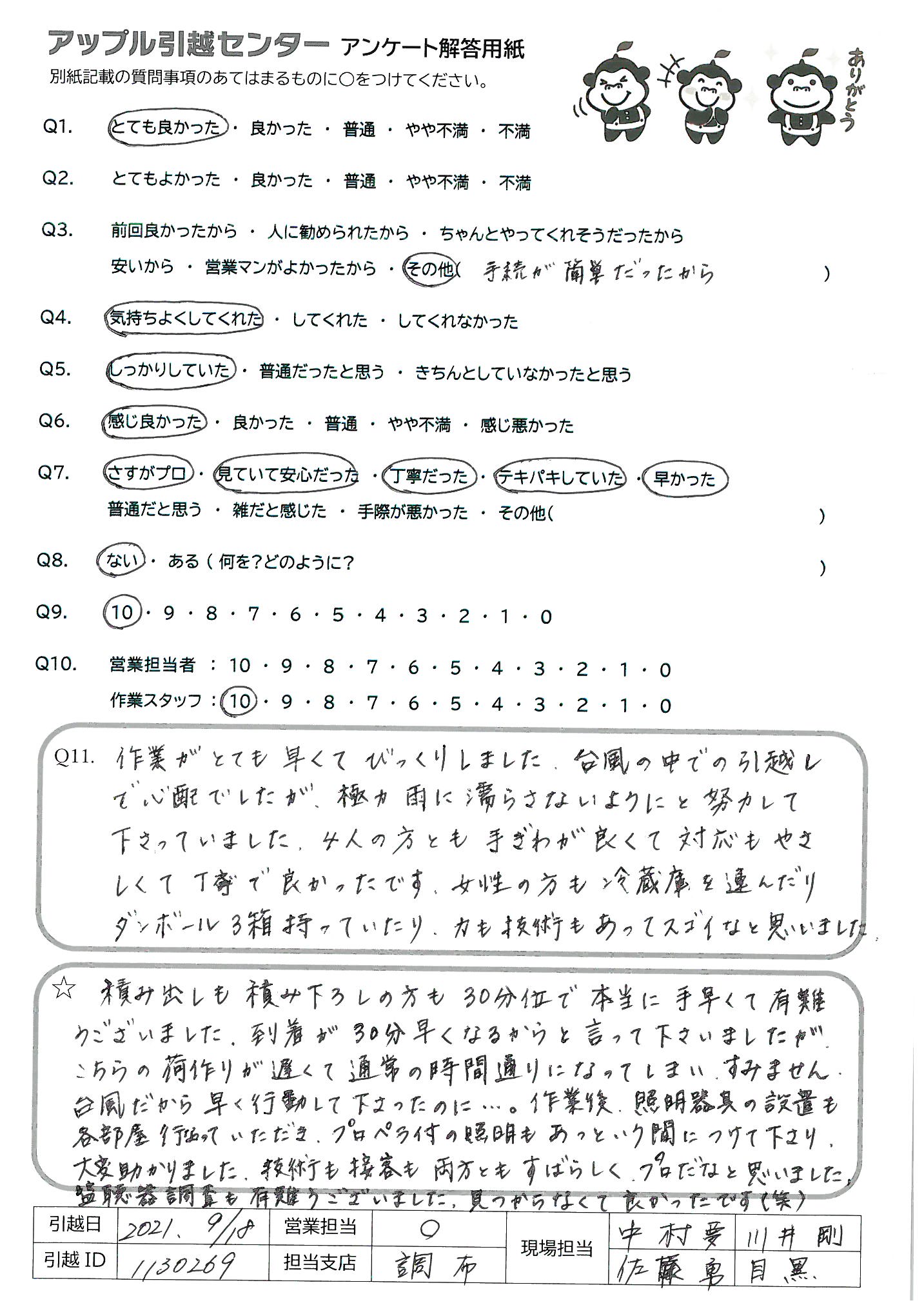 A.受付の電話応答からとても親切にしていただき、気持ち良く引っ越しができました。有難うございました。また次回引っ越しがあった際もアップルさんにお願いしたいと思います。