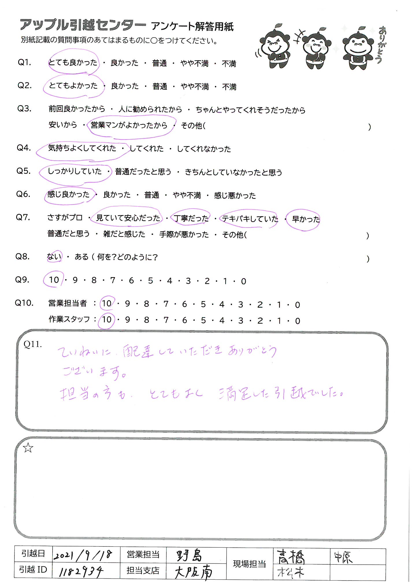 A.ていねいに配達していただきありがとうございます。 担当の方もとてもよく満足した引越でした。