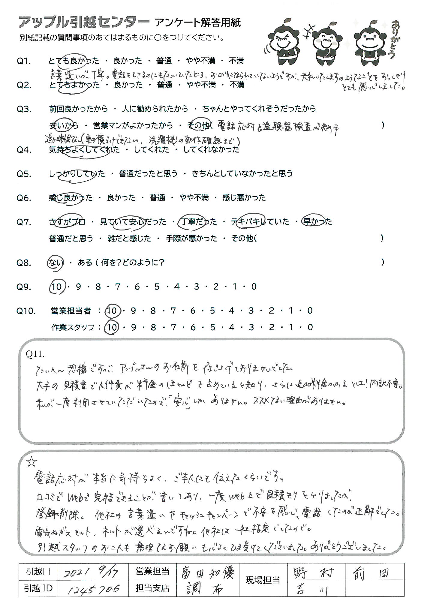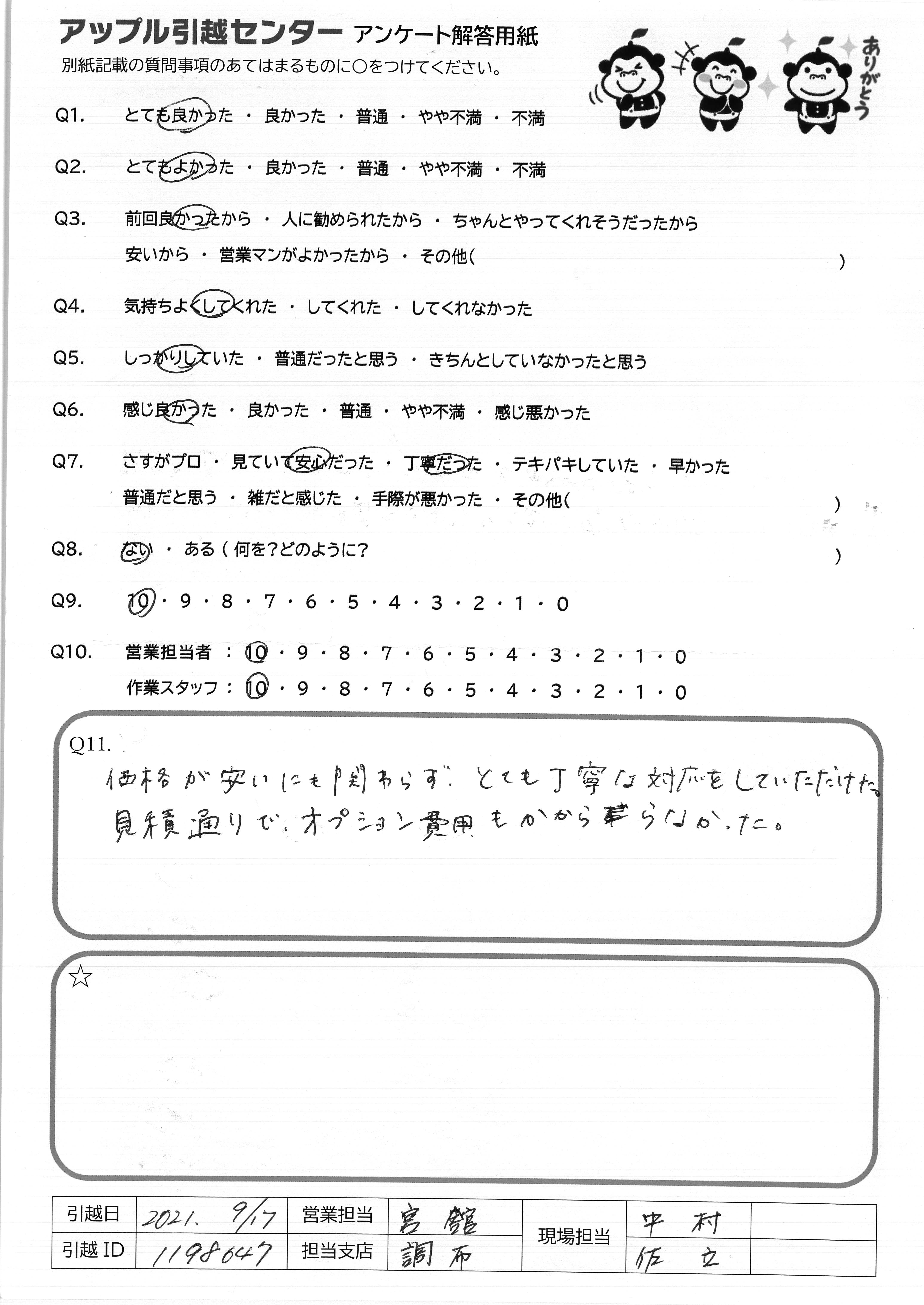 A.見積もりがわかりやすいのと対応が丁寧かつスピーディだったため。実際に身内に紹介したところ身内もアップルさん利用してました。