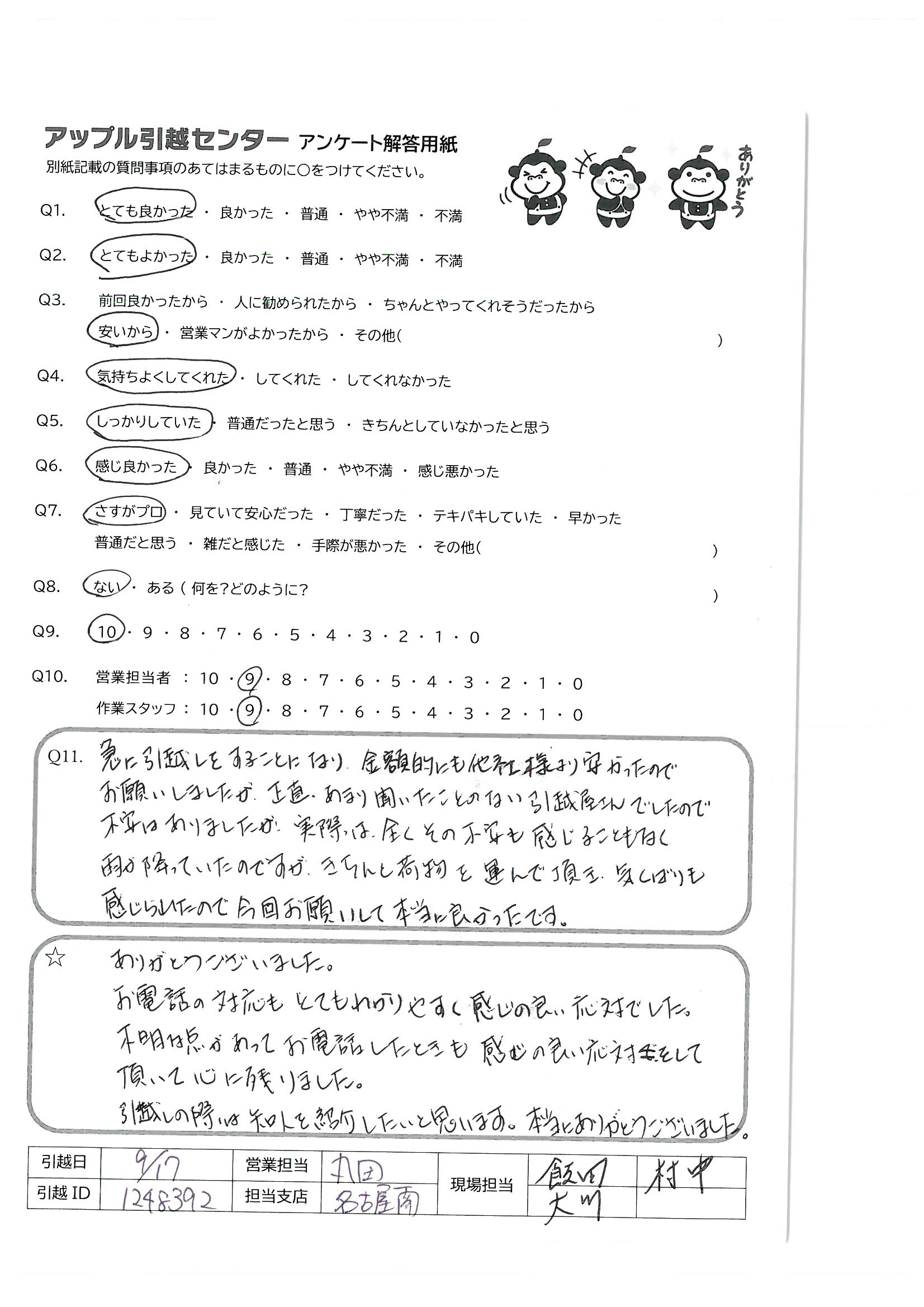 A.大変感じが良く、何より引越しする荷物にだけ目を向け淡々と仕事をするのではなく、見落としがちな蛍光灯や今後また引越しする時の豆知識まで作業を手際良くしながら親身になって教えて下さり、人柄の良さを感じました。 丁寧かつスピーディーに仕事をして下さったおかげで午後からの予定がスムーズに進み、大変助かりました。 引越しは何かとやる事も多く、精神的にも負担がかかるのでスタッフさんの、些細な親切さや感じの良さに救われました。 遠方から暑い中での作業になりましたが 一生懸命作業されており、仕事に対する真摯さが伝わり頭が下がる思いでした。 また引越しする機会がありましたら是非 アップルさんにお願いしたいです。 本日は有難うございました。