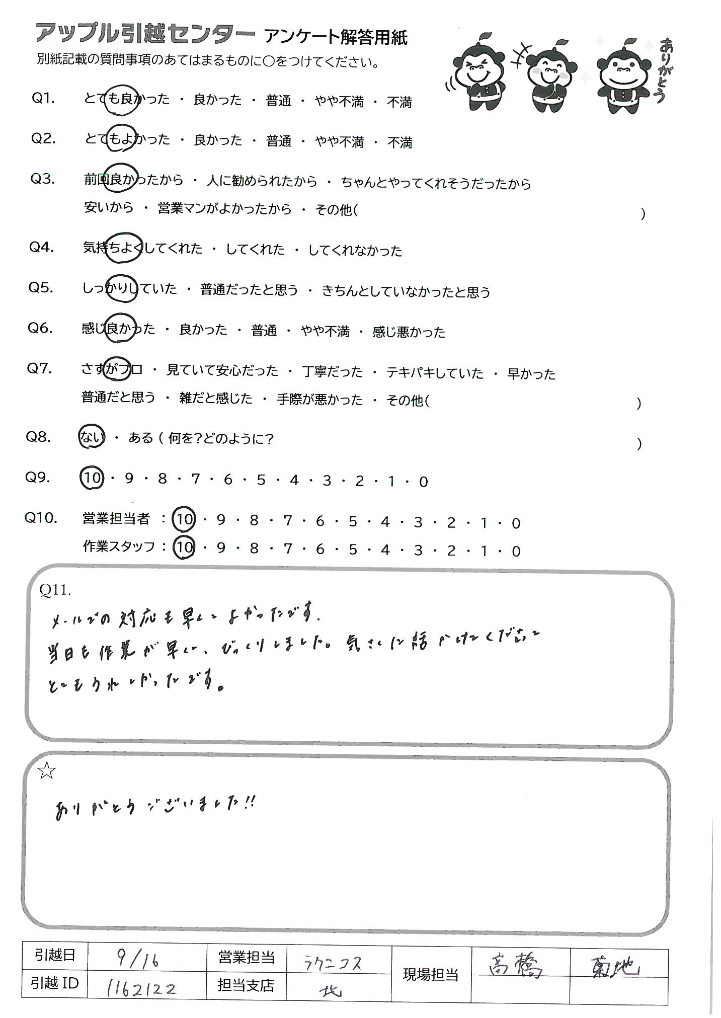 A.作業頂いた方が本当に感じがよく明るく気持ち良く引越し出来た。もし、周囲の人に引越しを相談されたら御社をおすすめしたい。 本日は誠にありがとうございました。