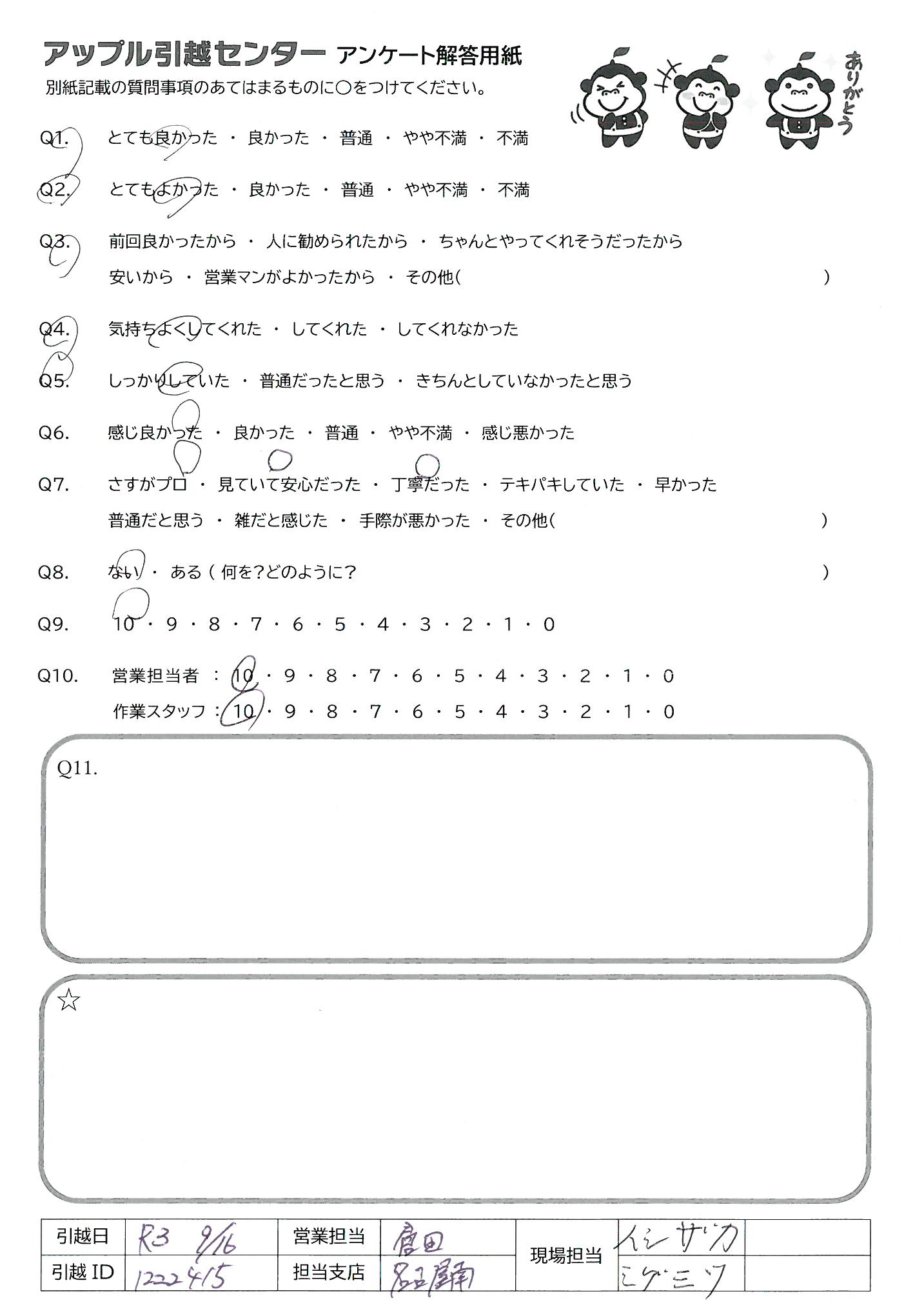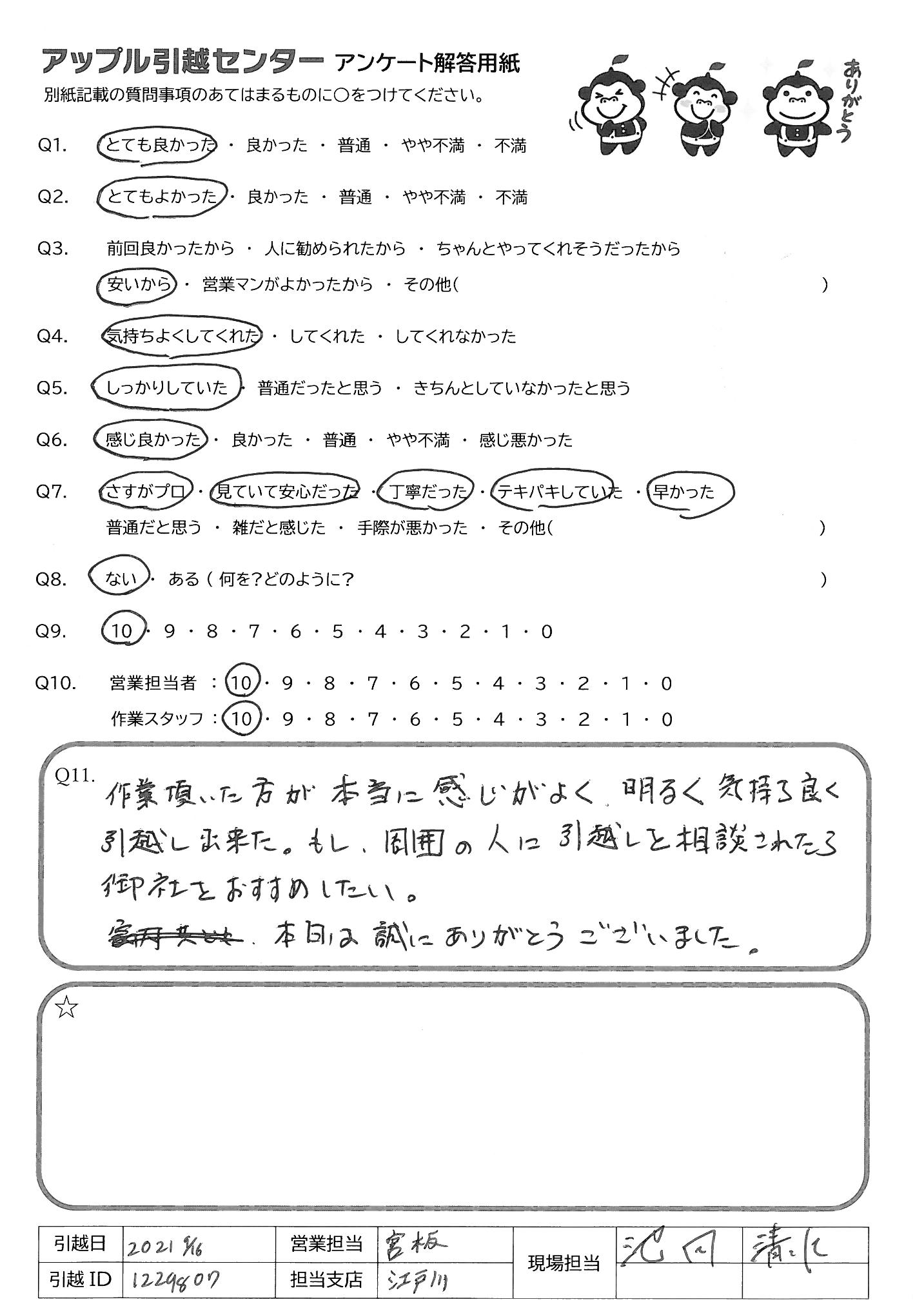 A.当日担当して頂いた菊地さんがとても感じが良く、どんな方が来るか不安もありましたが余計な心配でした。 作業も早くスムーズに引越しを終える事ができました。 もうお一人の徳留さんもあまり話す事がありませんでしたが、丁寧に作業して頂けたと感じております。 複数社に見積りを依頼しておりましたが、電話対応して頂いた島袋さん、寺田さん両名もとても丁寧で電話の時点で他社の見積もりを待たずに御社にお願いしたいと思う程でした。 この度は誠に有り難うございました。