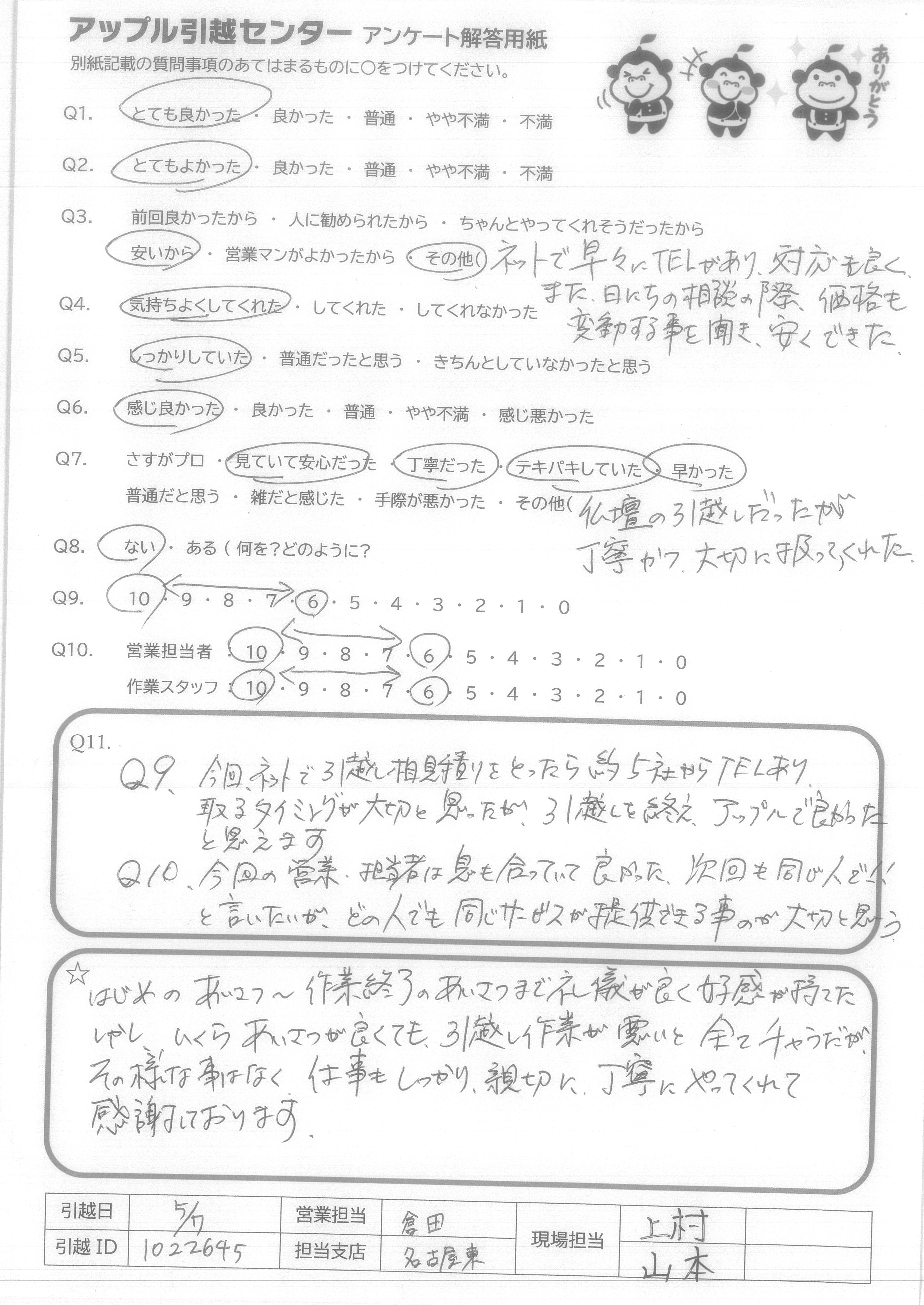 A.Q9、今回ネットで引越し相見積りをとったら約5社からTELあり、取るタイミングが大切と思ったが、引越しを終え、アップルで良かったと思えます。 Q10、今回の営業・担当者は息も合っていて良かった。次回も同じ人で!!と言いたいが、どの人でも同じサービスが提供できる事のが大切と思う。