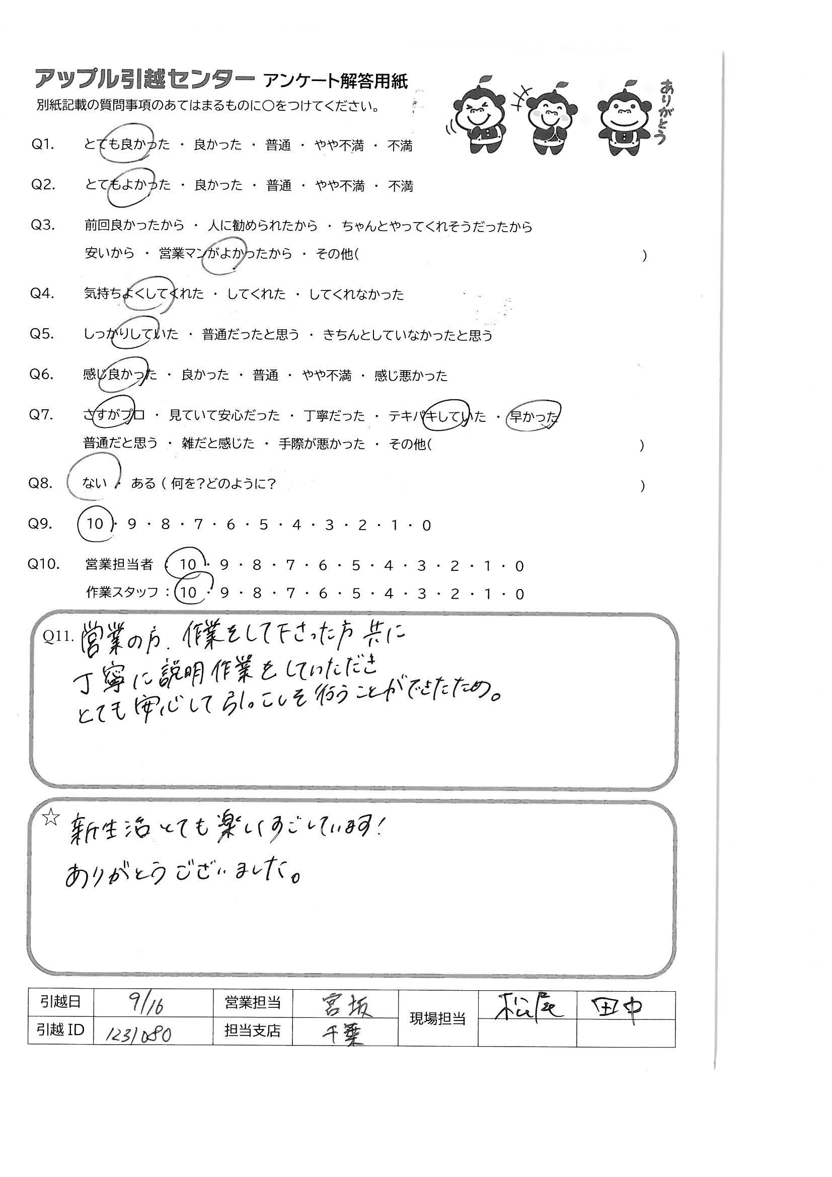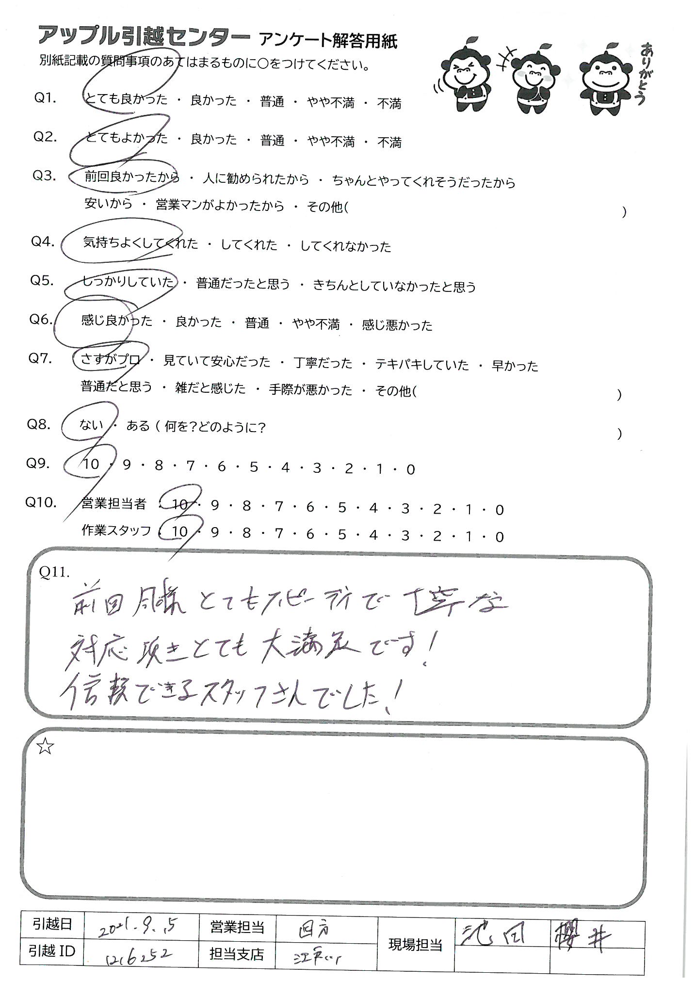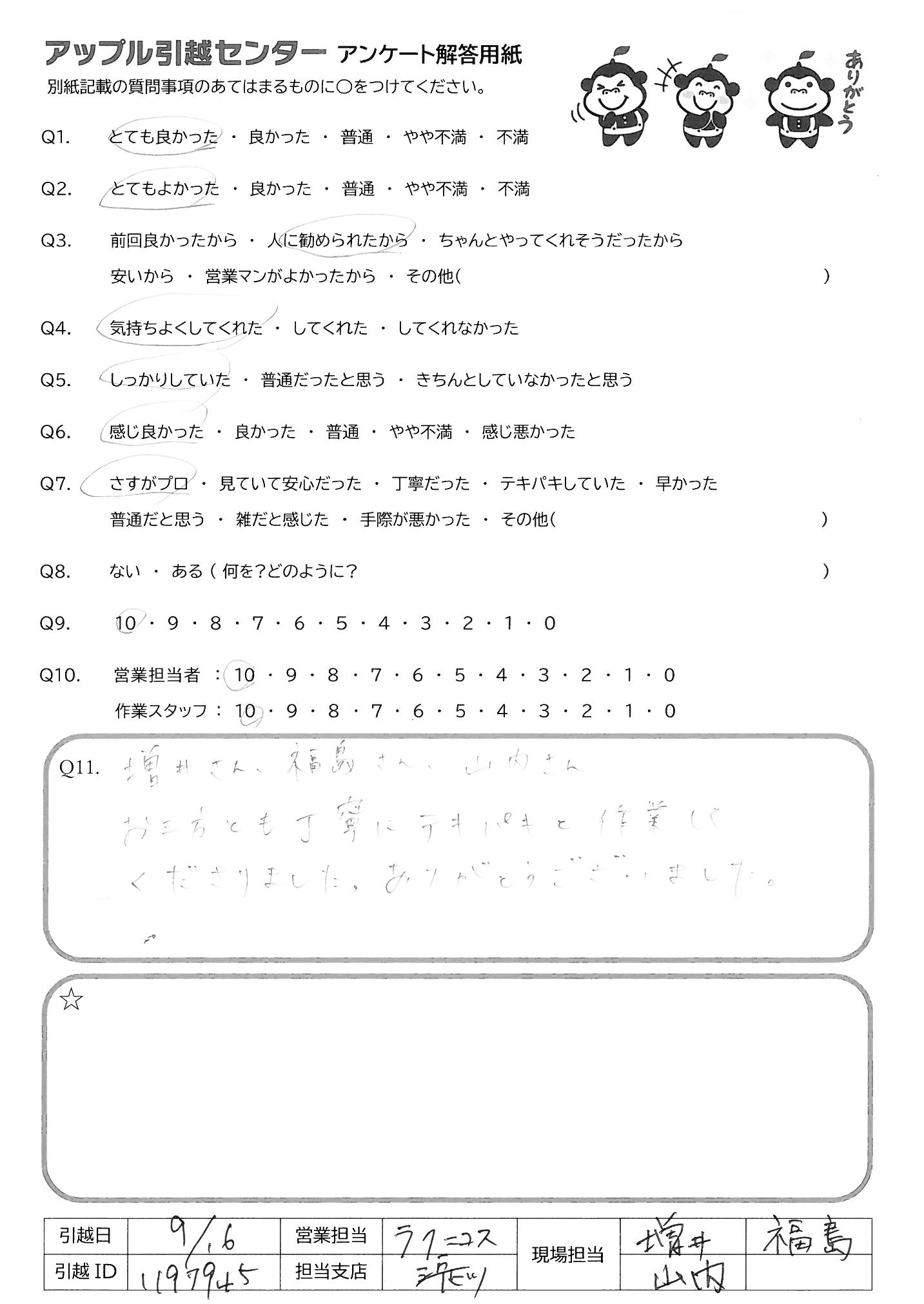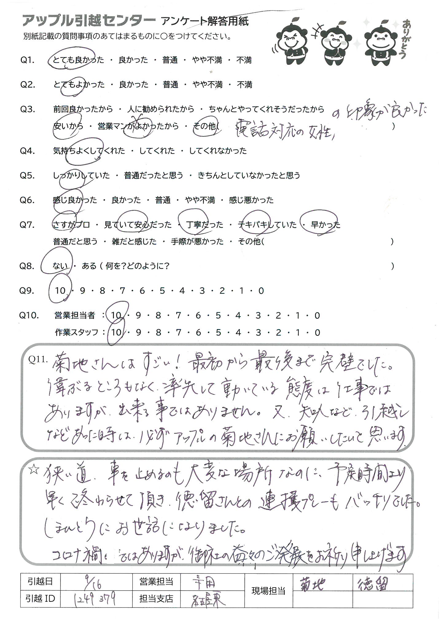 A.菊池さんはすごい!最初から最後まで完璧でした。 偉ぶるところもなく、率先して動いている態度は仕事ではありますが、出来る事ではありません。又、知人など引越しなどあった時は、必ずアップルの菊池さんにお願いしたいと思います。
