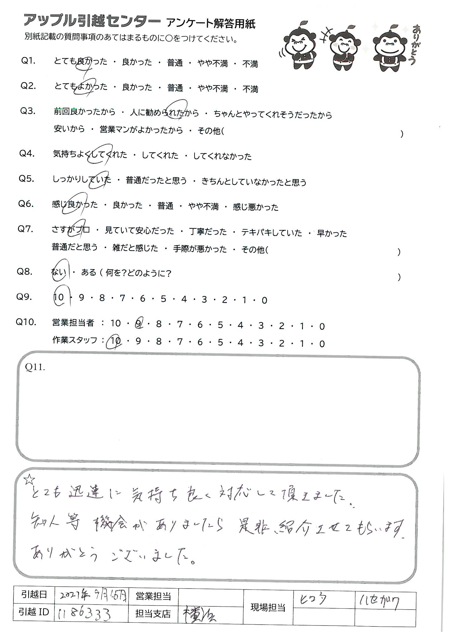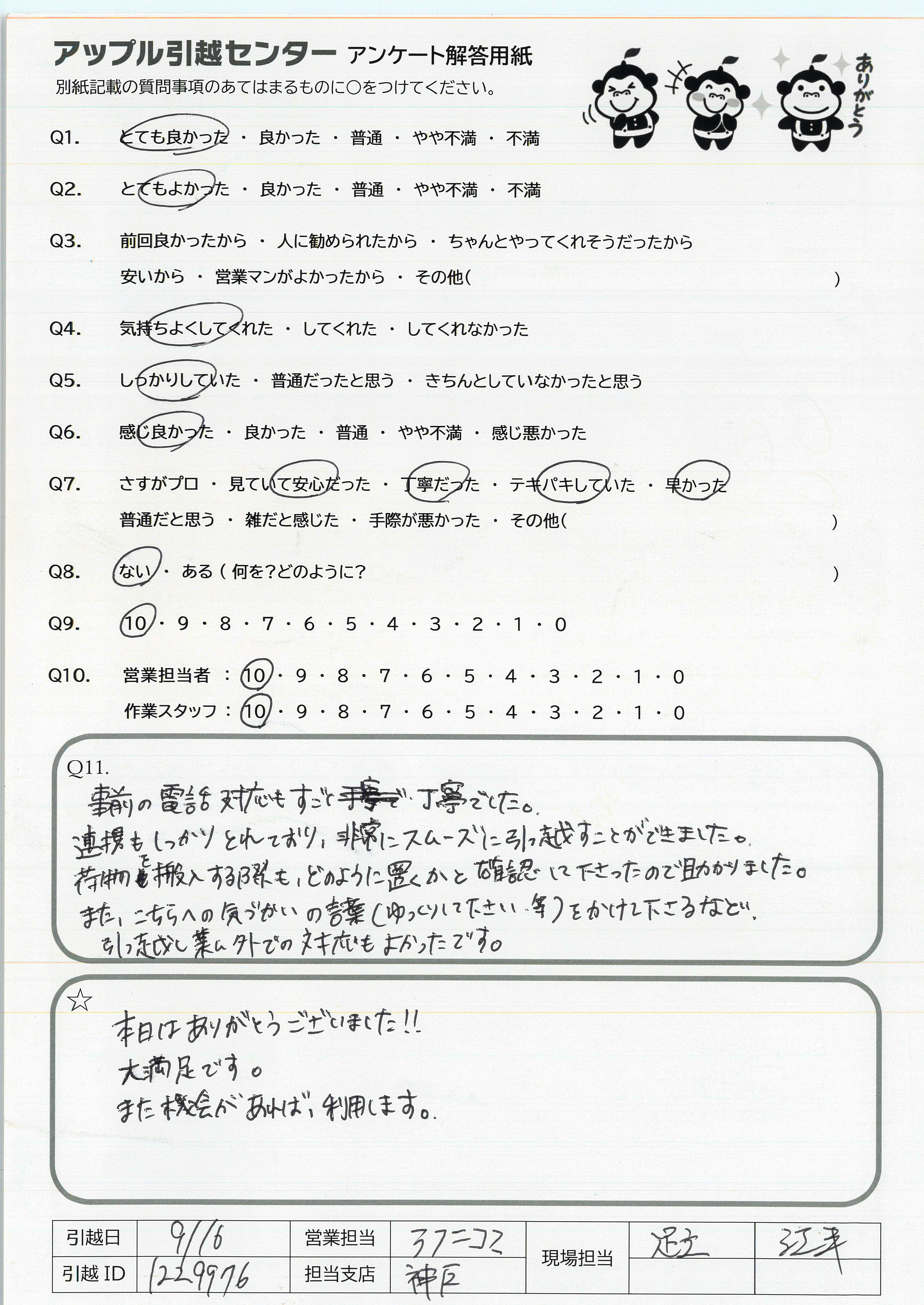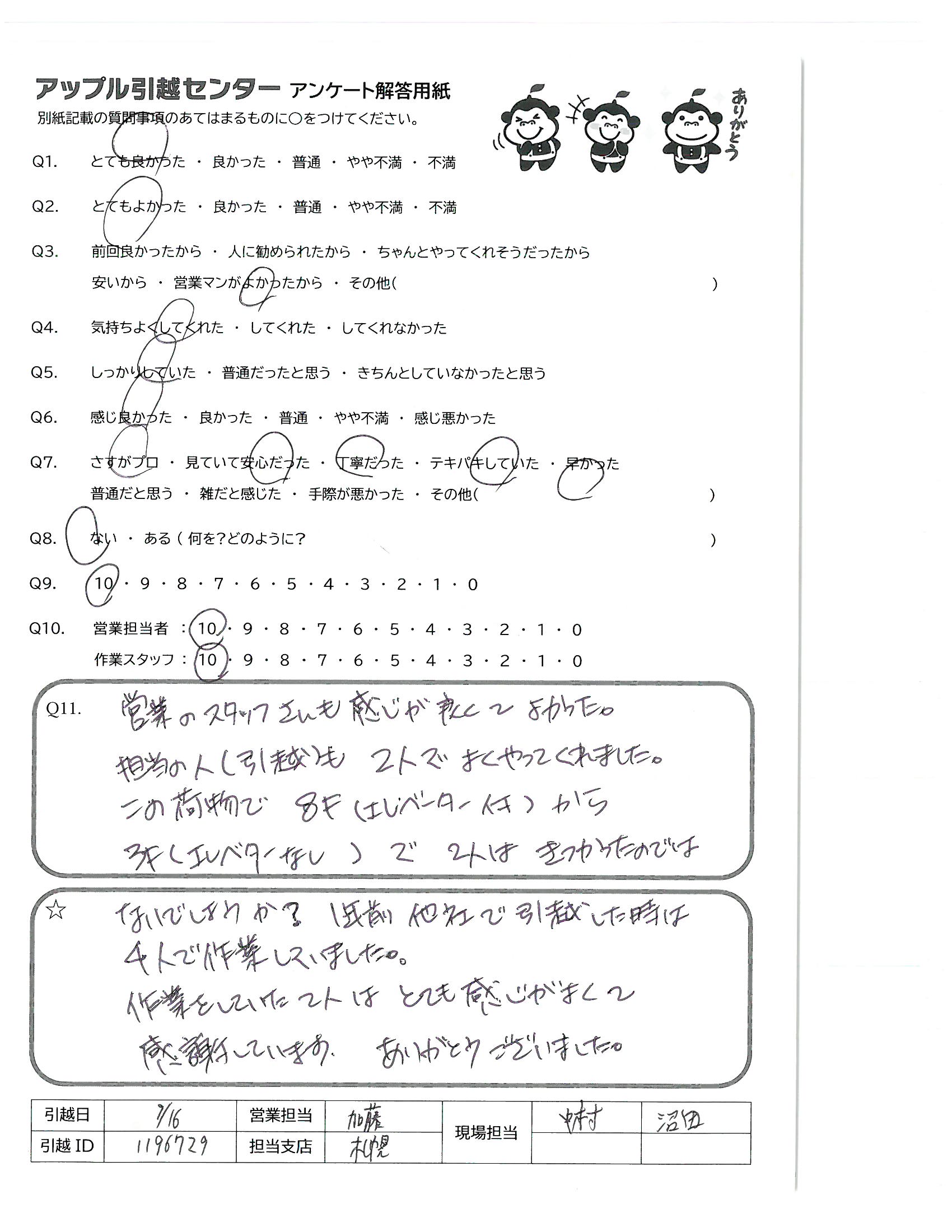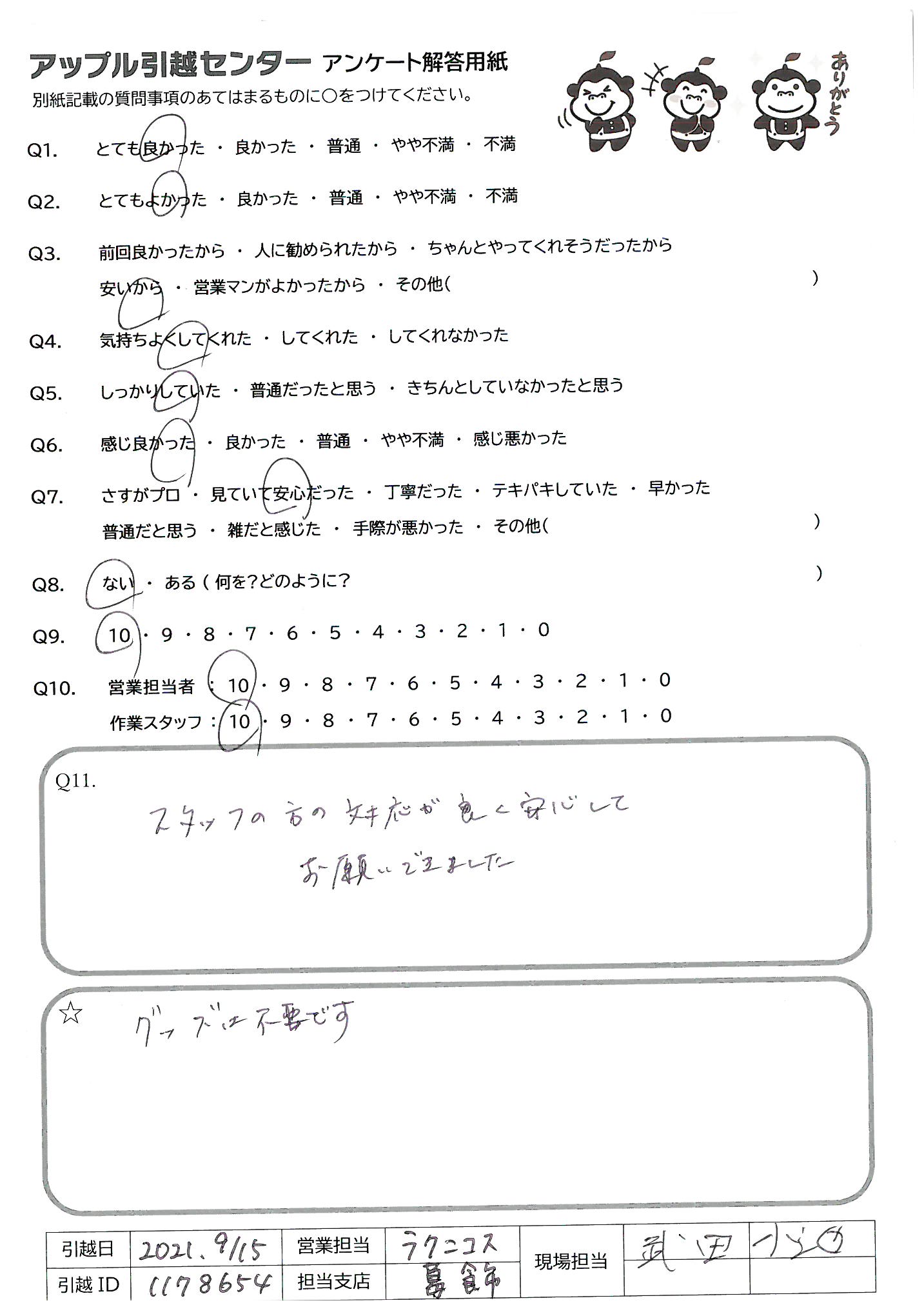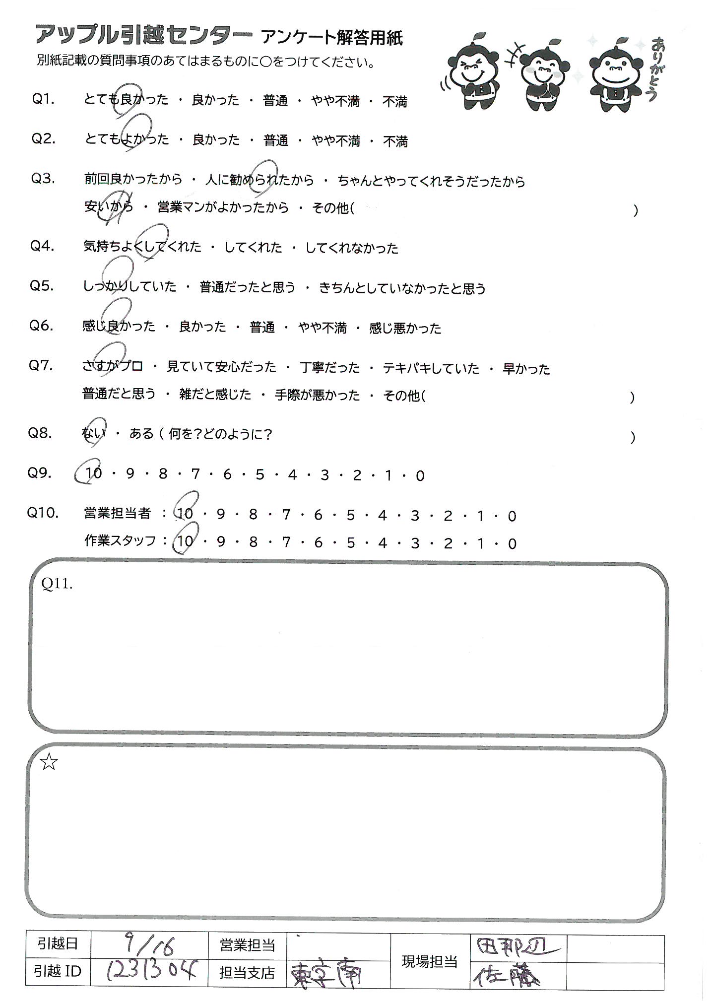 A.菊池さんはすごい!最初から最後まで完璧でした。 偉ぶるところもなく、率先して動いている態度は仕事ではありますが、出来る事ではありません。又、知人など引越しなどあった時は、必ずアップルの菊池さんにお願いしたいと思います。