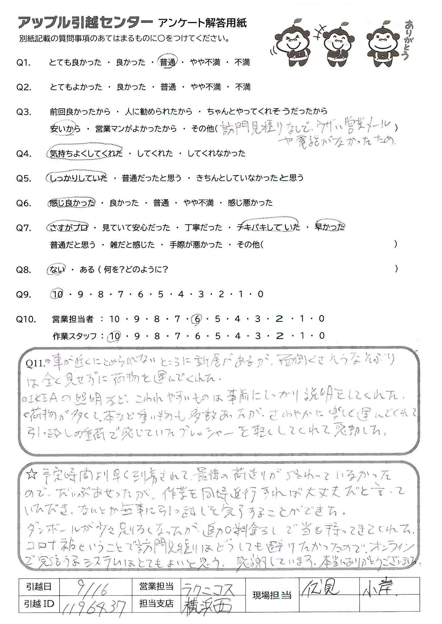 A.予定時間より早く到着されて、最後の荷造りが終わっていなかったので、だいぶあせったが、作業を同時進行すれば大丈夫だと言っていただき、なんとか無事に引っ越しを完了することができた。 ダンボールが少々足りなくなったが、追加料金なしで当日持ってきてくれた。 コロナ禍ということで訪門見積りはどうしても避けたかったので、オンラインで完了するシステムはとてもよいと思う。感謝しています。本当にありがとうございました。