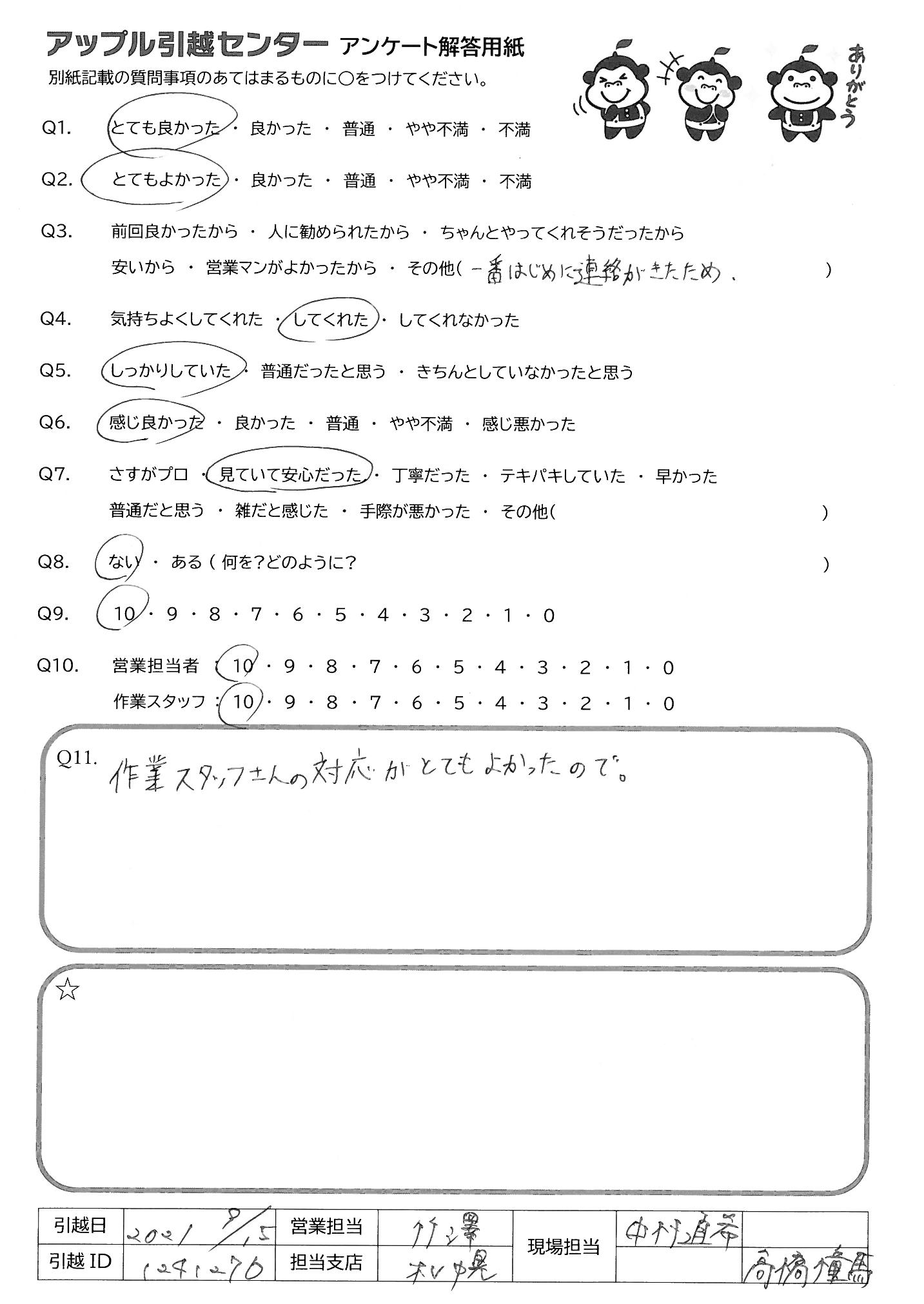 A.せまい道、車を止めるのも大変な場所なのに、予定時間より早く終わらせて頂き、徳留さんとの連携プレーもバッチリでした。 ほんとにお世話になりました。 コロナ禍はありますが、御社の益々のご発展をお祈り申し上げます。