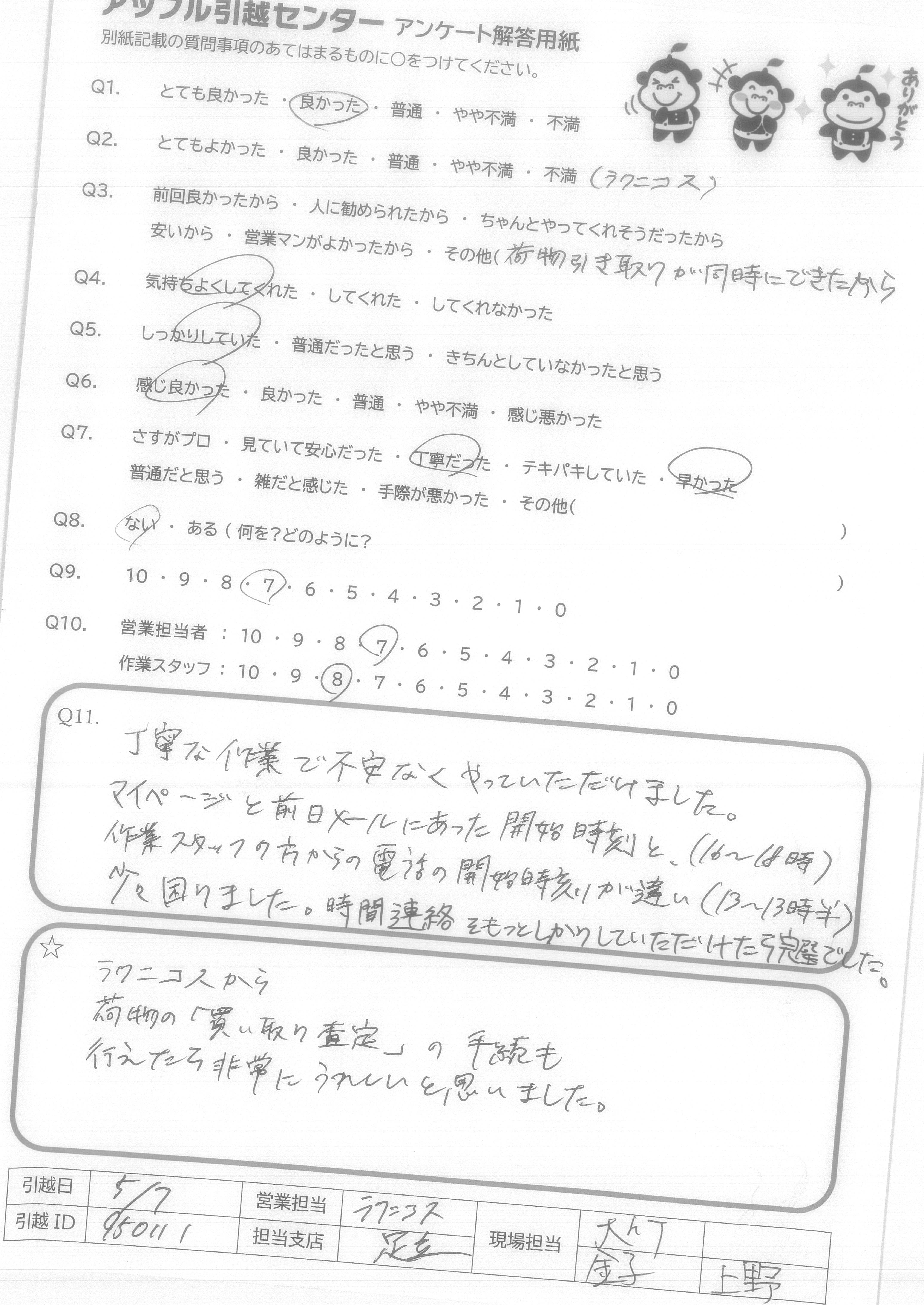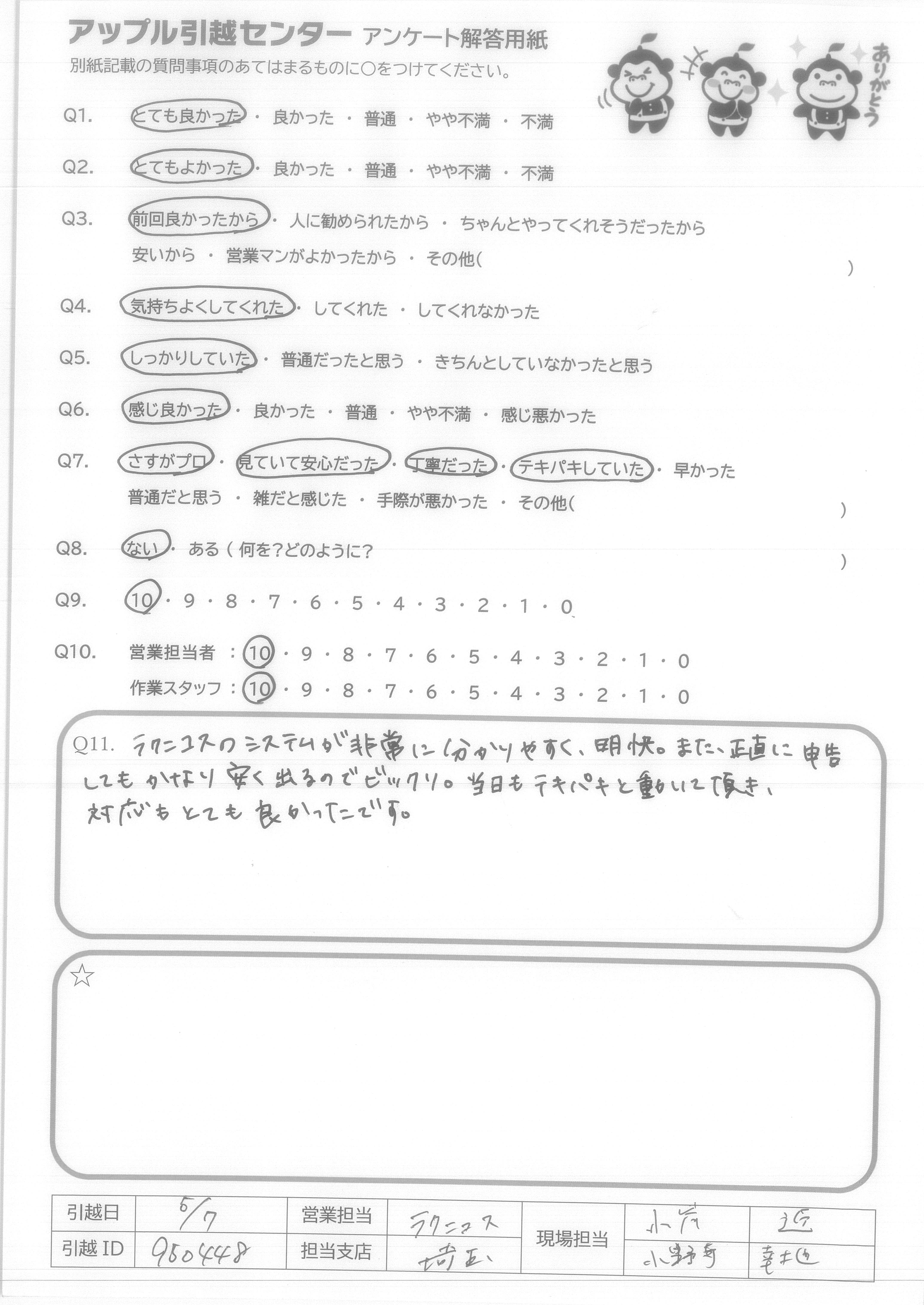 A.今まで何度も引越ししたが、その中で一番安かったです。 次回又、期会があれば、絶対御社を選びます。 知人にもすすめたいと思います。 ありがとうございました。
