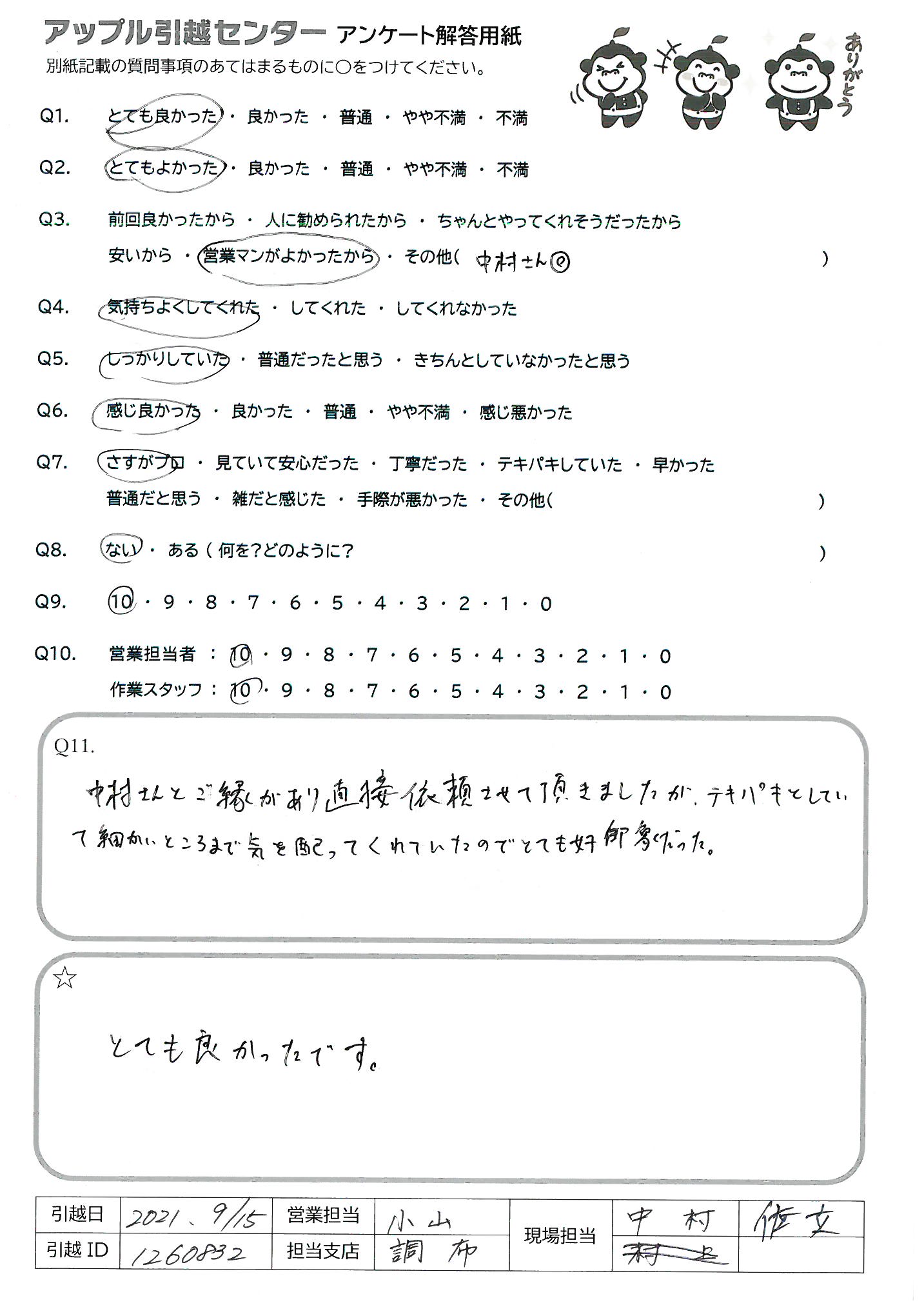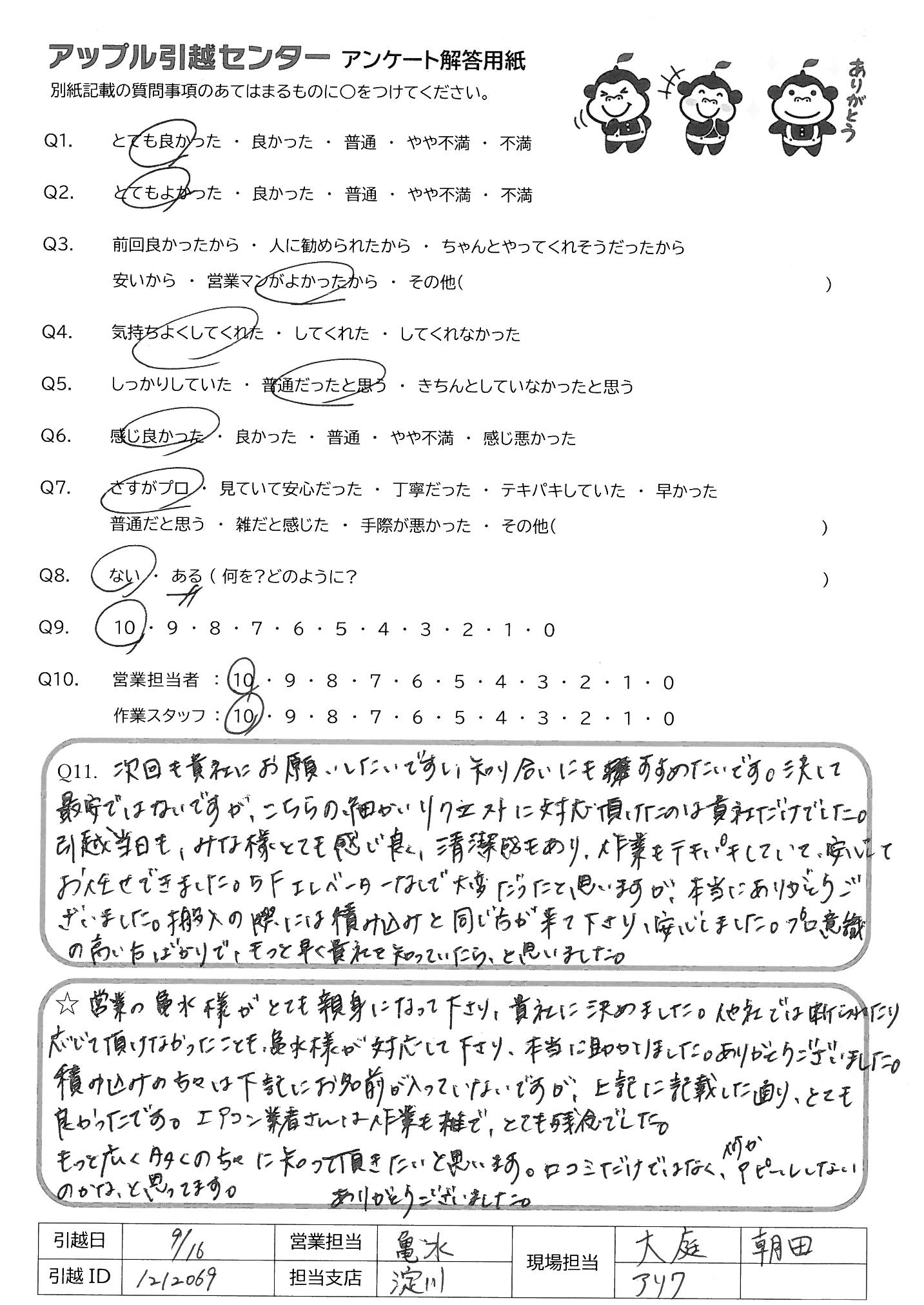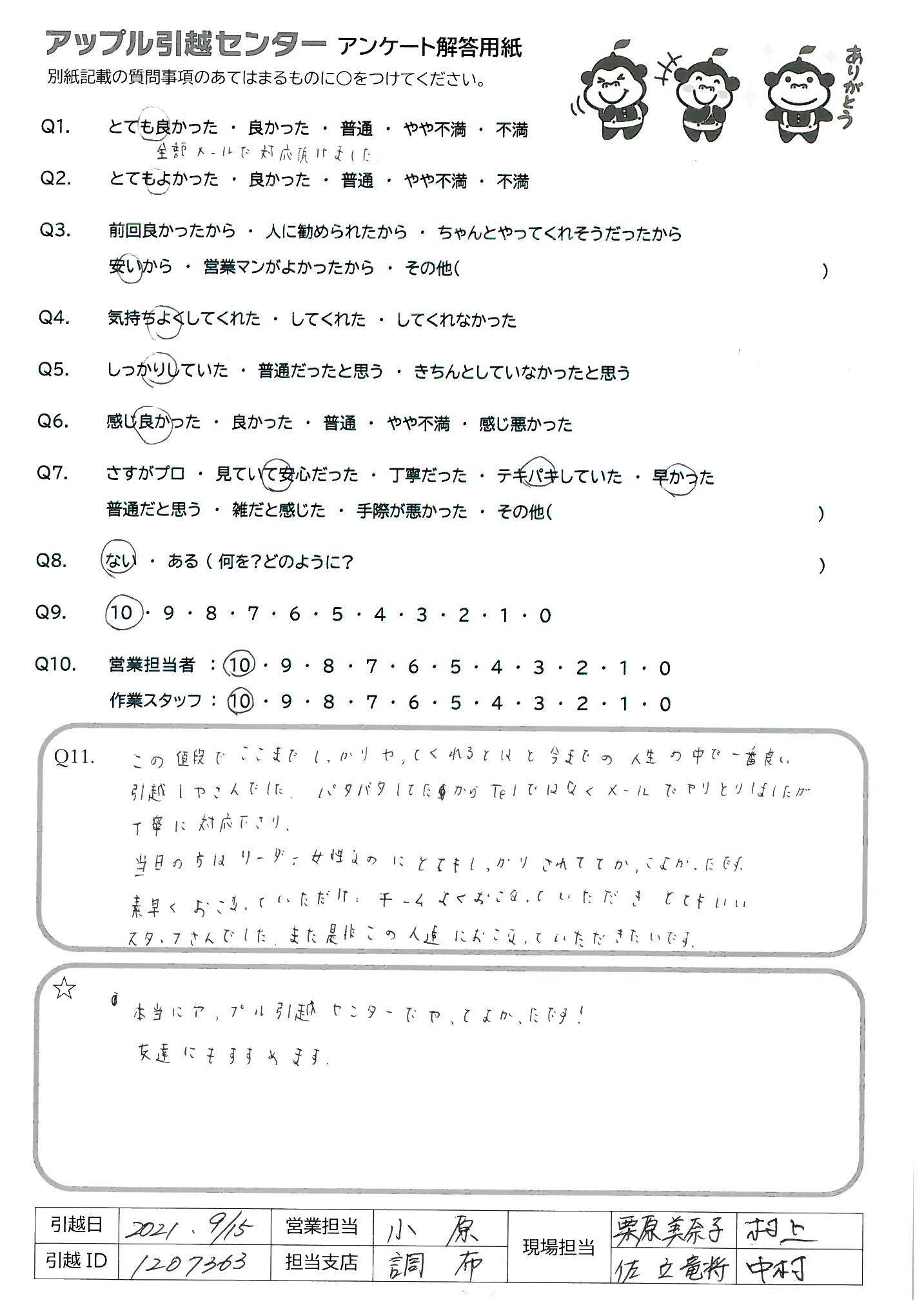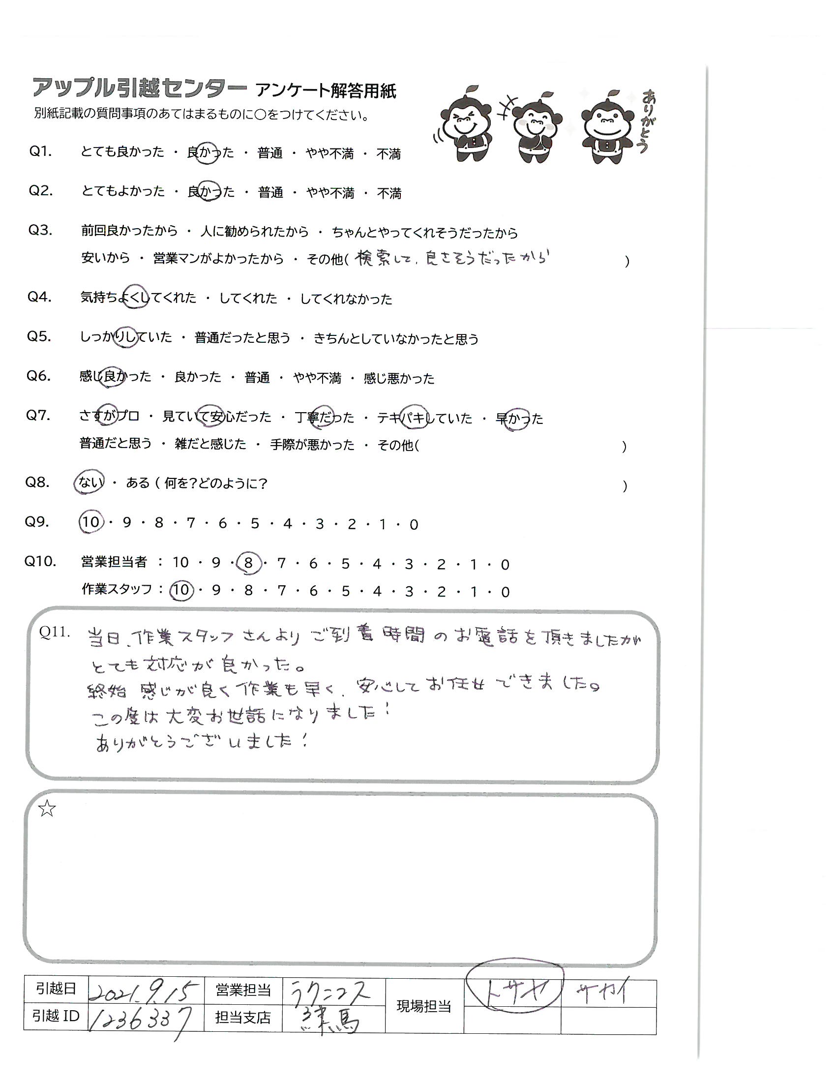 A.本当にアップル引越センターでやってよかったです。 友達にもすすめます。