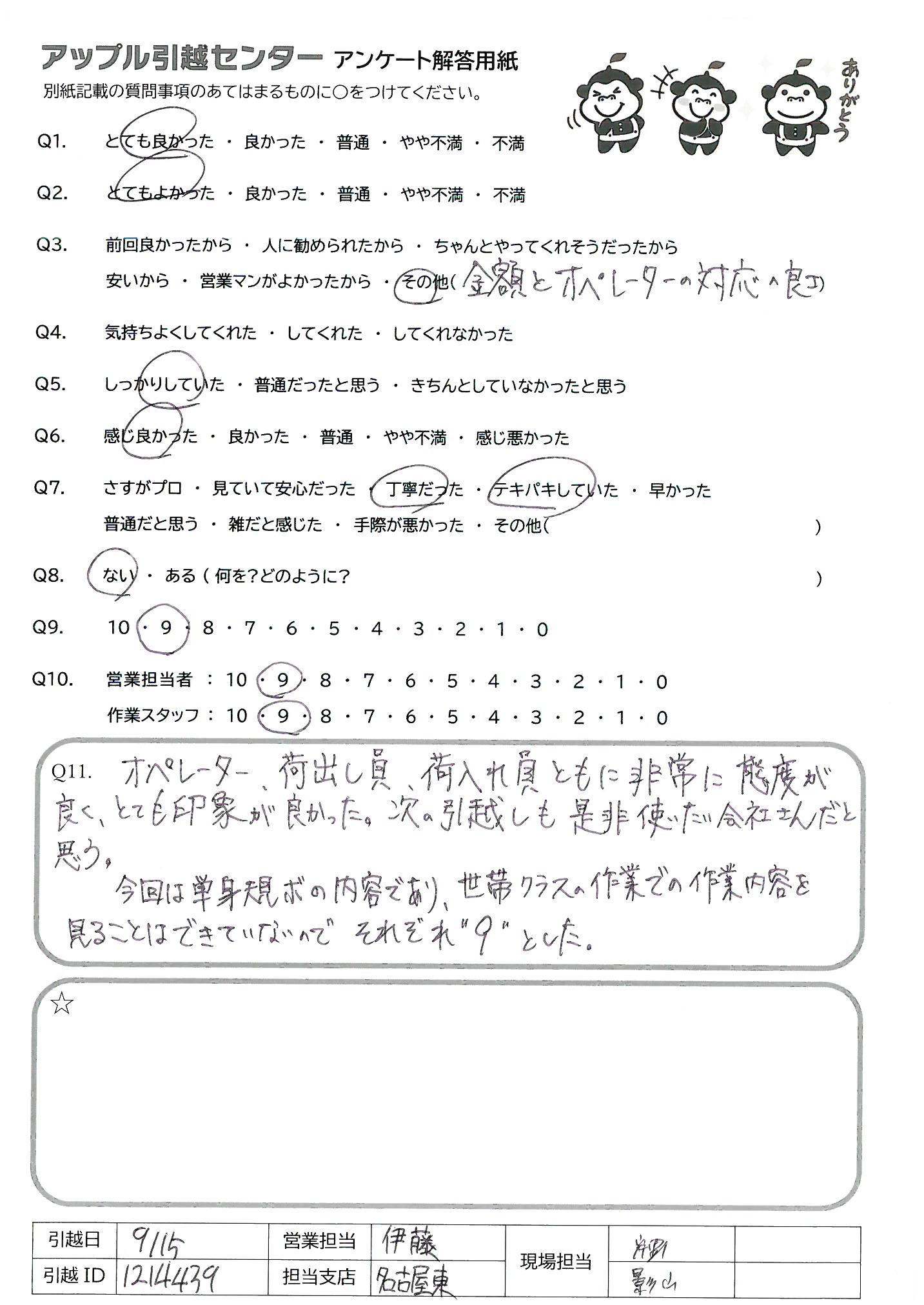 A.オペレーター、荷出し員、荷入れ員ともに非常に態度が良く、とても印象が良かった。次の引越しも是非使いたい会社さんだと思う。今回は単身規ボの内容であり、世帯クラスの作業での作業内容を見ることはできていないのでそれぞれ”9”とした。