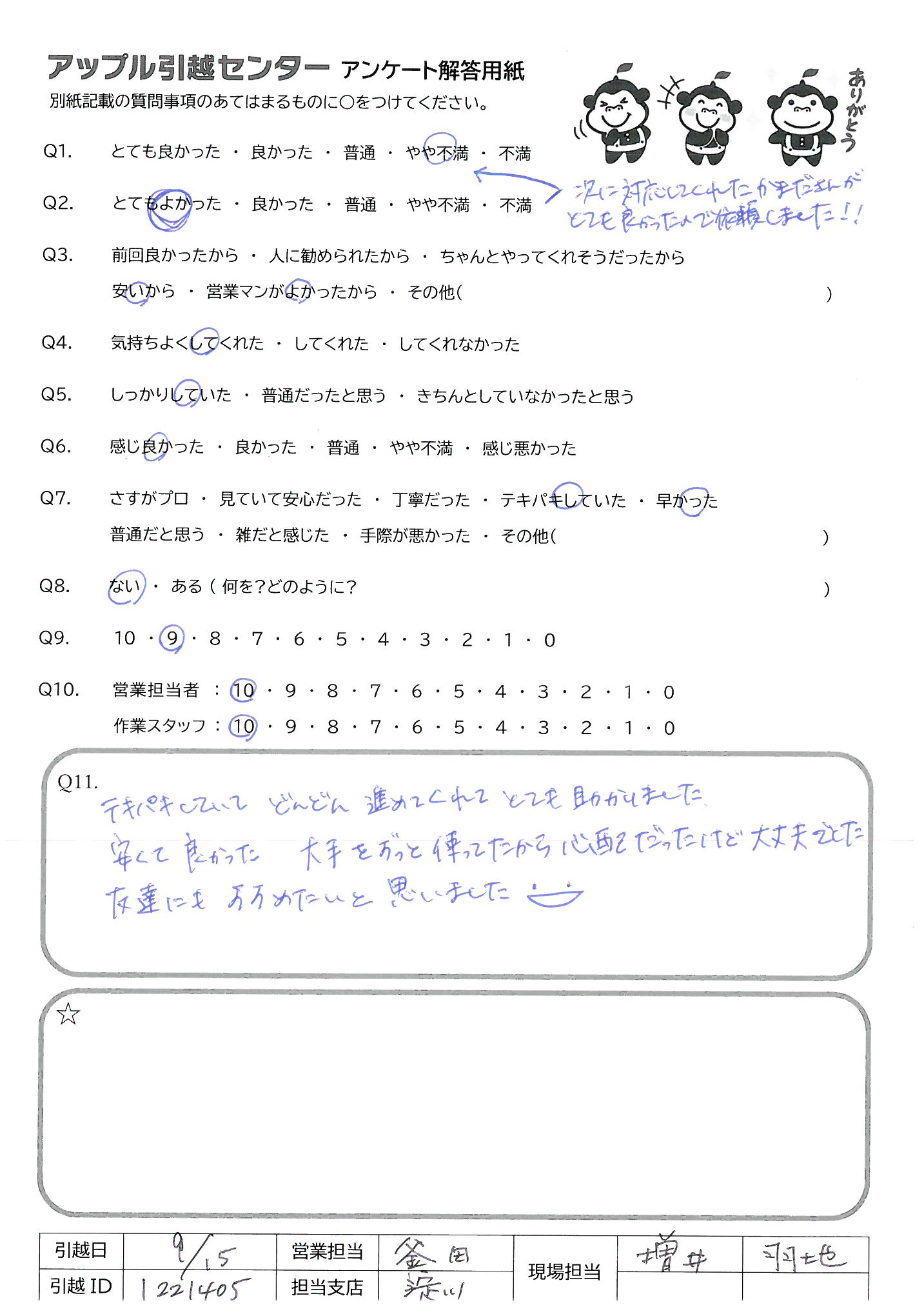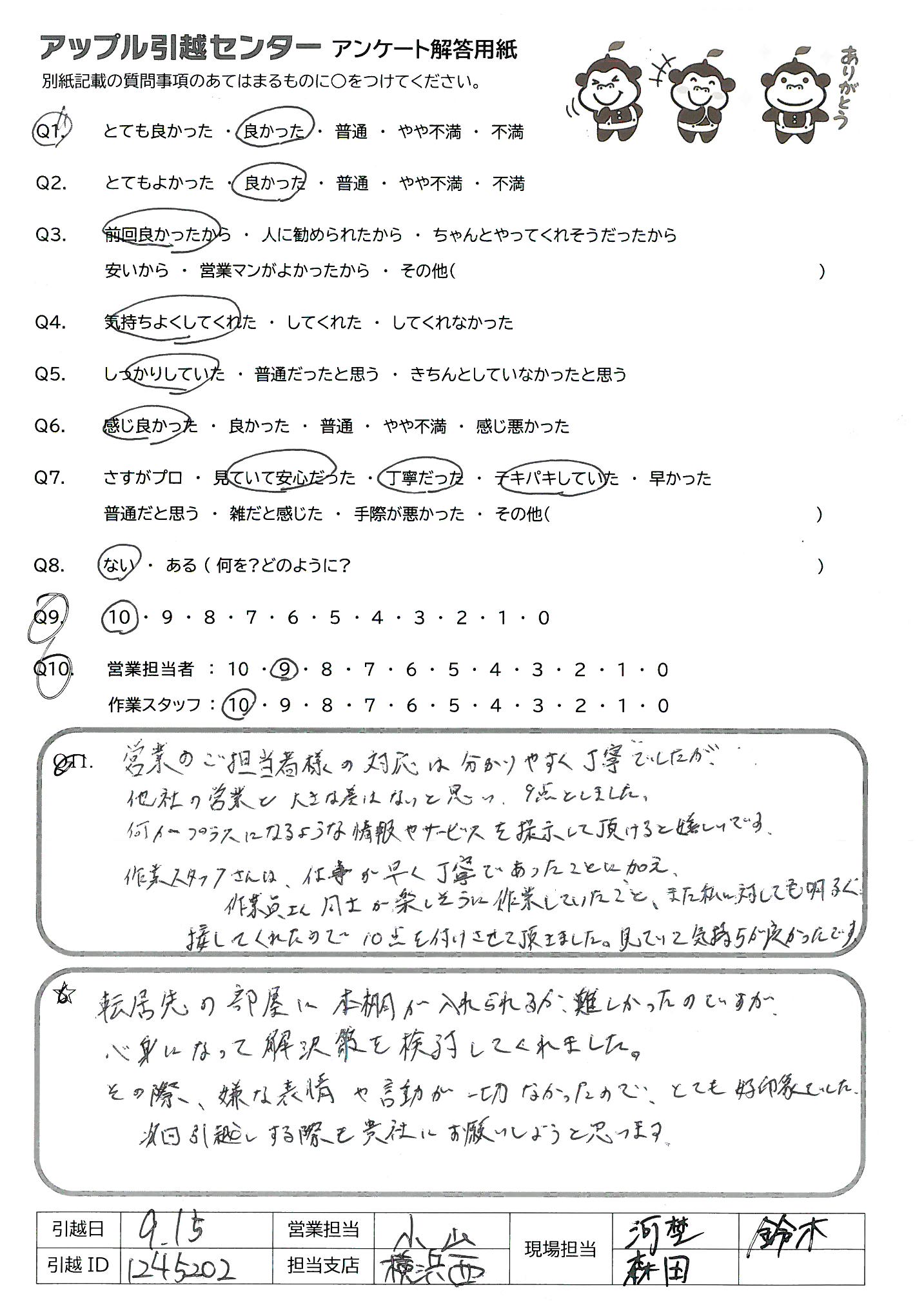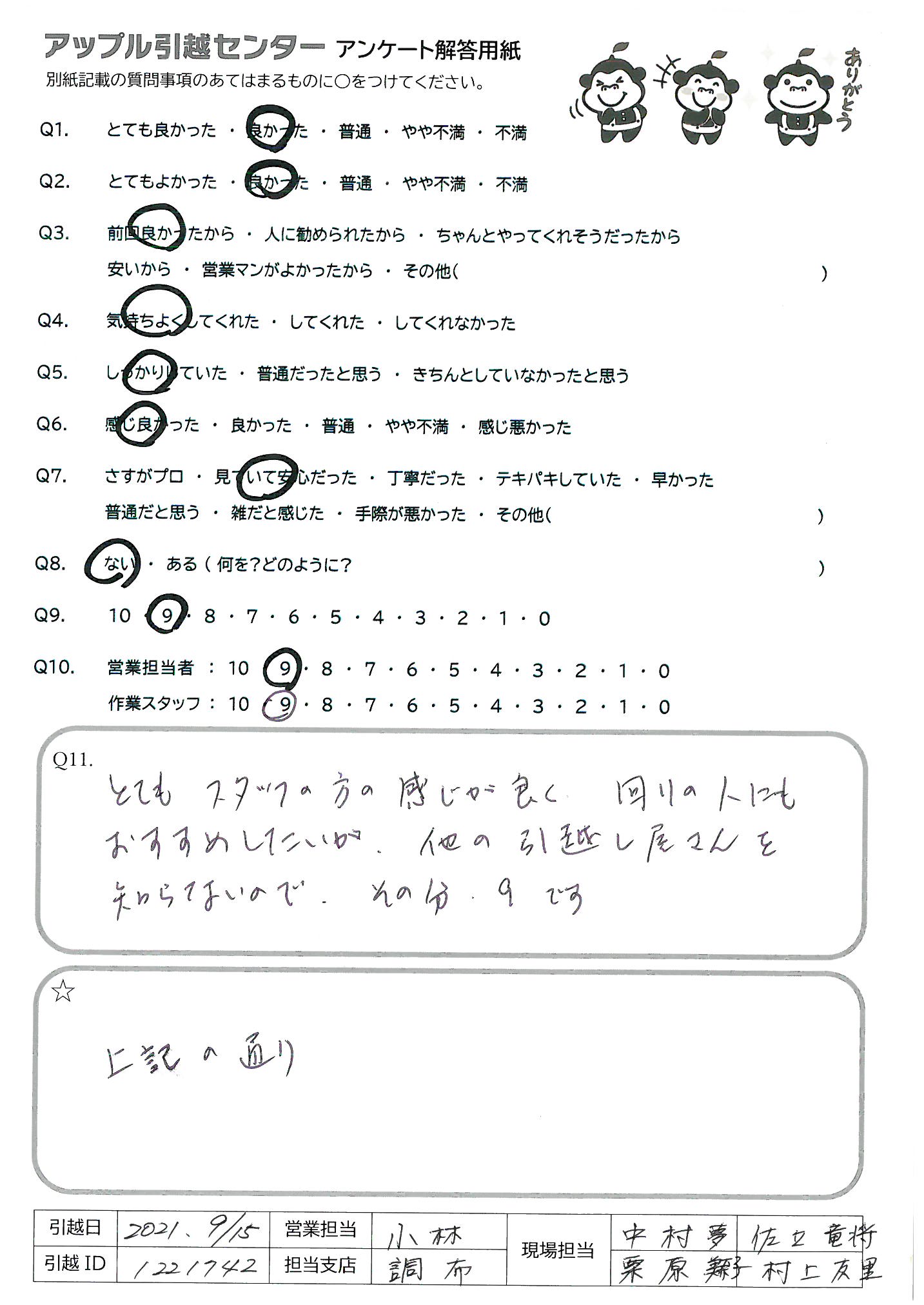 A.とてもスタッフの方の感じが良く、回りの人にもおすすめしたいが、他の引越し屋さんを知らないので、その分9です。