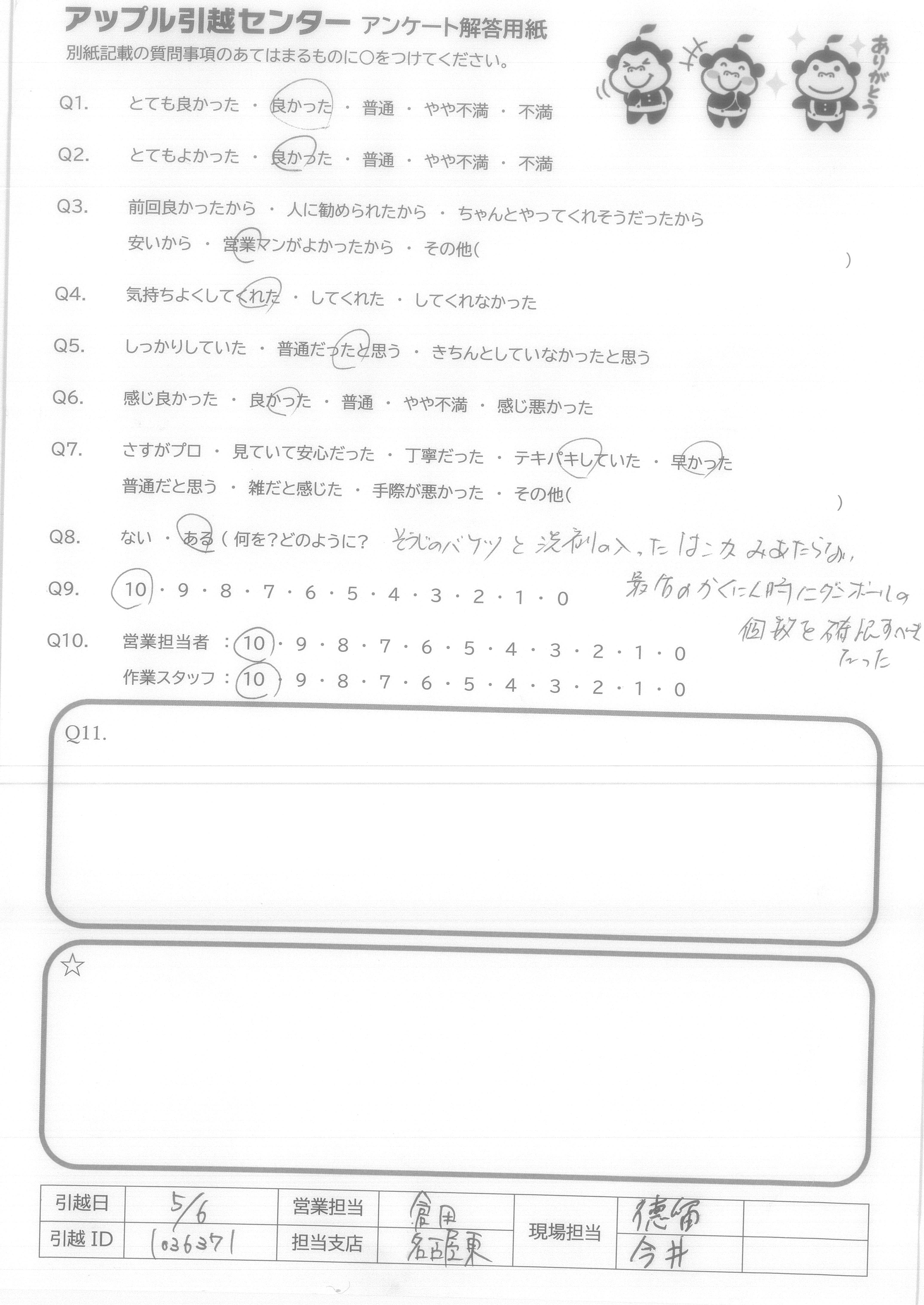 A.応対も丁寧で感じが良かったです。こちらのお願いにも快く受けて下さり、次の引っ越しがあってもお願いしたいと思います。