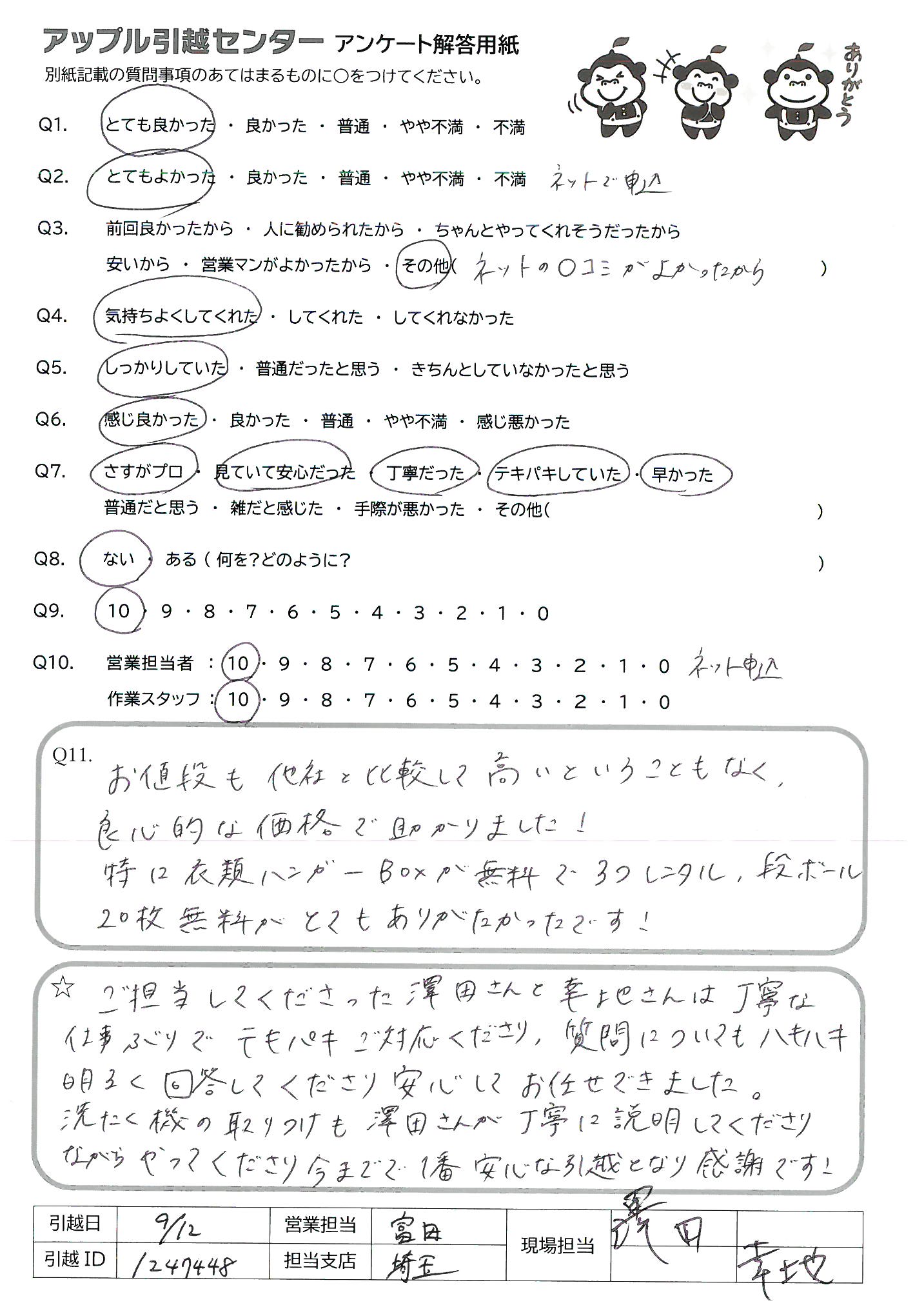 A.ご担当してくださった澤田さんと幸地さんは丁寧な仕事ぶりでテキパキご対応くださり、質問についてもハキハキ明るく回答してくださり安心してお任せできました。 洗たく機の取りつけも澤田さんが丁寧に説明してくださりながらやってくださり今まで1番安心な引越となり感謝です!