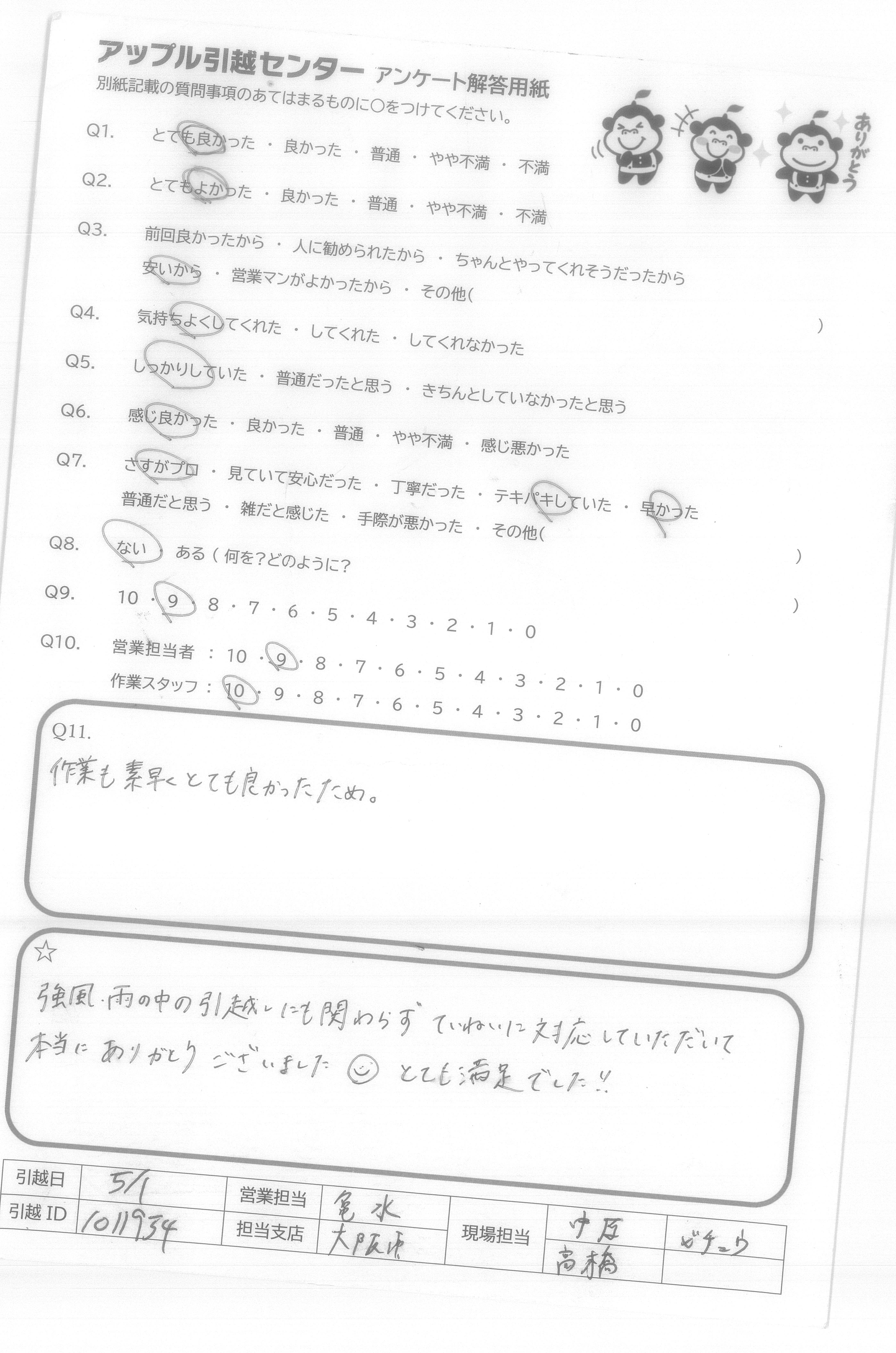 引越し日:2021年04月30日 エリア:大阪府東大阪市