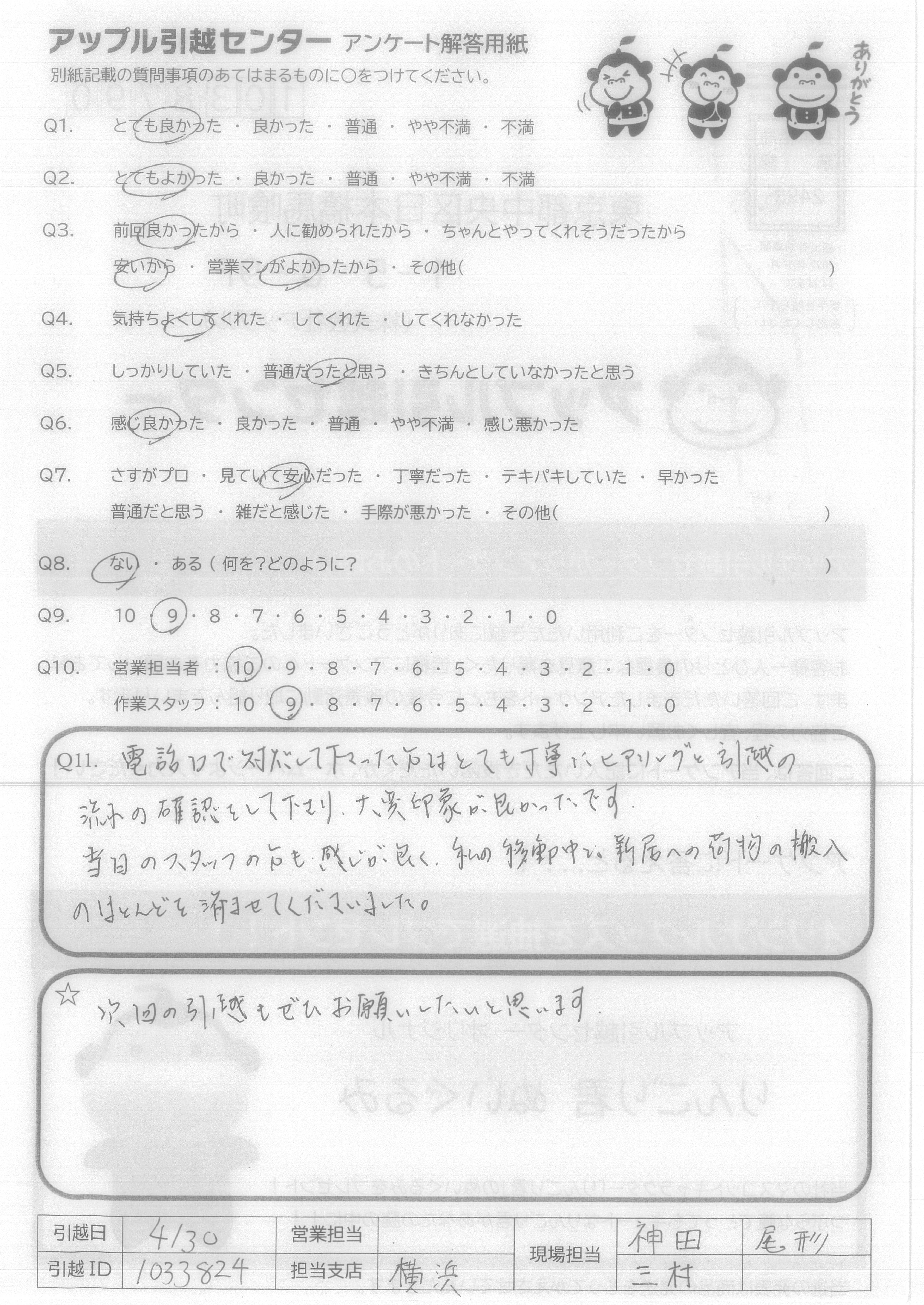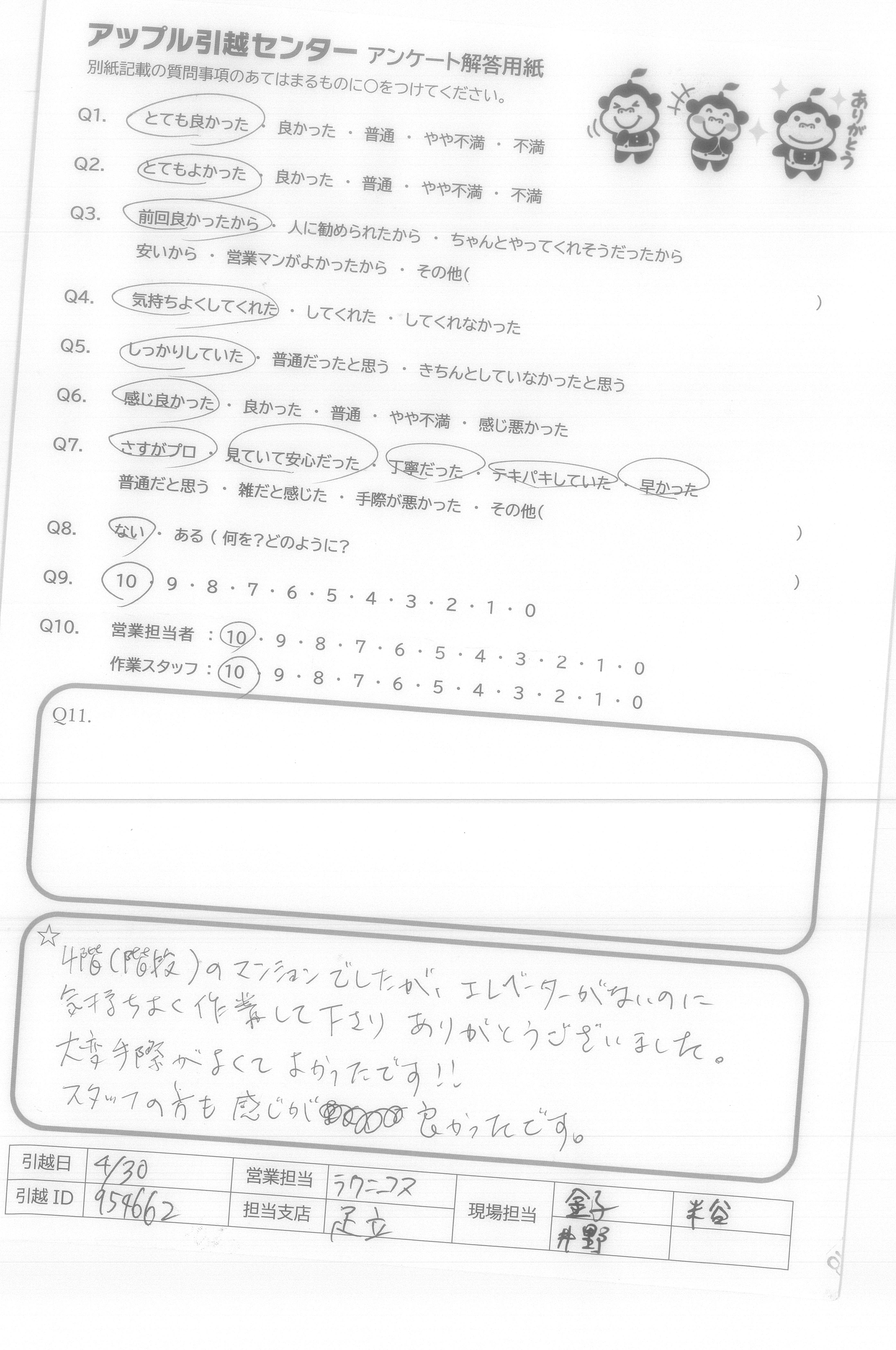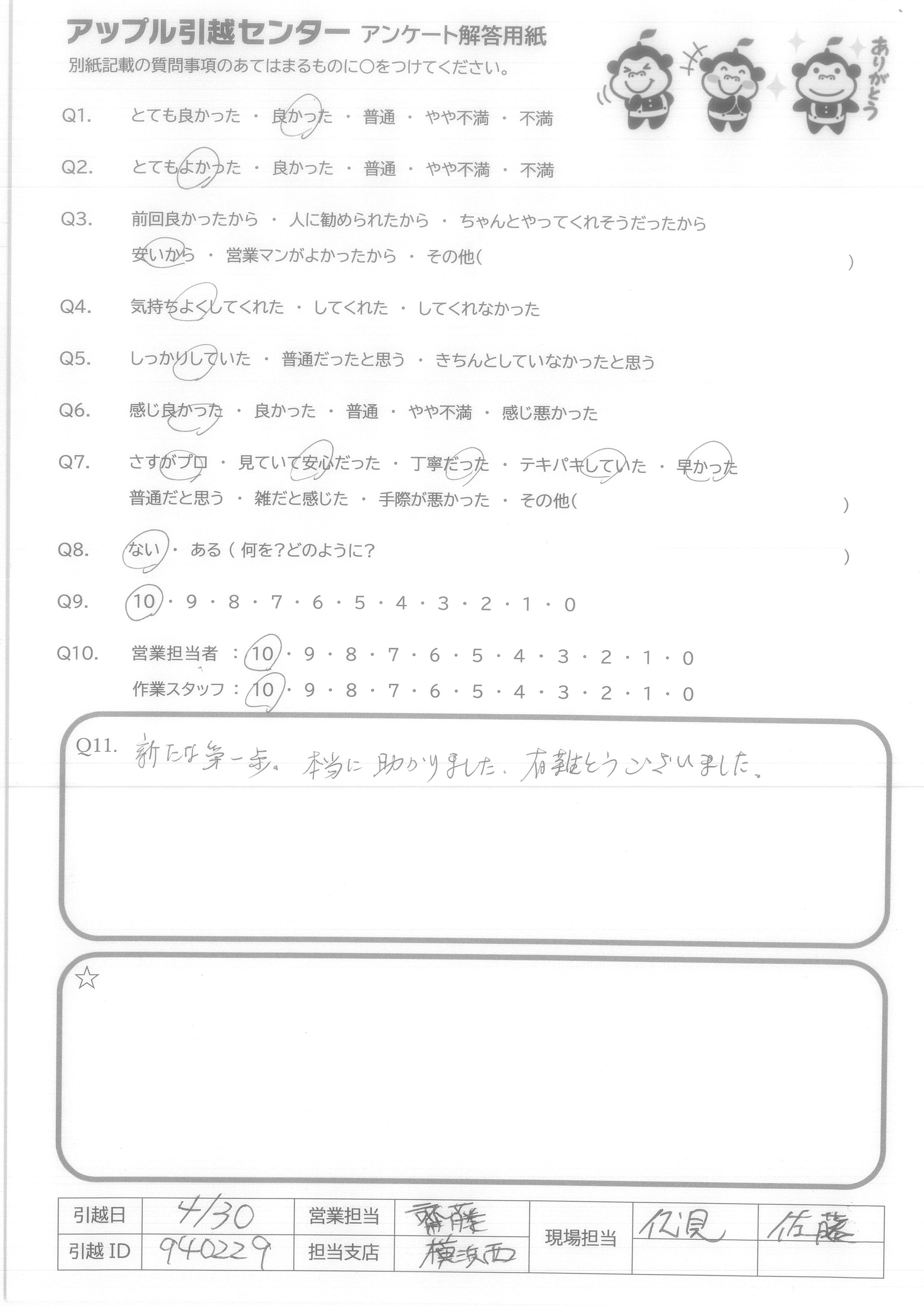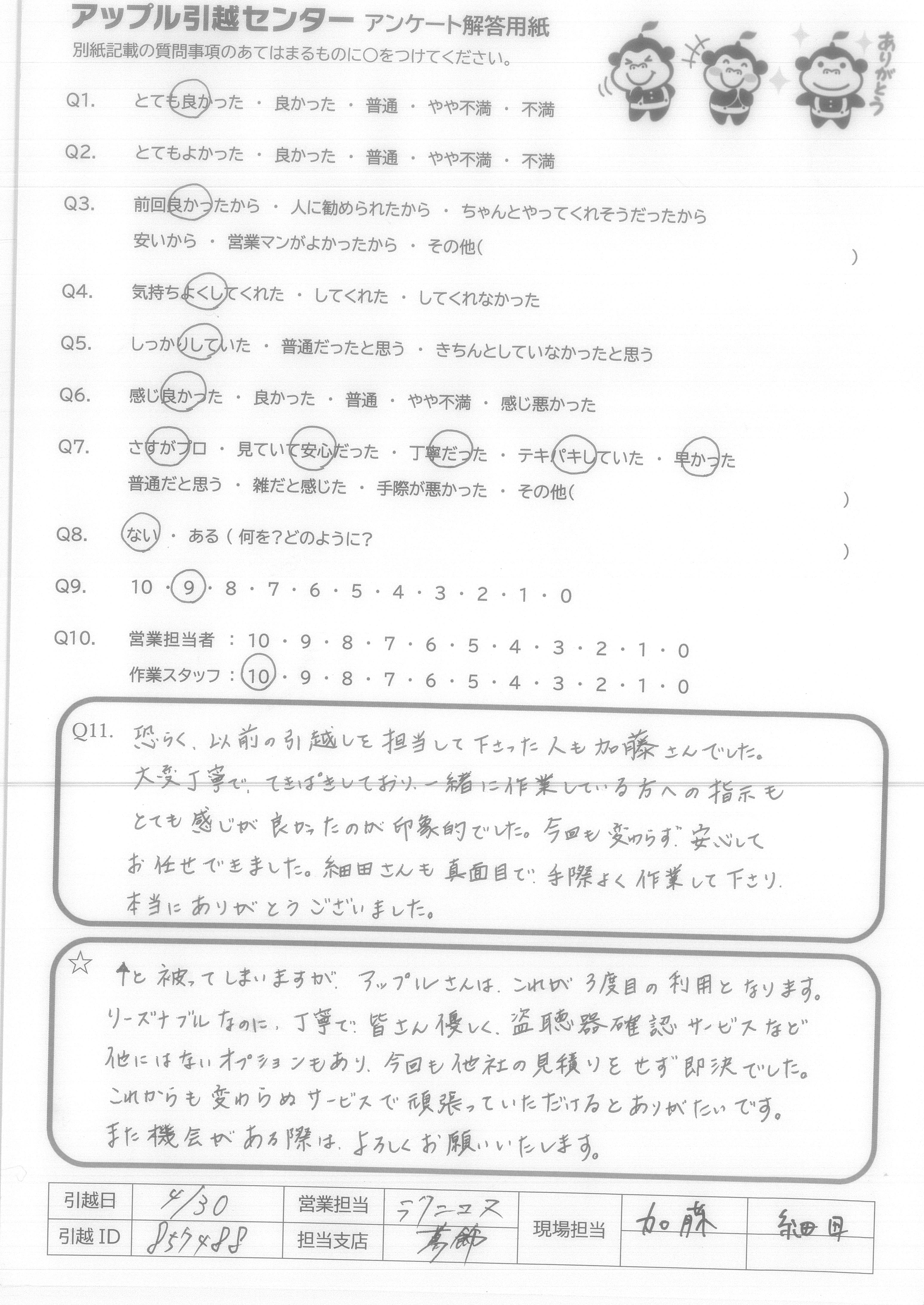 A.スタッフ4人のチームワークが良く仕事になれた方達と思いました 家具の置場までアドバイスして下さいました。 夜間遅くまでの時間を皆さんとても親切で作業して下さり感謝しております お世話になりました。4/30
