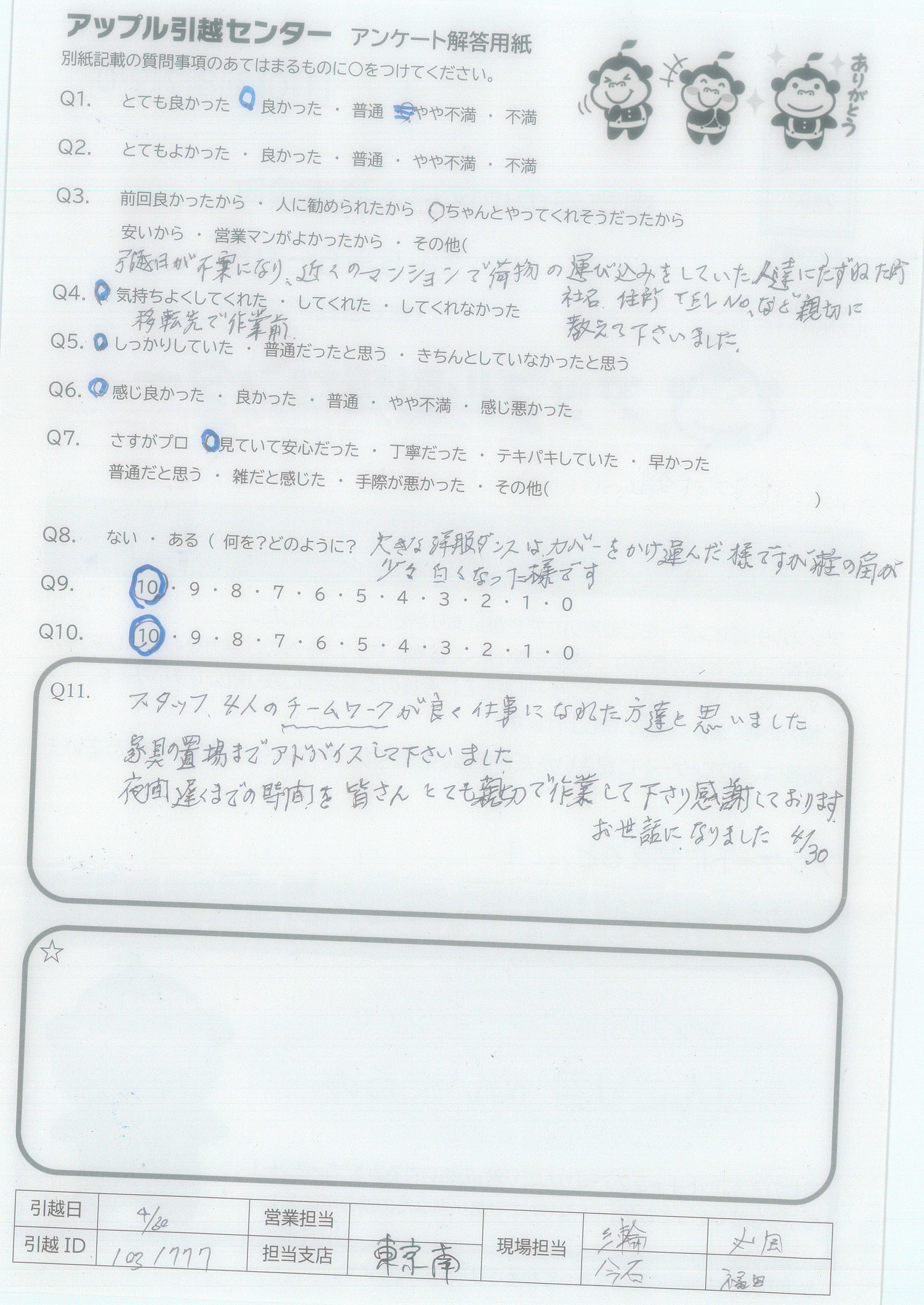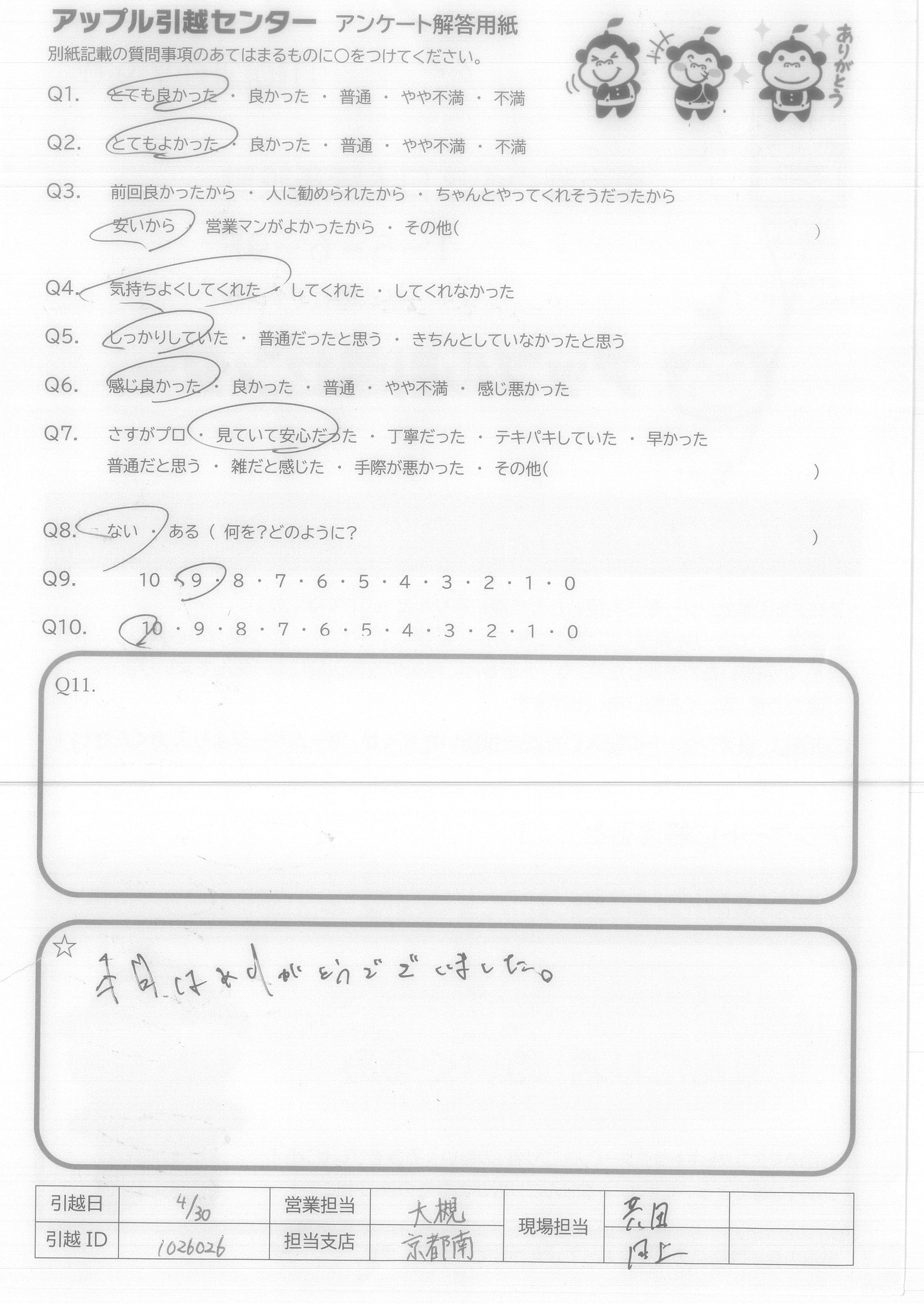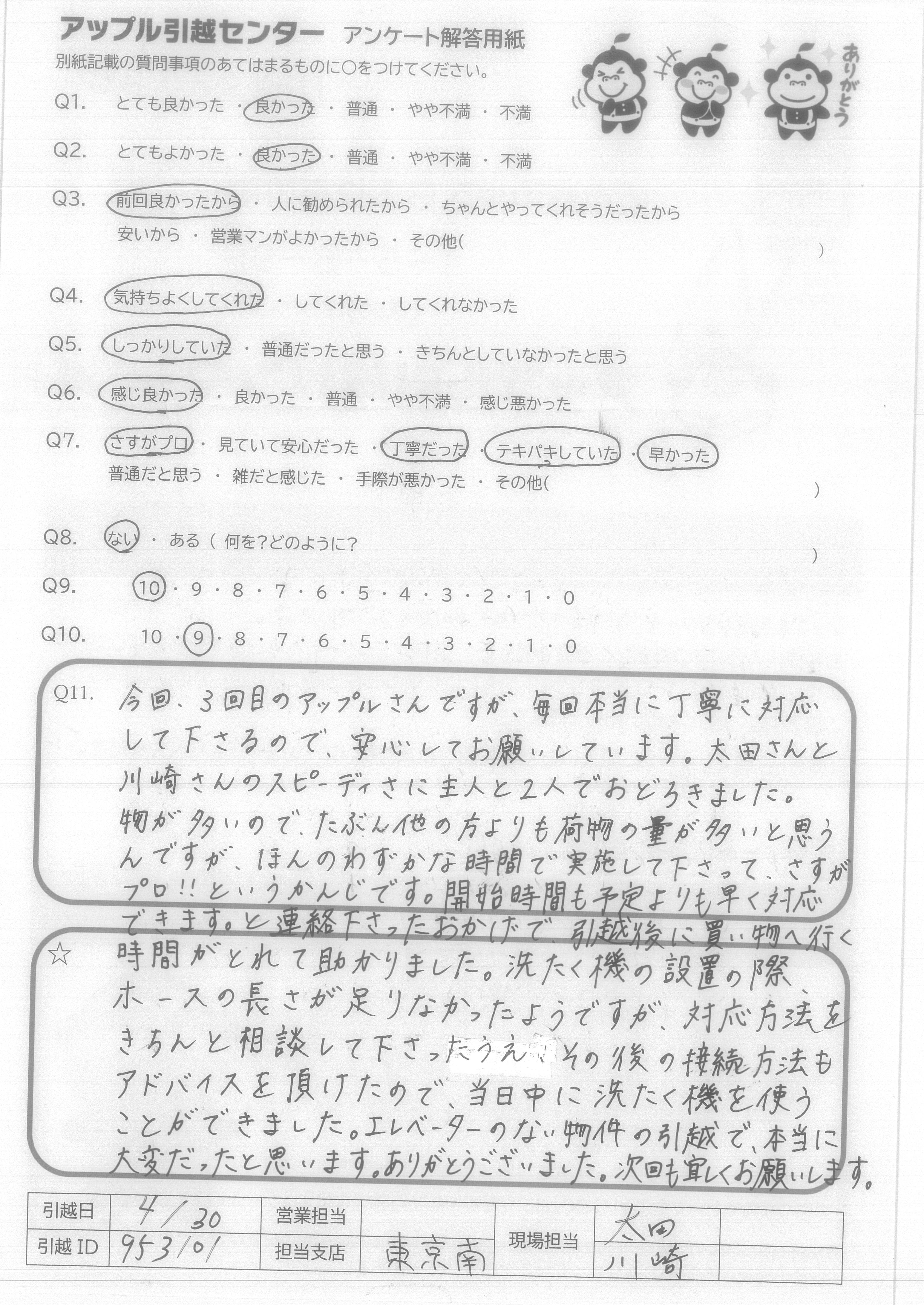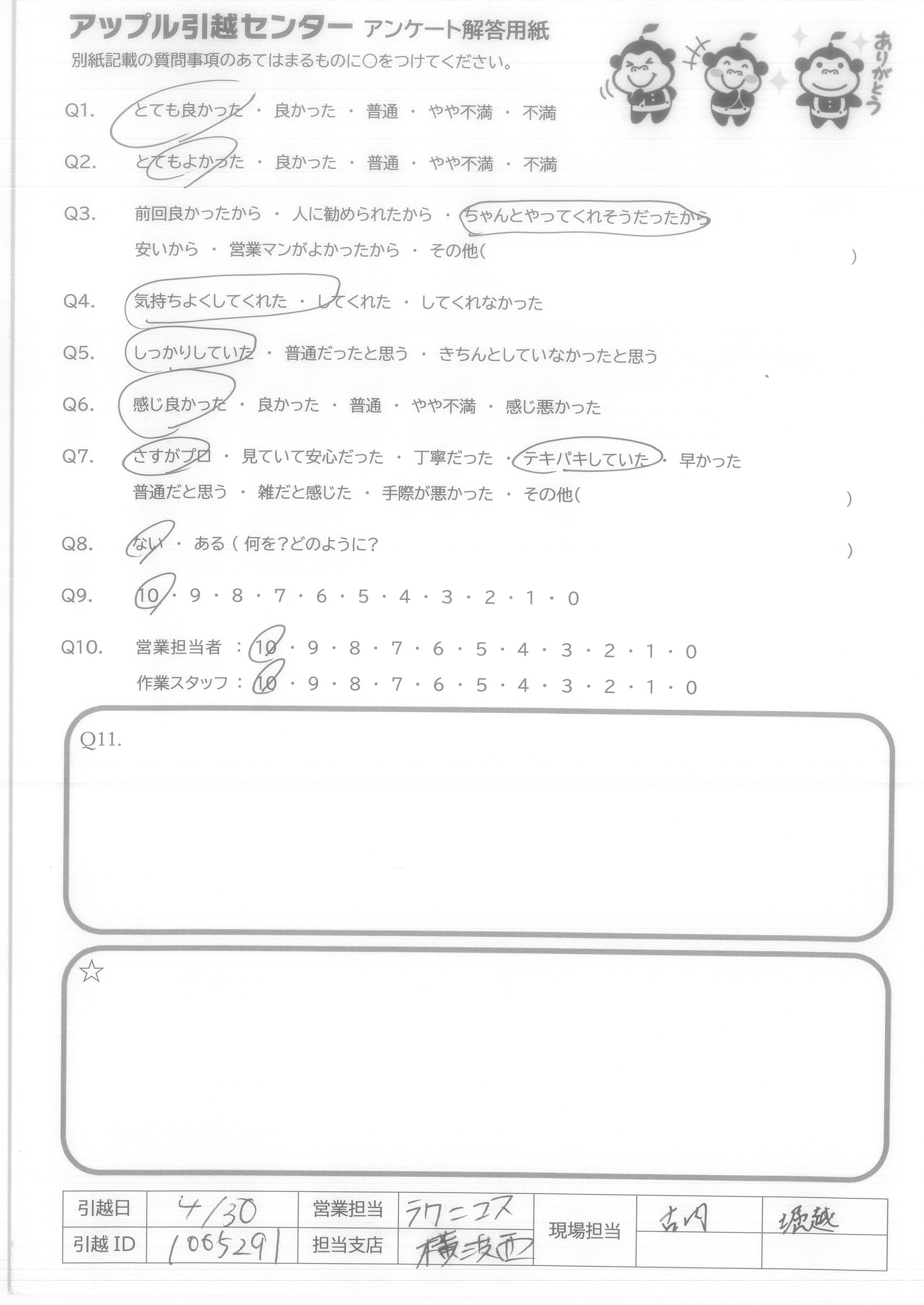 A.スタッフ4人のチームワークが良く仕事になれた方達と思いました 家具の置場までアドバイスして下さいました。 夜間遅くまでの時間を皆さんとても親切で作業して下さり感謝しております お世話になりました。4/30