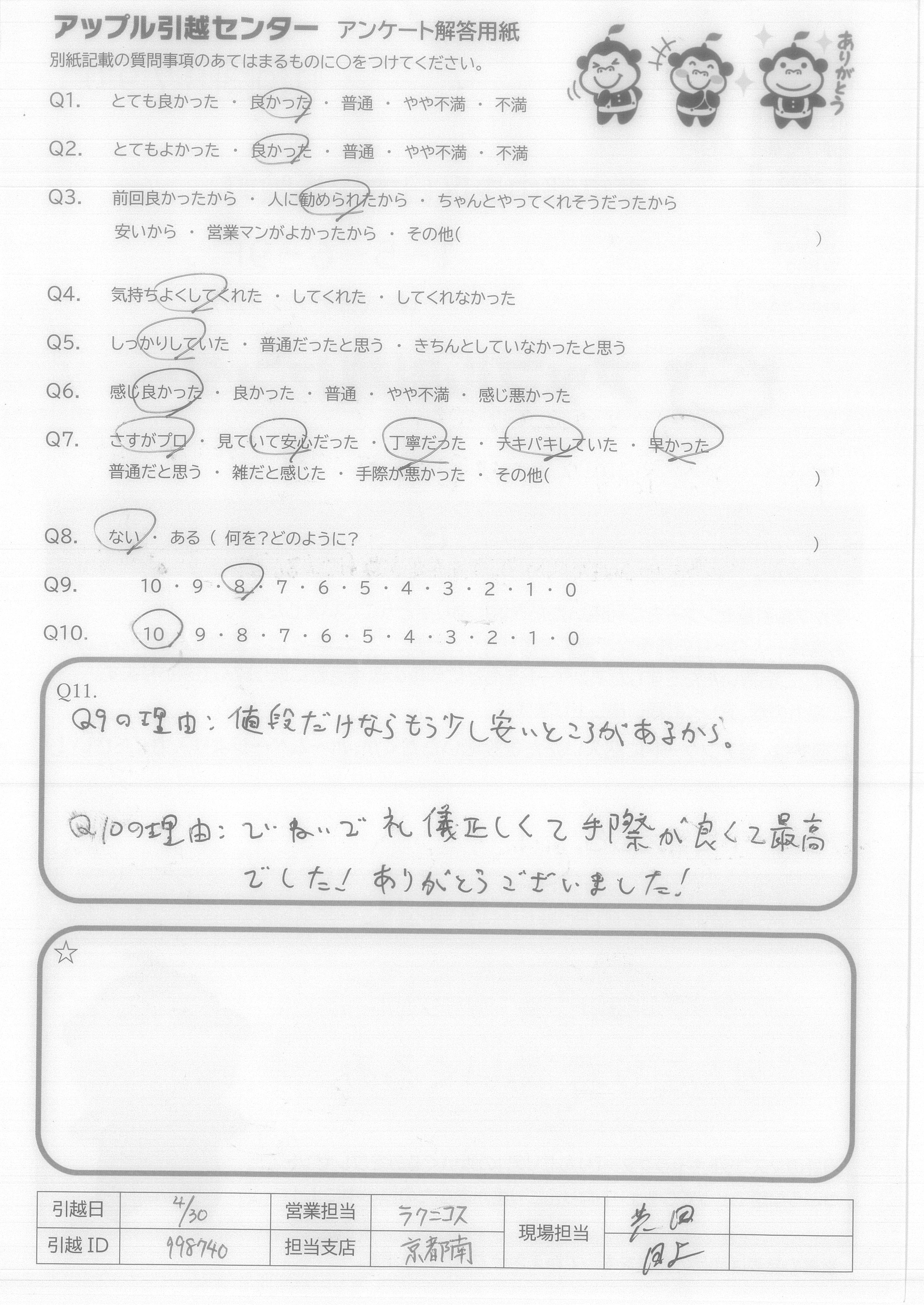 A.Q9の理由:値段だけならもう少し安いところがあるから。 Q10の理由:ていねいで礼儀正しくて手際が良くて最高でした!ありがとうございました!