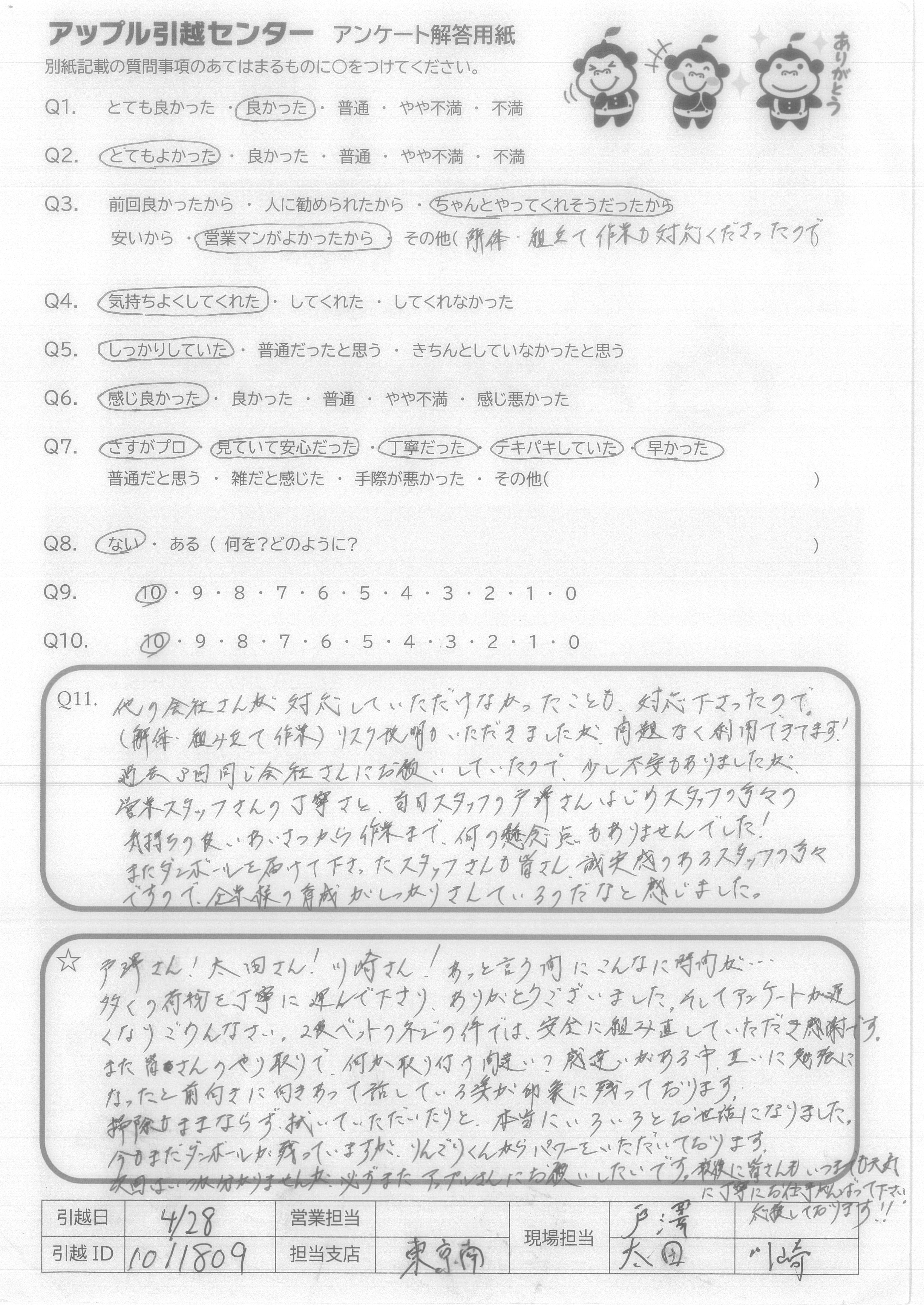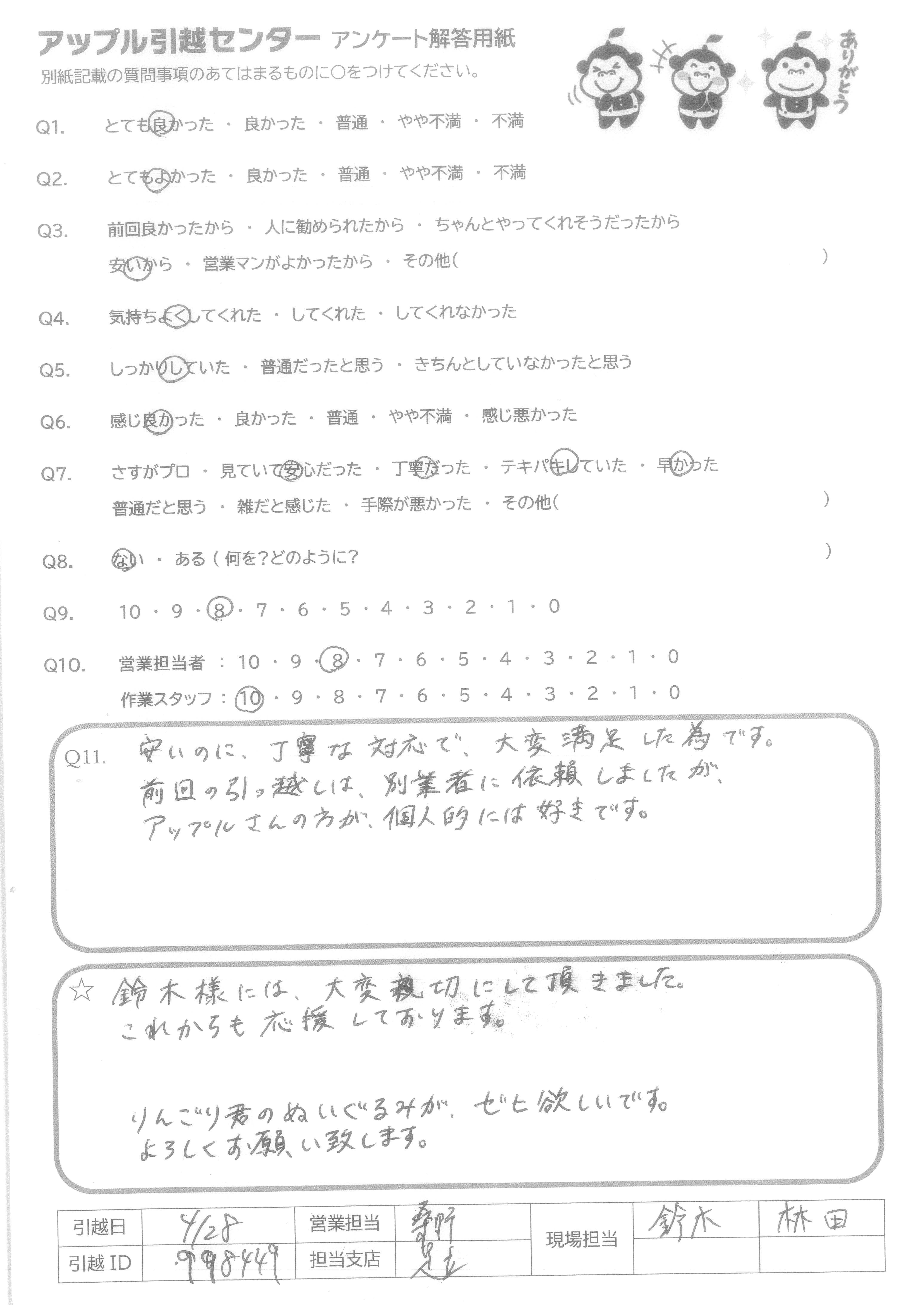 A.戸澤さん!太田さん!川崎さん!あっと言う間にこんなに時間が・・・ 多くの荷物を丁寧に運んで下さりありがとうございました。そしてアンケートが遅くなりごめんなさい。2段ベッドのネジの件では、安全に組み直していただき感謝です。 また皆さんのやり取りで何か取り付け間違い?感違いがある中、互いに勉強になったし前向きに向き合って話している姿が印象に残っております。 掃除もままならず拭いていただいたりと、本当にいろいろとお世話になりました。 今もまだダンボールが残っていますが、りんごりくんからパワーをいただいております。 次回がいつかは分かりませんが必ずまたアップルさんにお願いしたいです。最後に皆さんもいつまでも元気に丁寧にお仕事がんばって下さい。応援しております!!