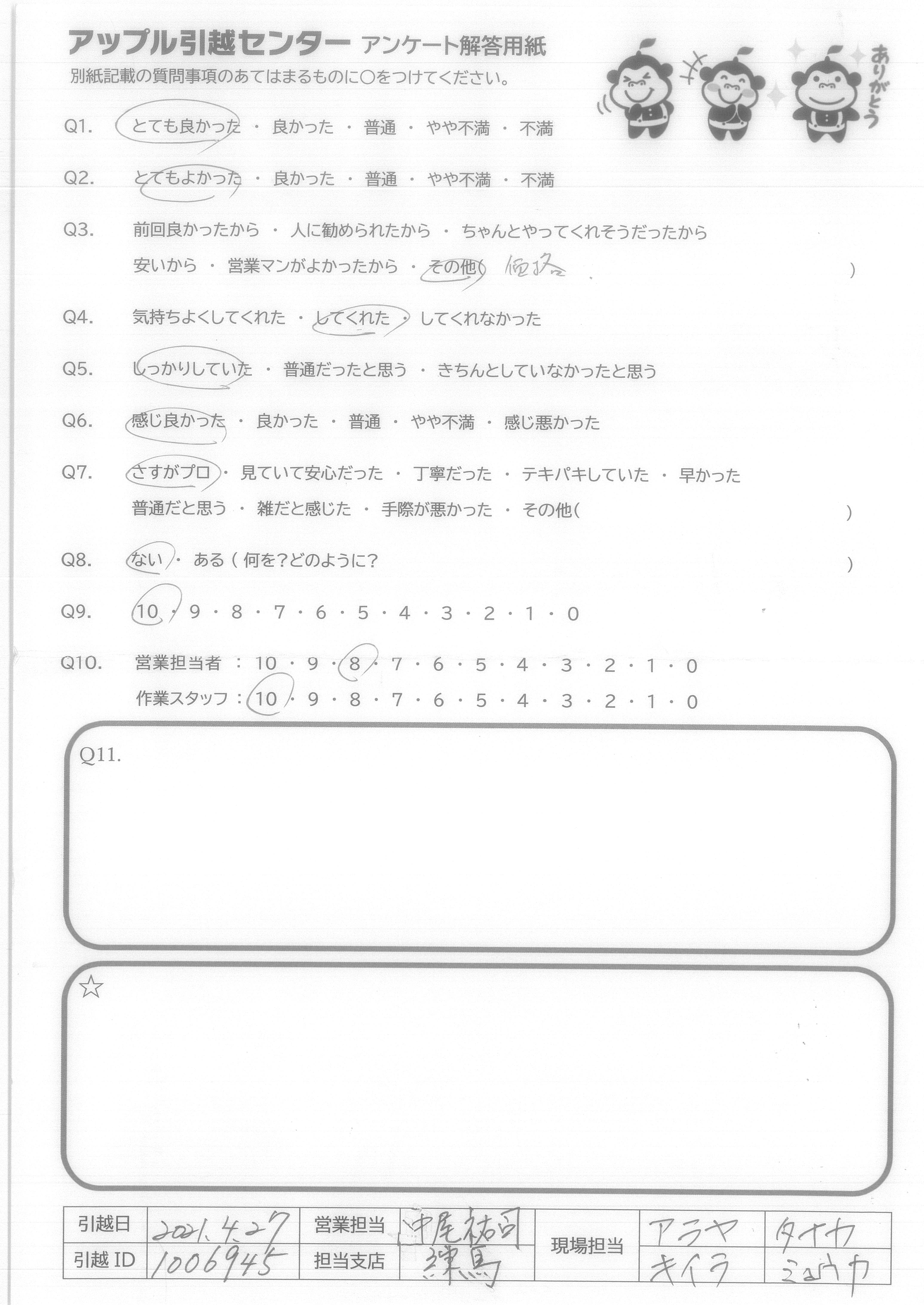 A.気持ちよく安心して引越しできました。料金もお安くやっていただきありがとうございました。