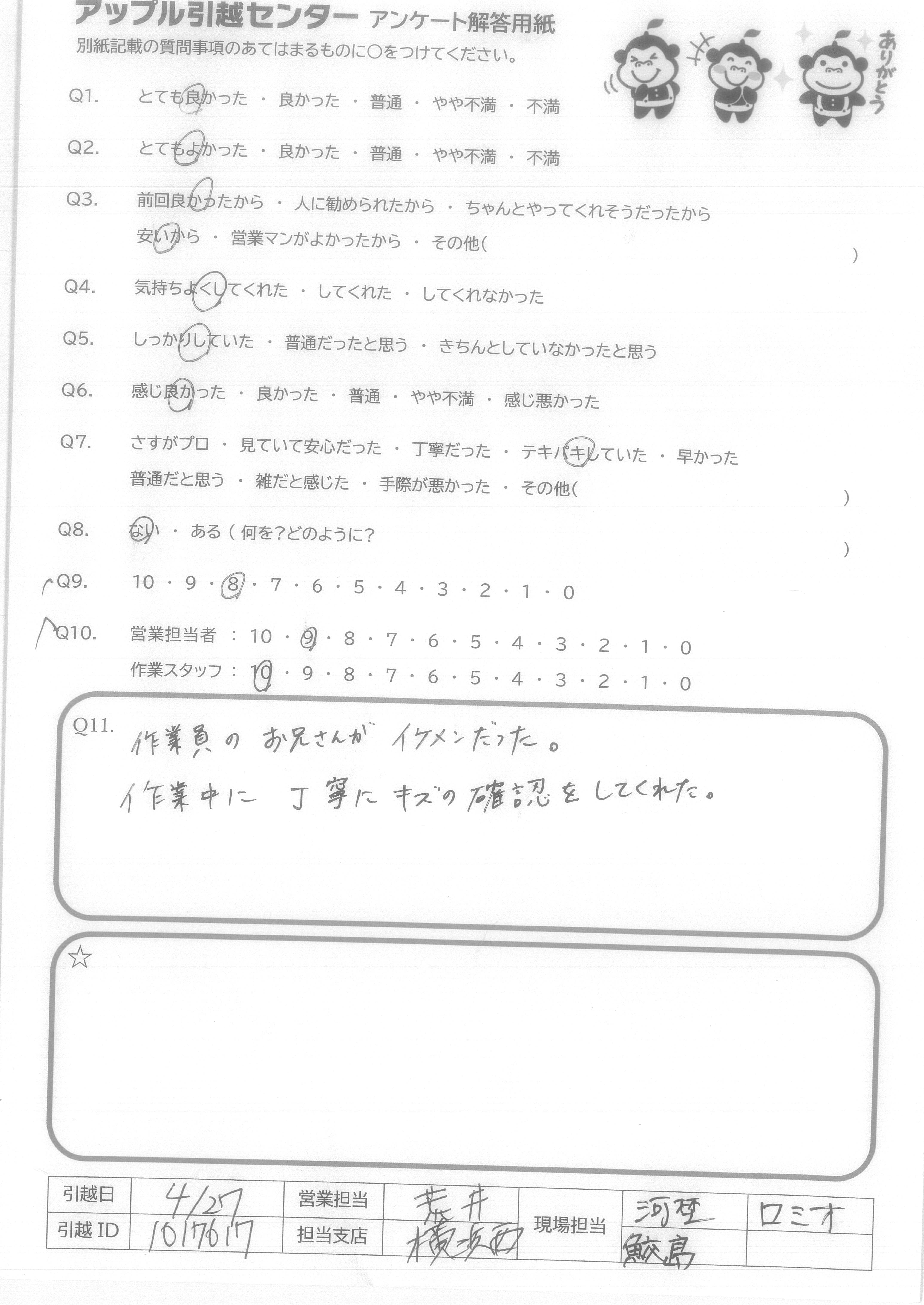 A.とても感じ良く、テキパキと対応して頂いた。 当日に申告した荷物引取をイヤな顔1つせず対応してくれた。 引越完了後も「何か運ぶものはありますか?」と声をかけて頂いて、運んで頂いた。