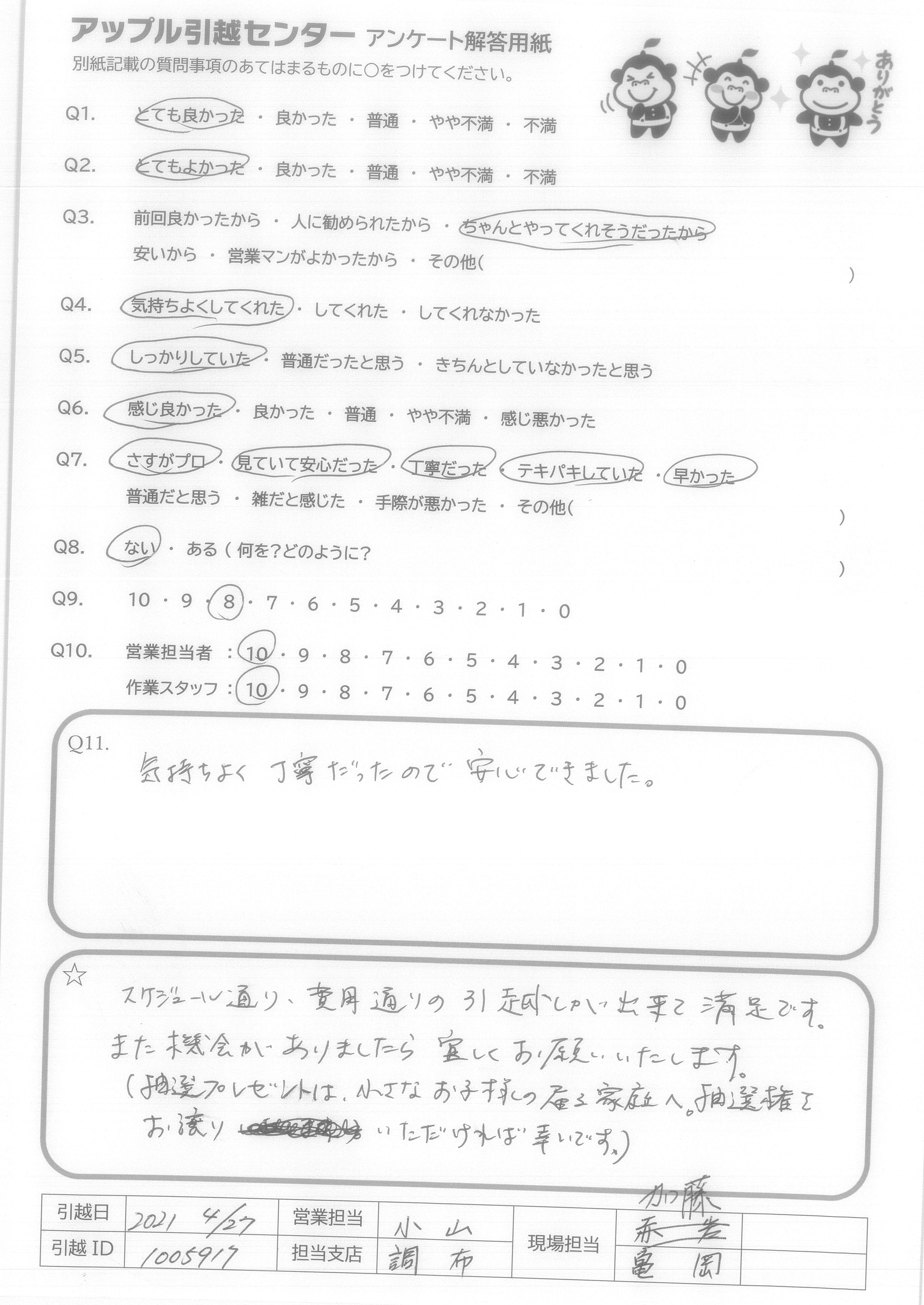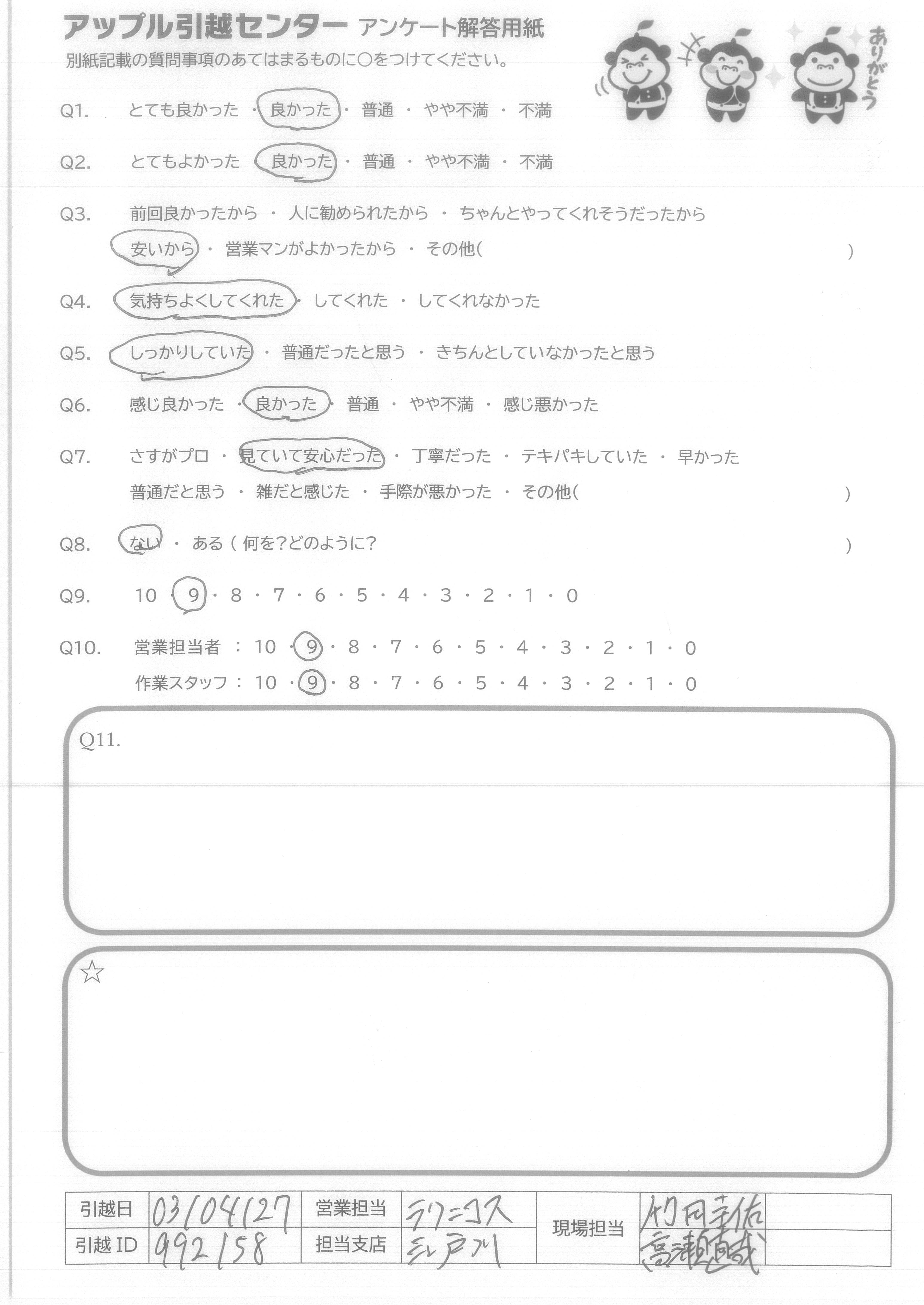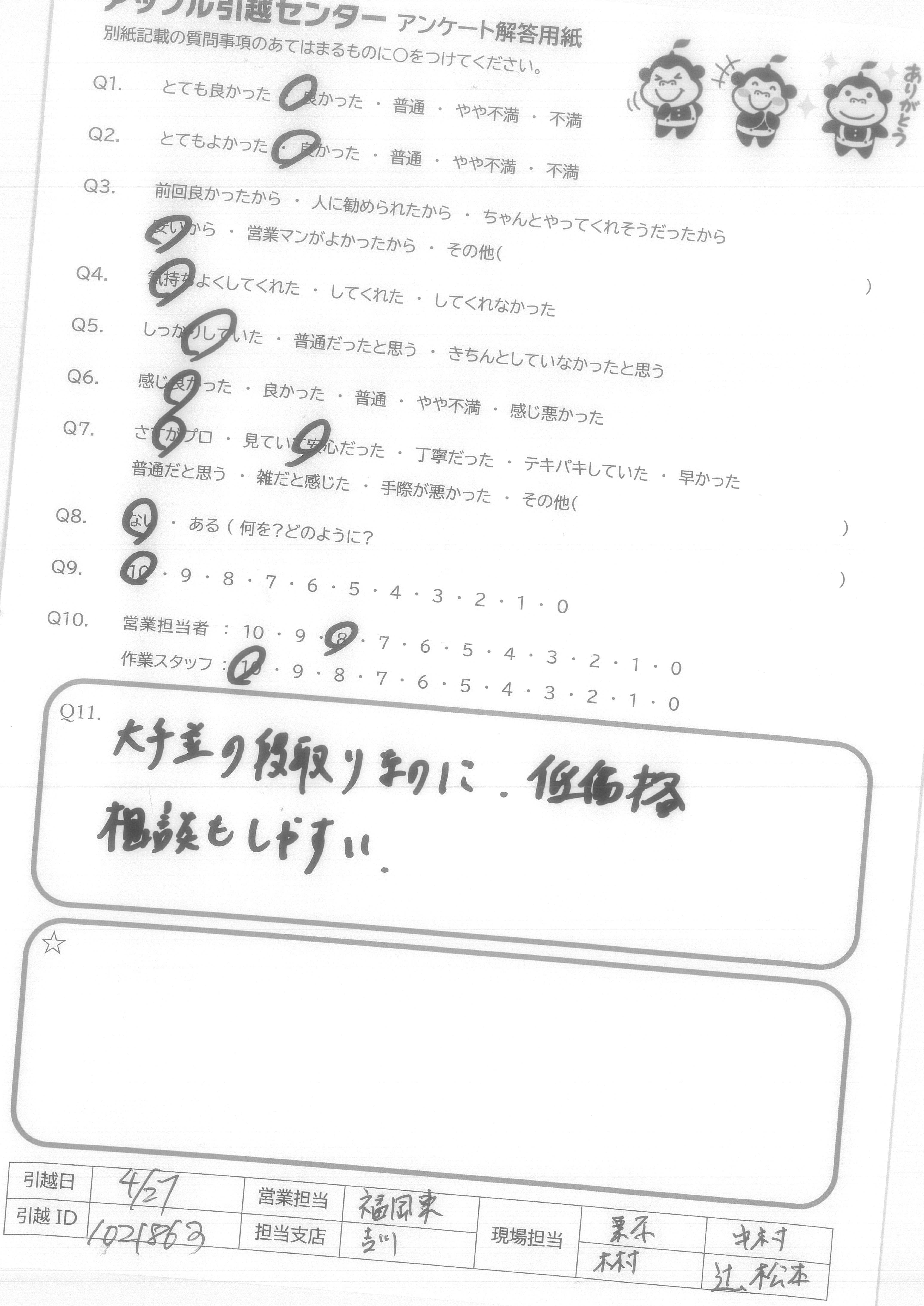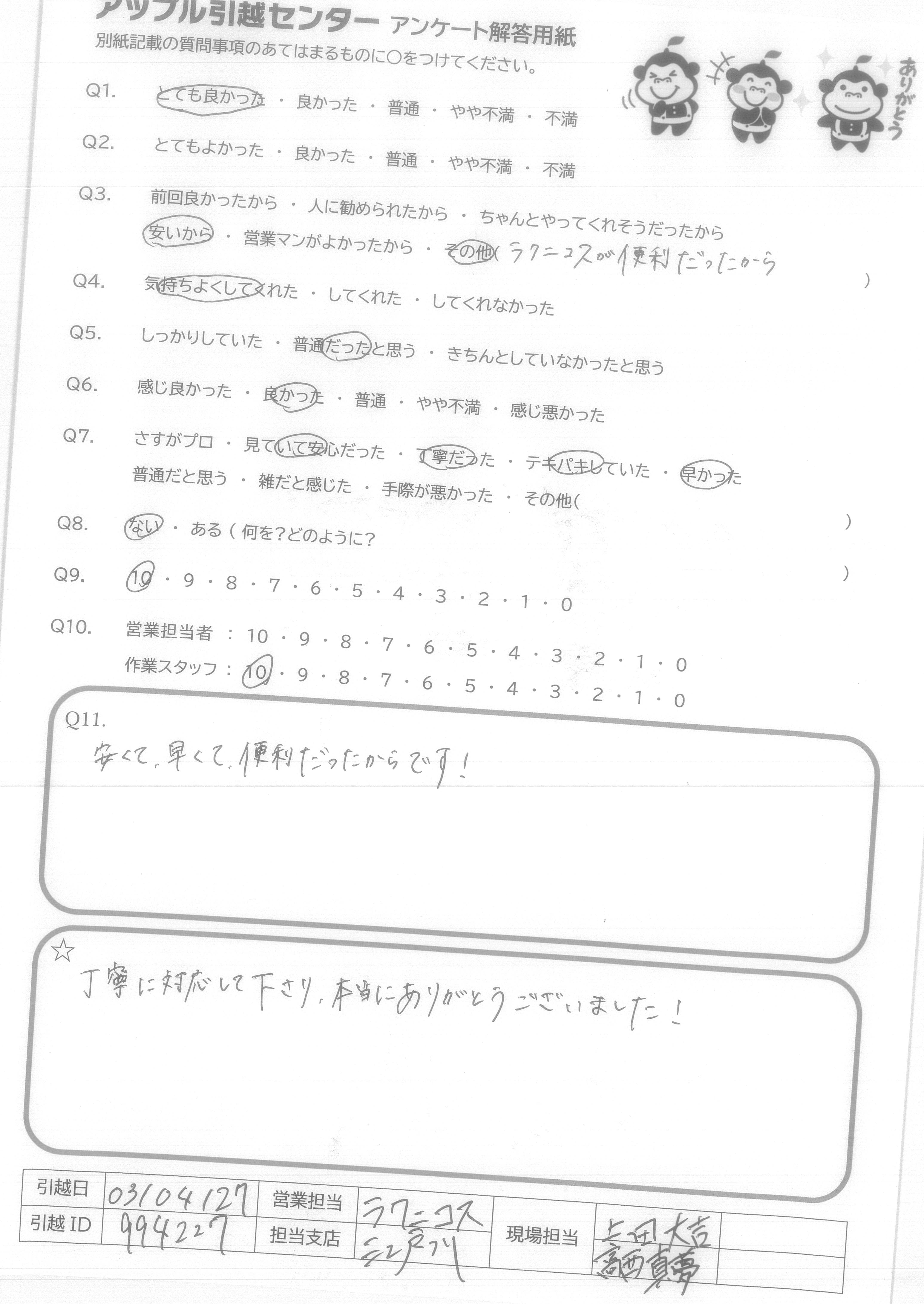 A.スケジュール通り、費用通りの引越しが出来て満足です。 また機会がありましたら宜しくお願いいたします。 (抽選プレゼントは、小さなお子様の居る過程へ、抽選券をお譲りいただければ幸いです。)