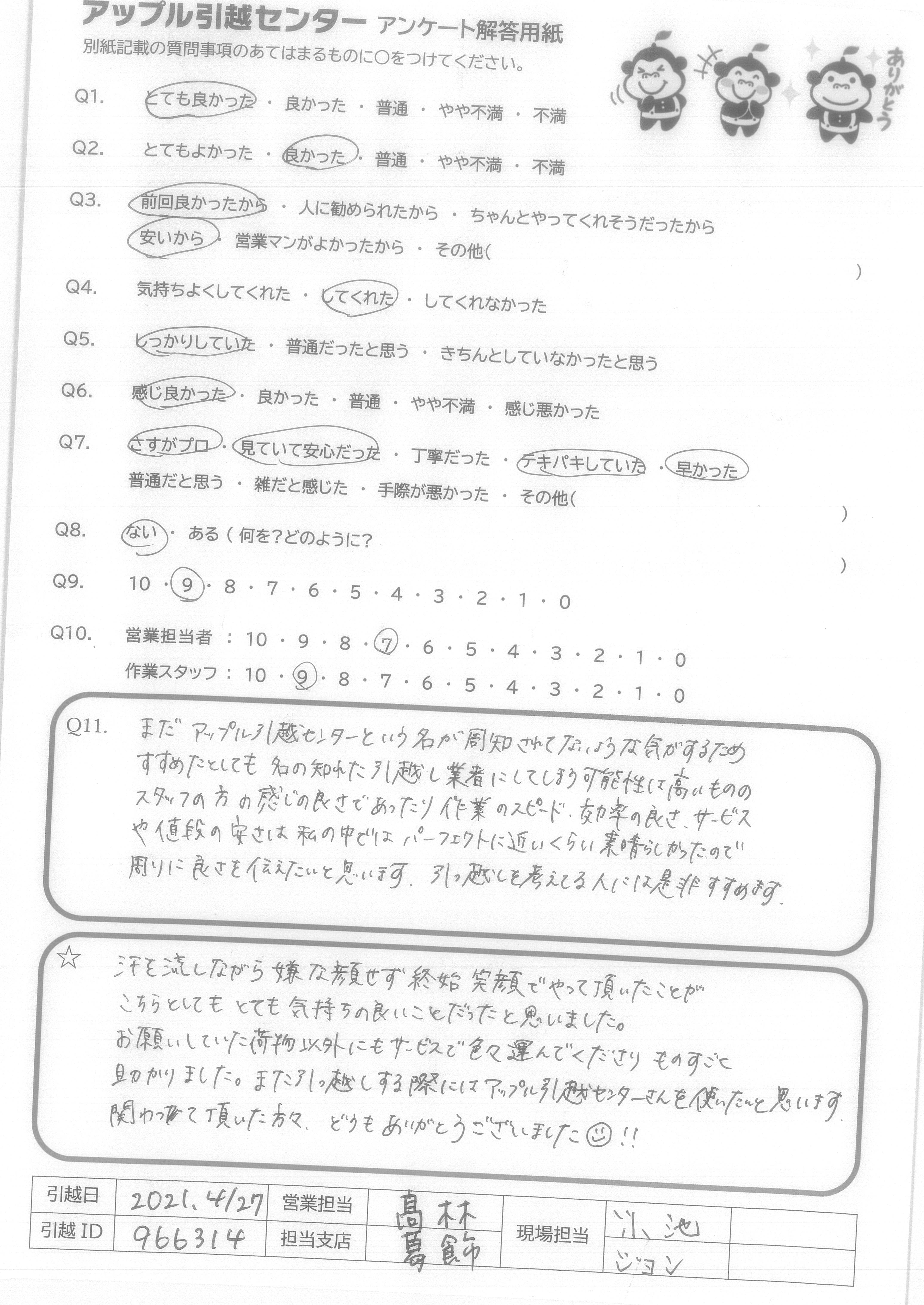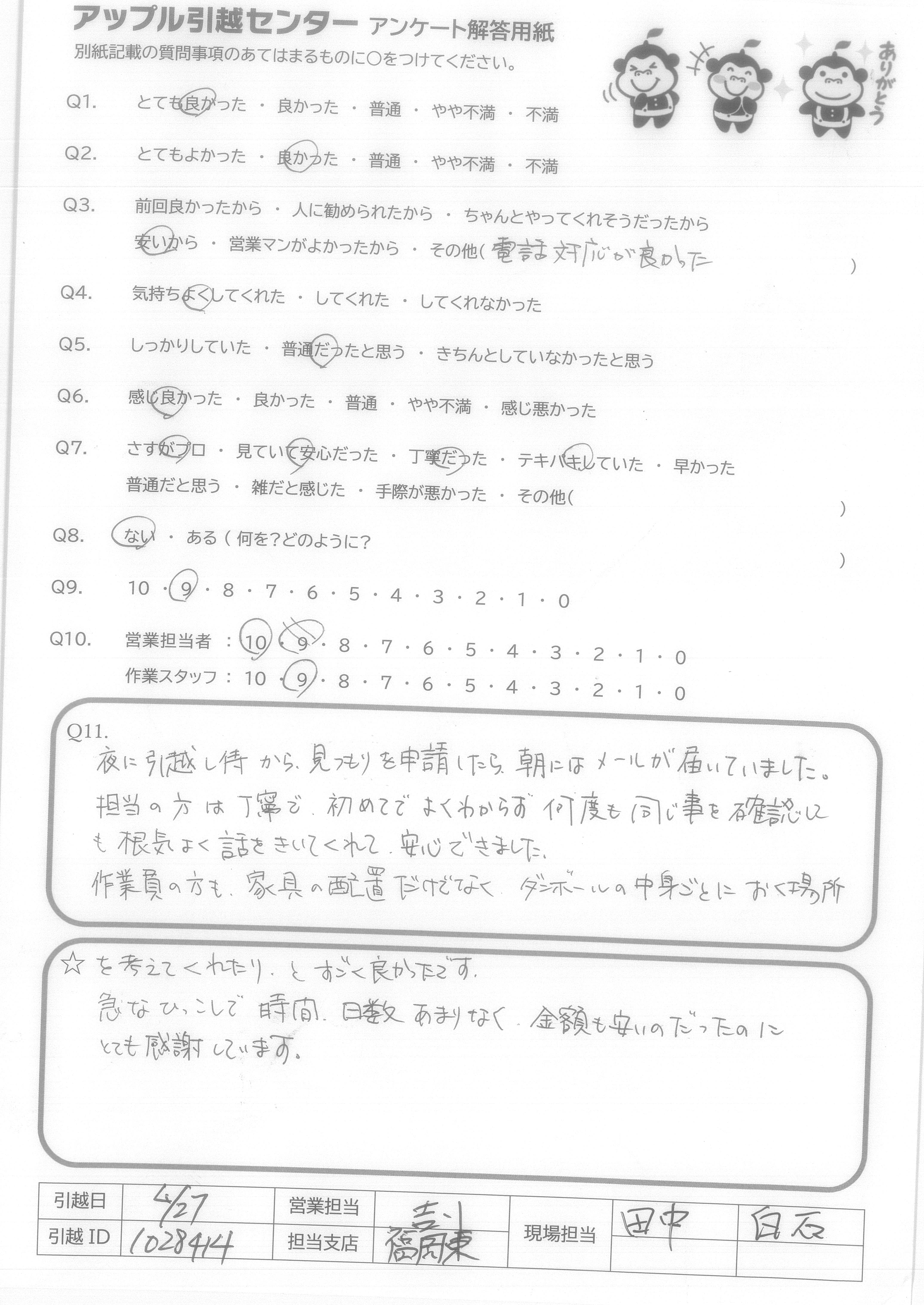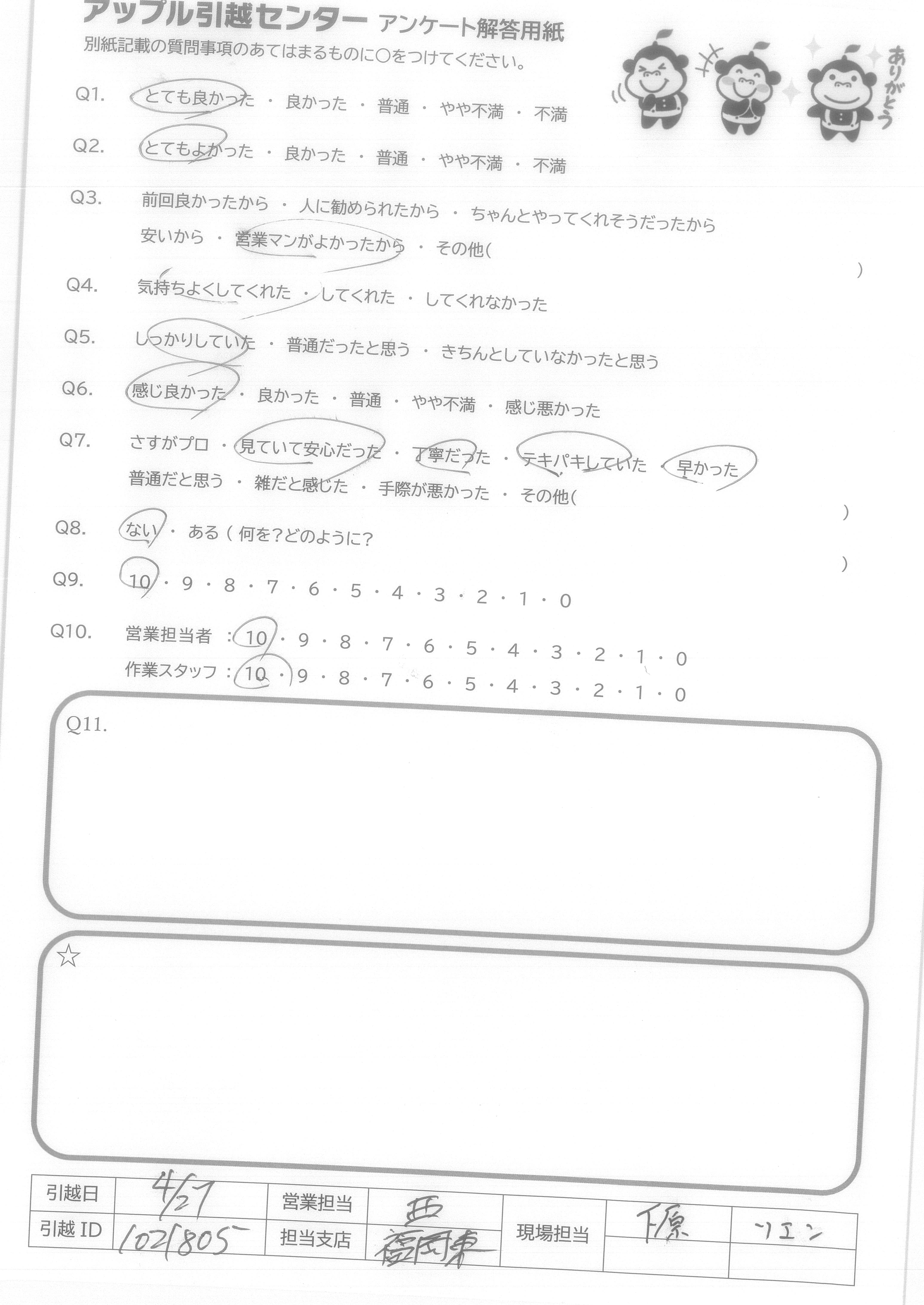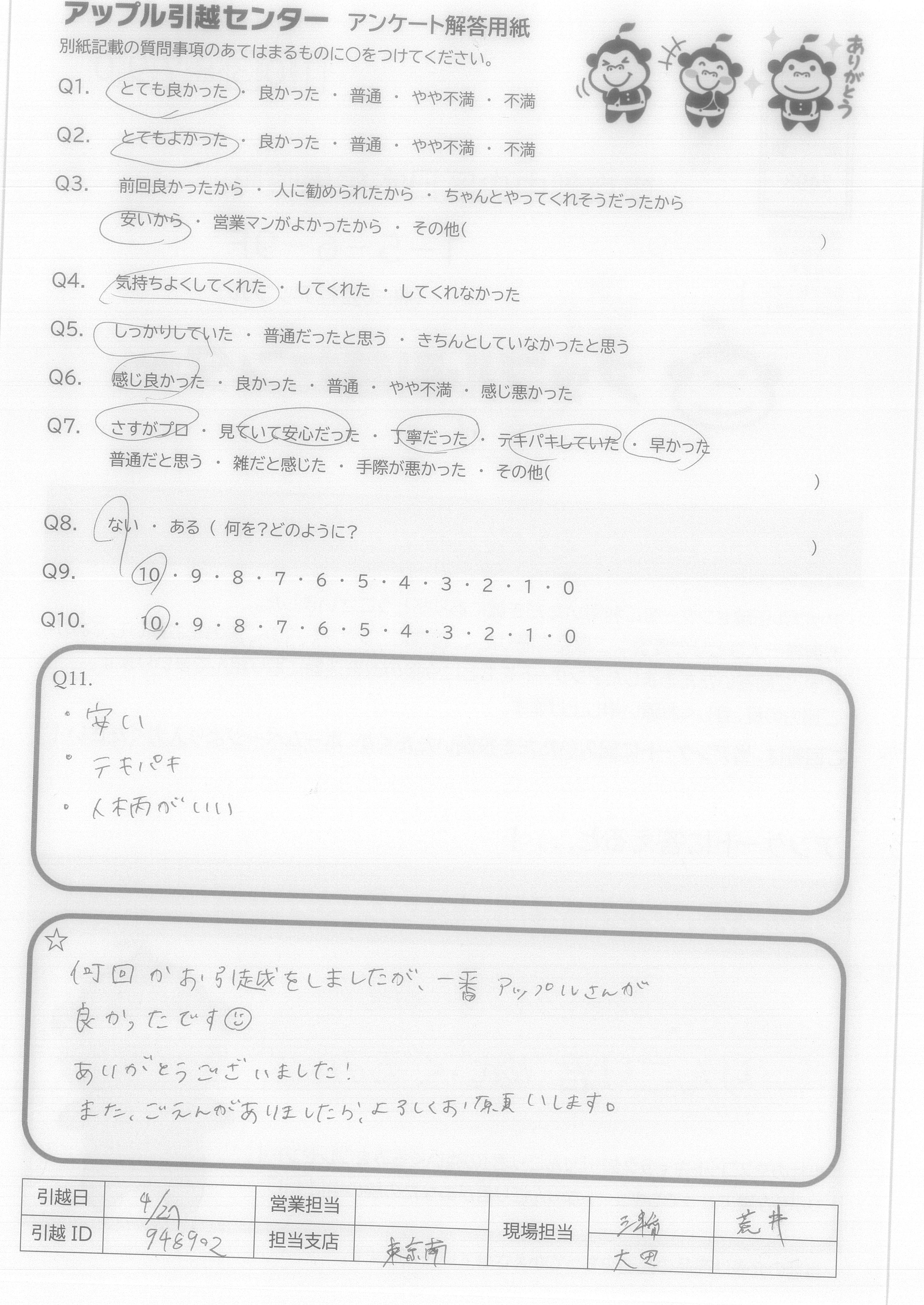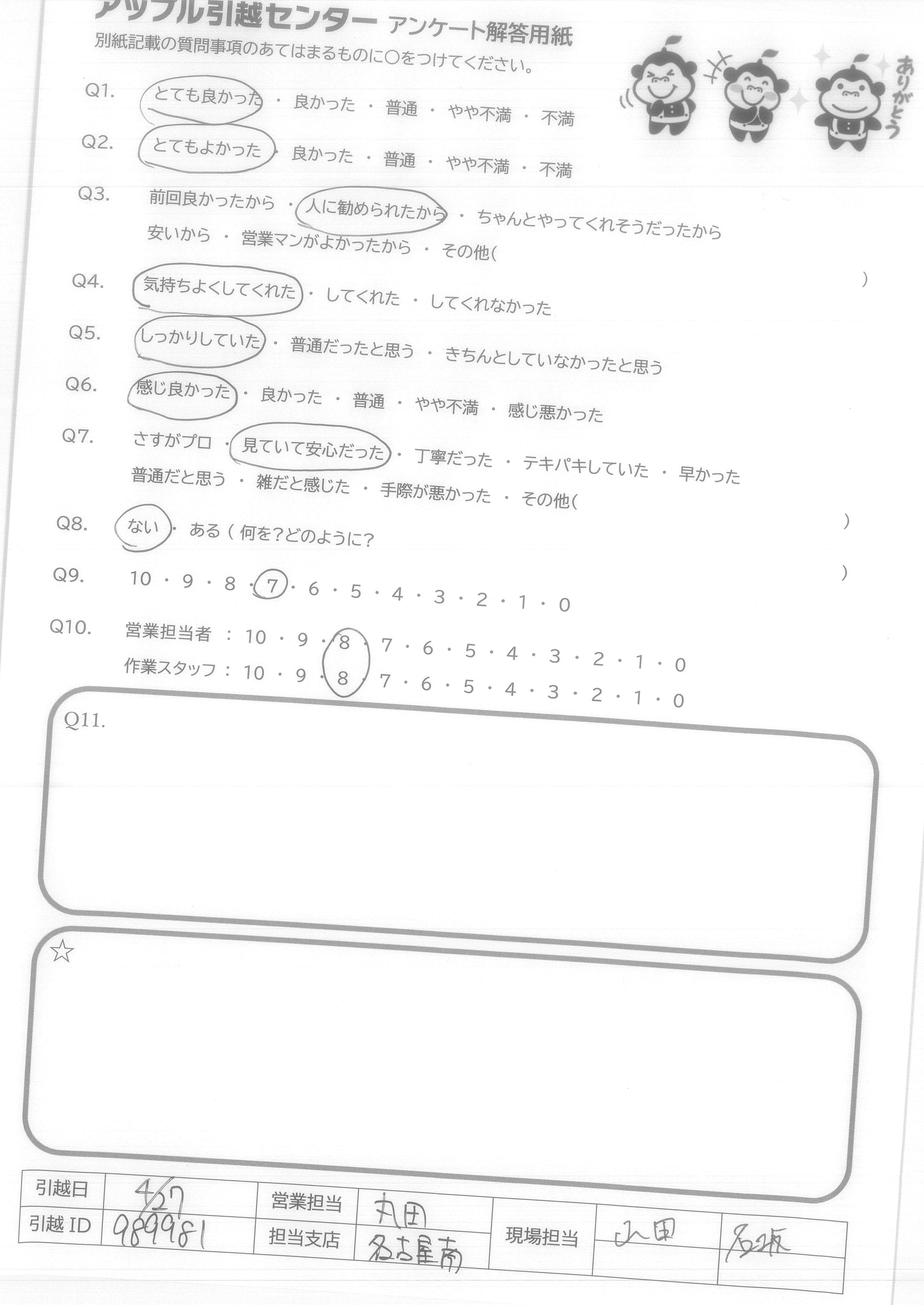 A.スケジュール通り、費用通りの引越しが出来て満足です。 また機会がありましたら宜しくお願いいたします。 (抽選プレゼントは、小さなお子様の居る過程へ、抽選券をお譲りいただければ幸いです。)