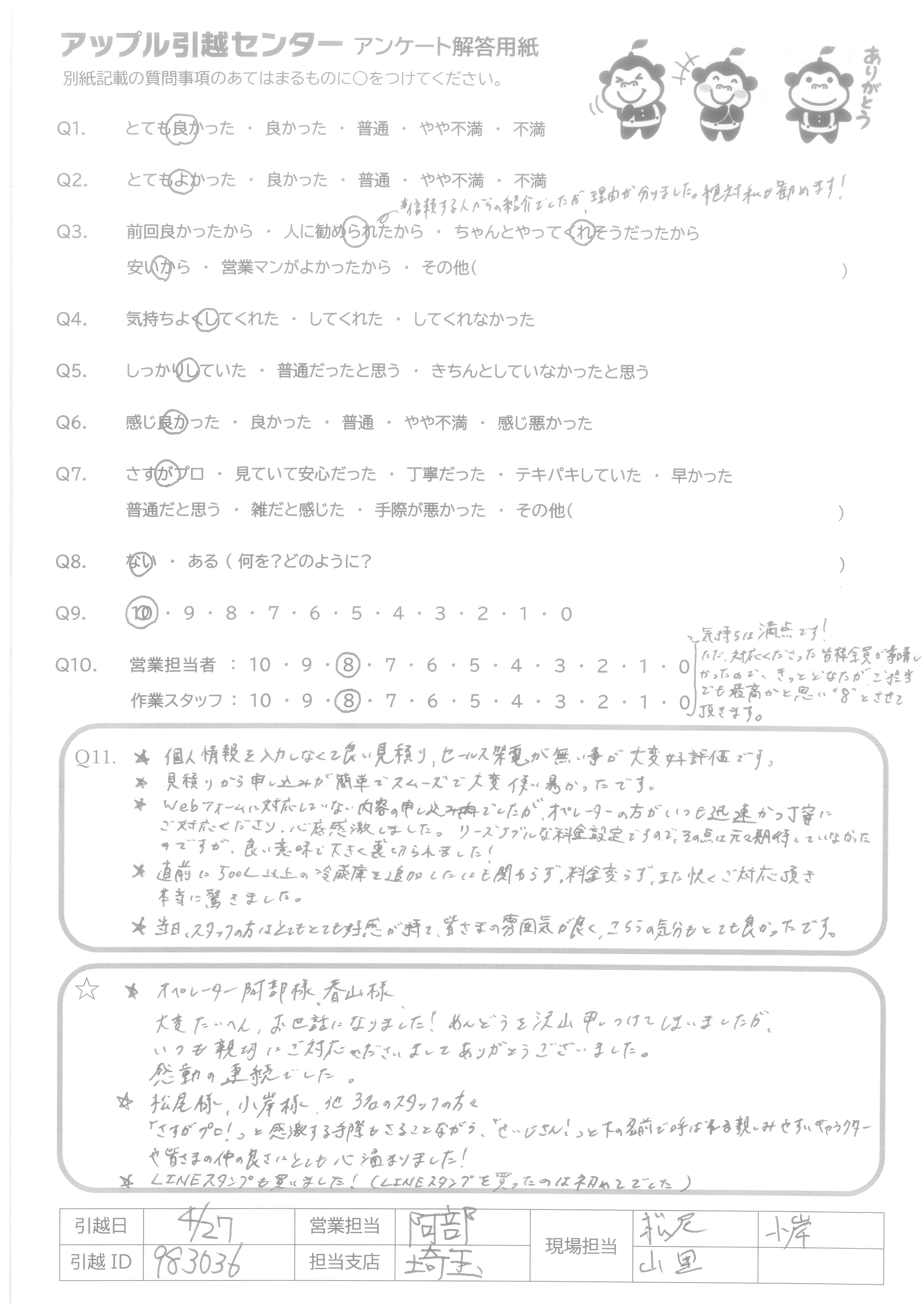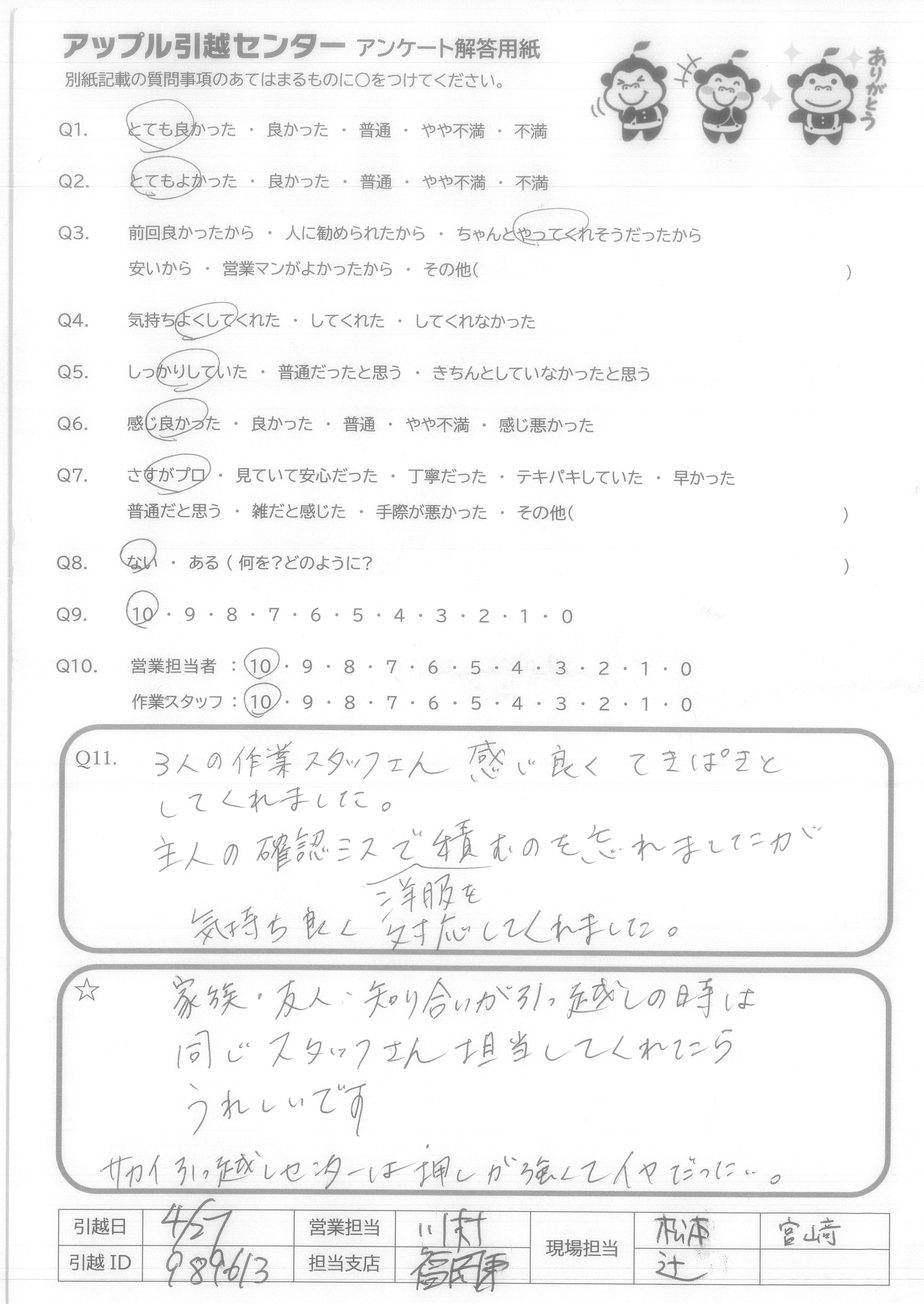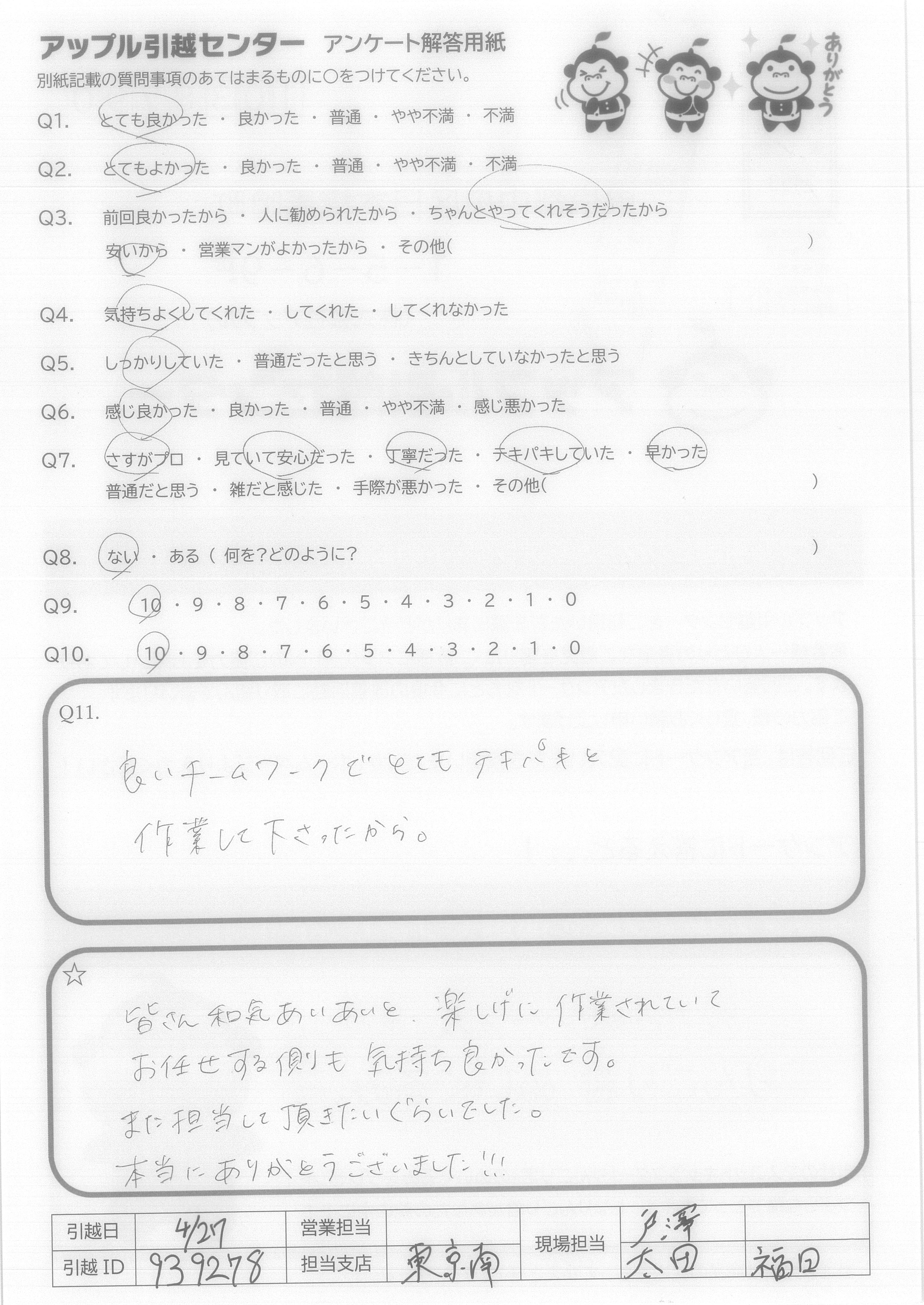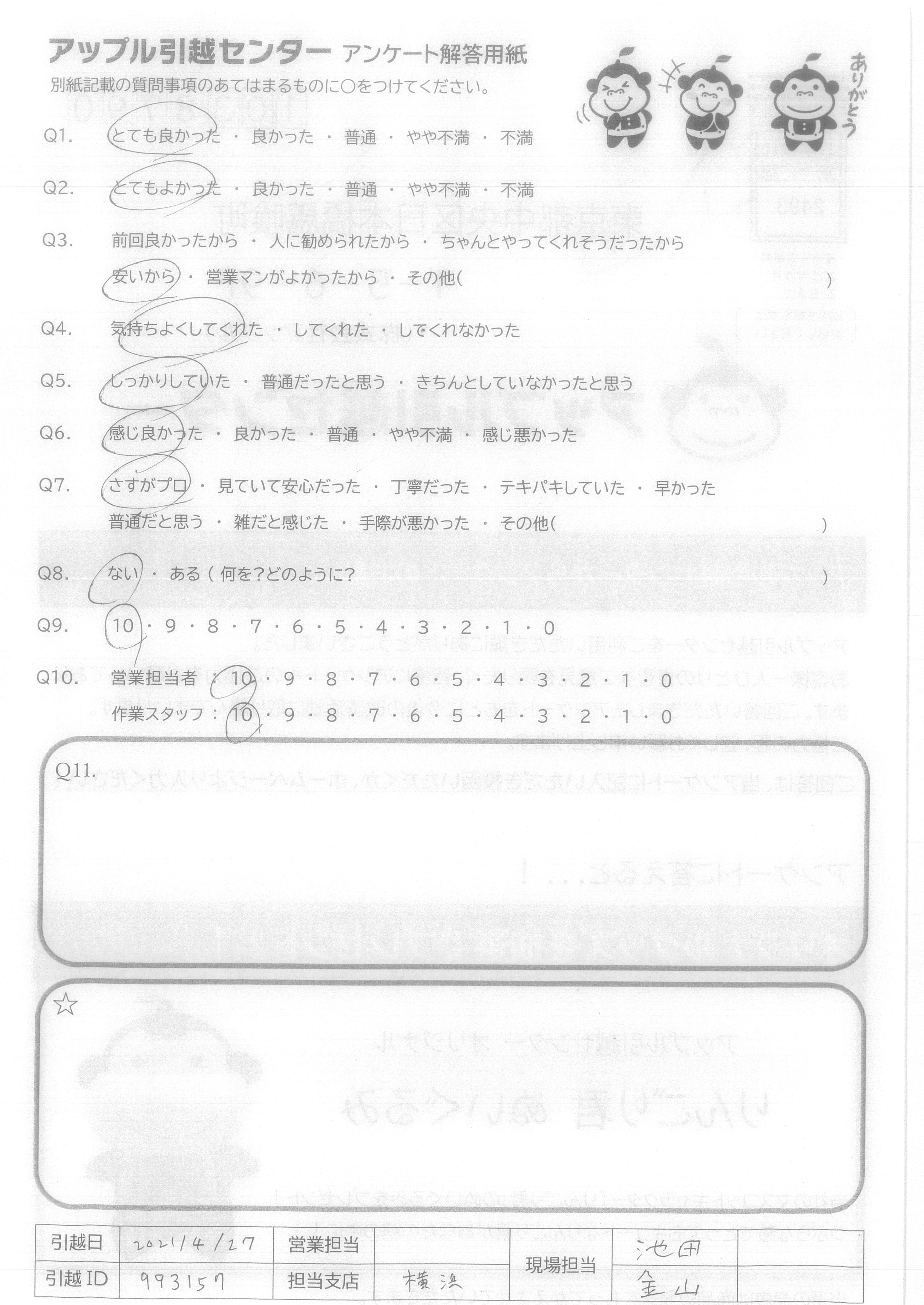 A.スケジュール通り、費用通りの引越しが出来て満足です。 また機会がありましたら宜しくお願いいたします。 (抽選プレゼントは、小さなお子様の居る過程へ、抽選券をお譲りいただければ幸いです。)