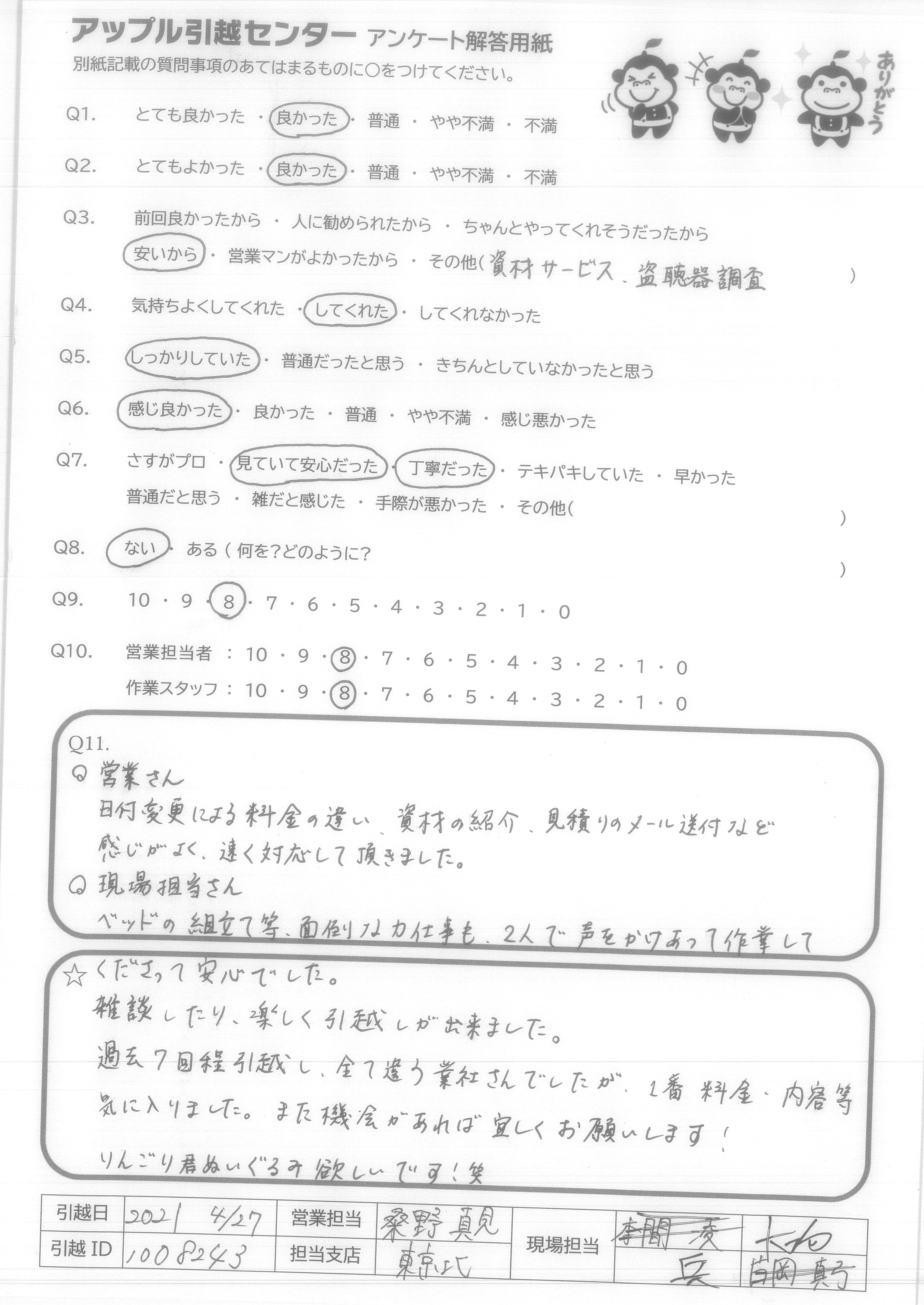 A.Q営業さん 日付変更による料金の違い、資材の紹介、見積りのメール送付など感じがよく、速く対応して頂きました。 Q現場担当さん ベッドの組み立て等、面倒な力仕事も2人で声をかけあって作業してくださって安心でした。