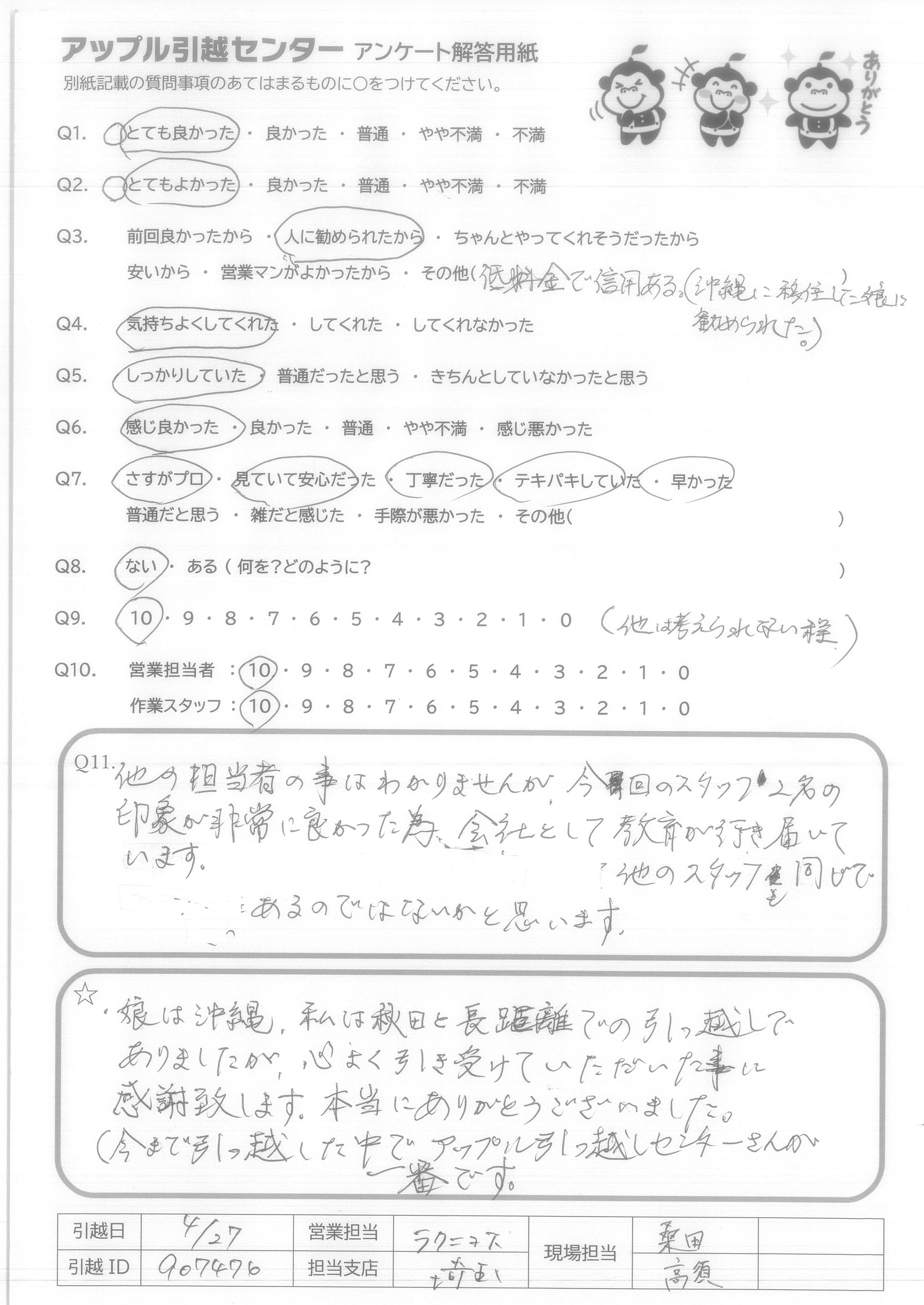 A.娘は沖縄、私は秋田と長距離での引っ越しでありましたが、心よく引き受けていただいた事に感謝致します。本当にありがとうございました。 (今まで引っ越した中でアップル引っ越しセンターさんが一番です。