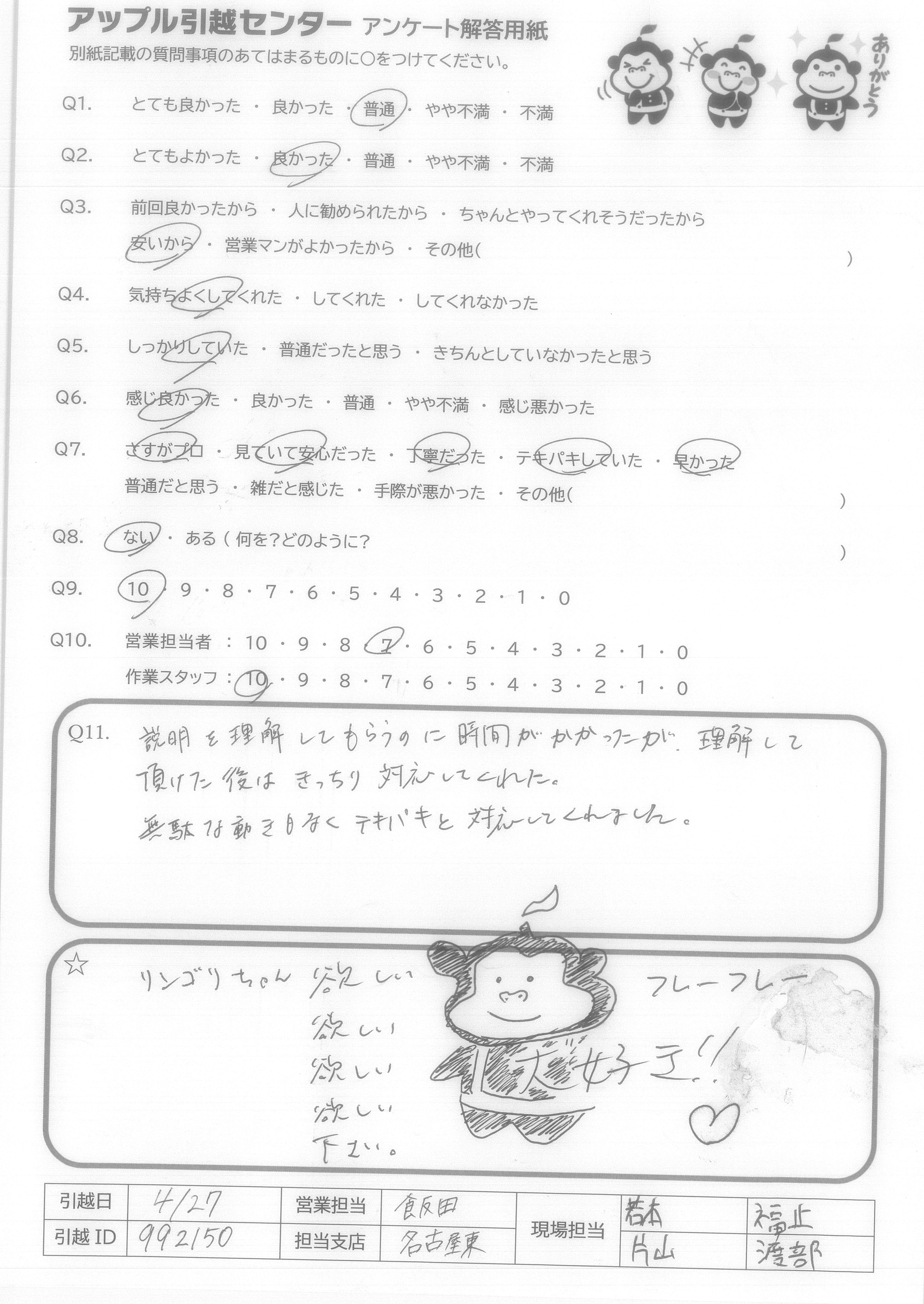 A.雑談したり、楽しく引越しが出来ました。 過去7回程引越し、全て違う業者さんでしたが、1番料金・内容等気に入りました。また機会があれば宜しくお願いします! りんごり君ぬいぐるみ欲しいです!笑