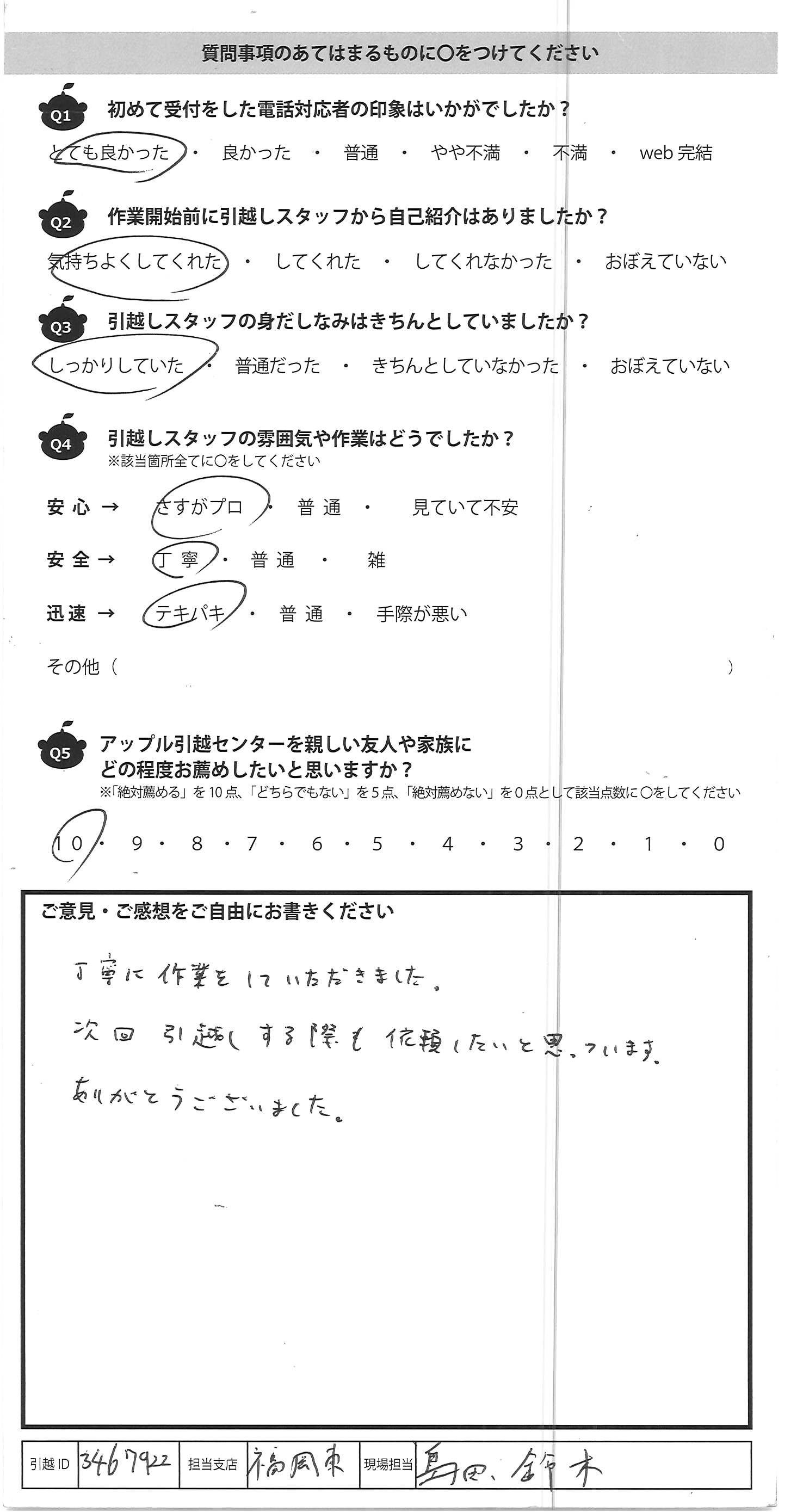 A.見積から電話で直接話しが出来て大変スムーズでした。無理な事も言われなく作業前から好印象でした。 作業ももちろん明るくテキパキと大変気持ちが良い引っ越しが出来て感謝しています!また是非お願いしたいです! アップルさん一択になりました! 段ボールの言葉にも励みになりましたよ!有り難う!(*^_^*)