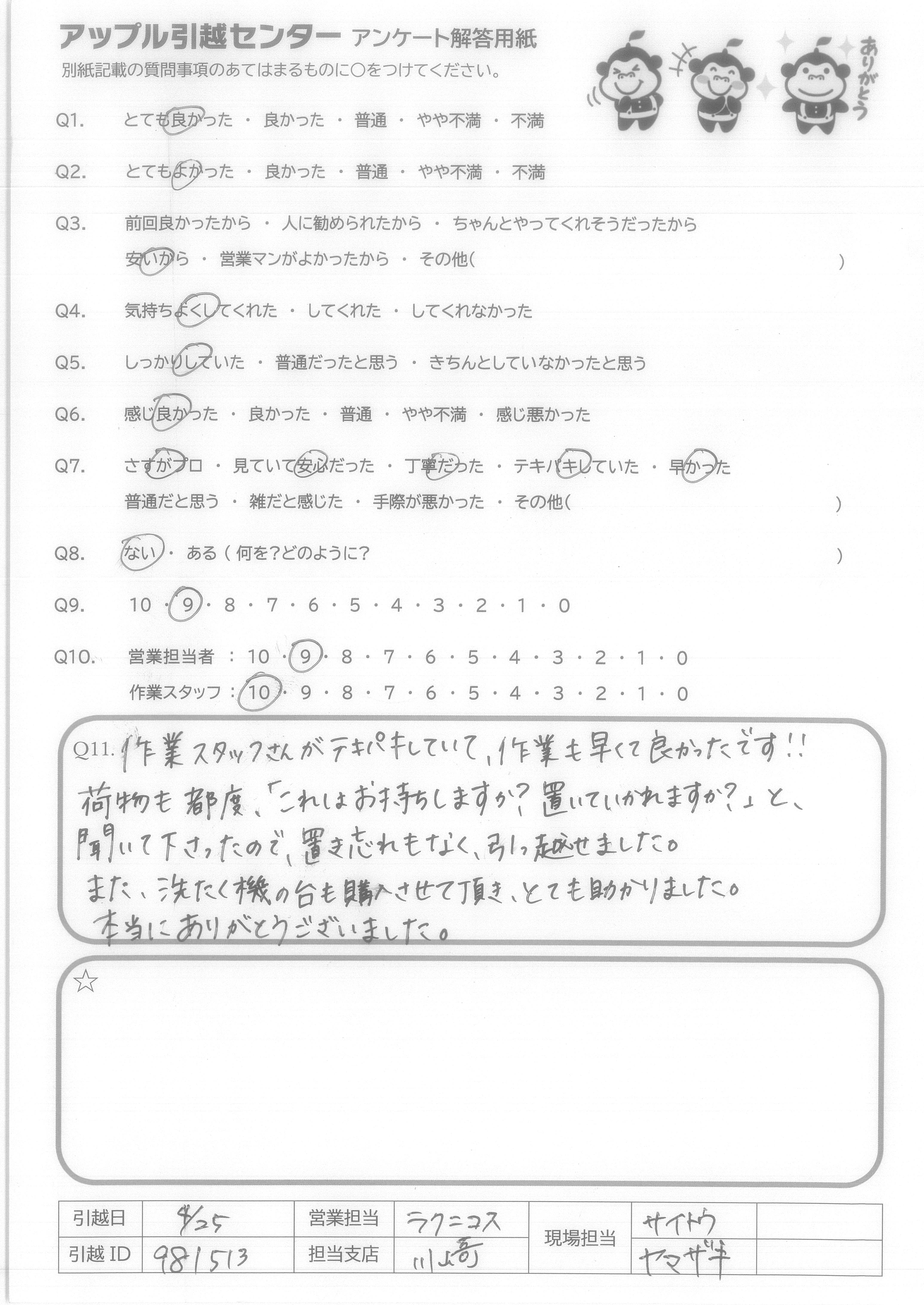 A.作業スタッフさんがテキパキしていて、作業も早くて良かったです!!荷物も都度、「これはお持ちしますか?置いていかれますか?」と聞いてくださったので、置き忘れもなく、引っ越せました。 また、洗たく機の台も購入させて頂き、とても助かりました。本当にありがとうございました。