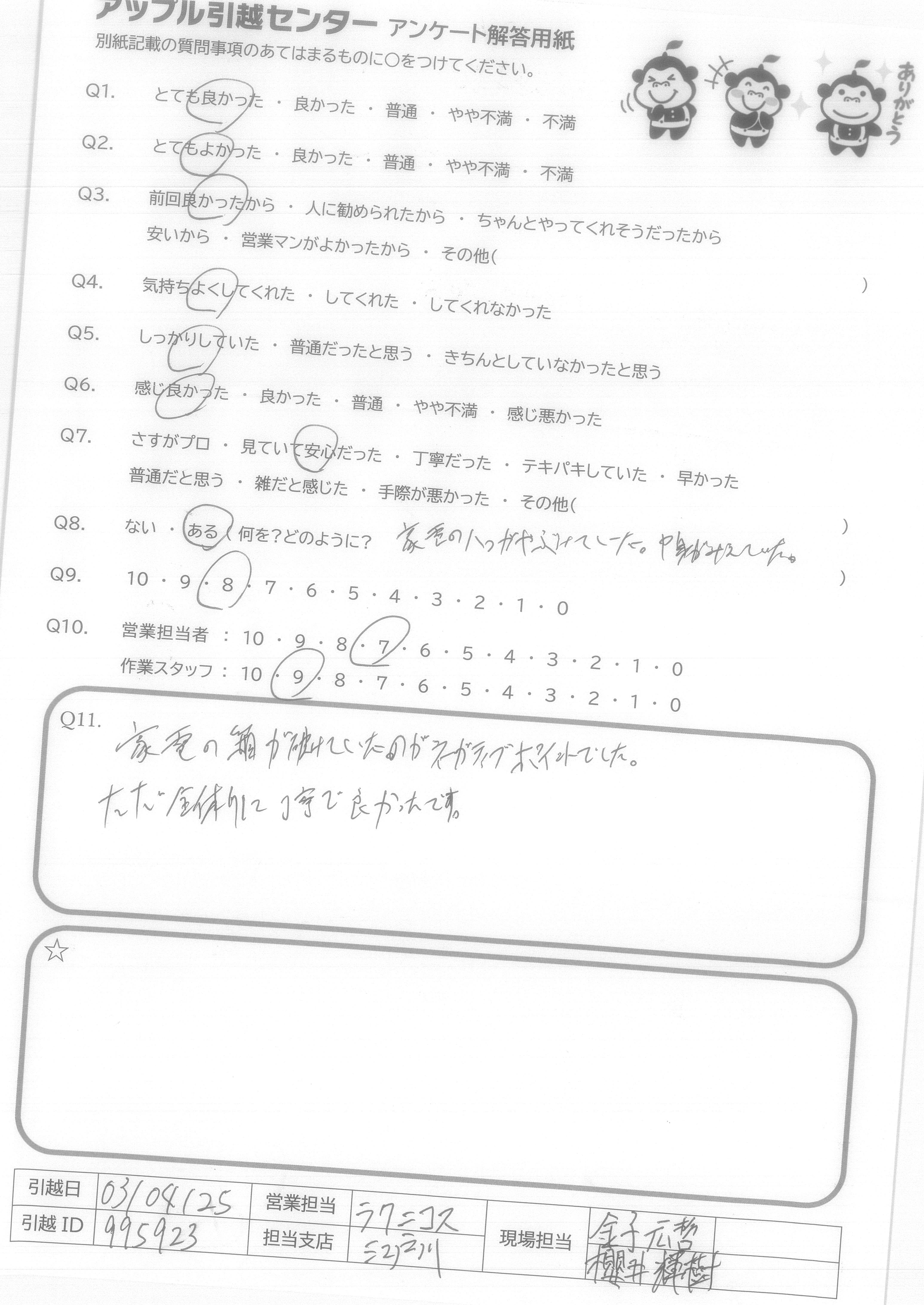 A.とても丁寧で気さくにお話もしてくださって好印象でした。同じ作業でも気持ちよく対応くださる方が良いと思うので、ぜひ周りの人にすすめたいと思います。3回御社にお願いしておりますが、皆さん本当に良い方ばかりなので驚きます。今後も引っ越しの際は宜しくお願いします。
