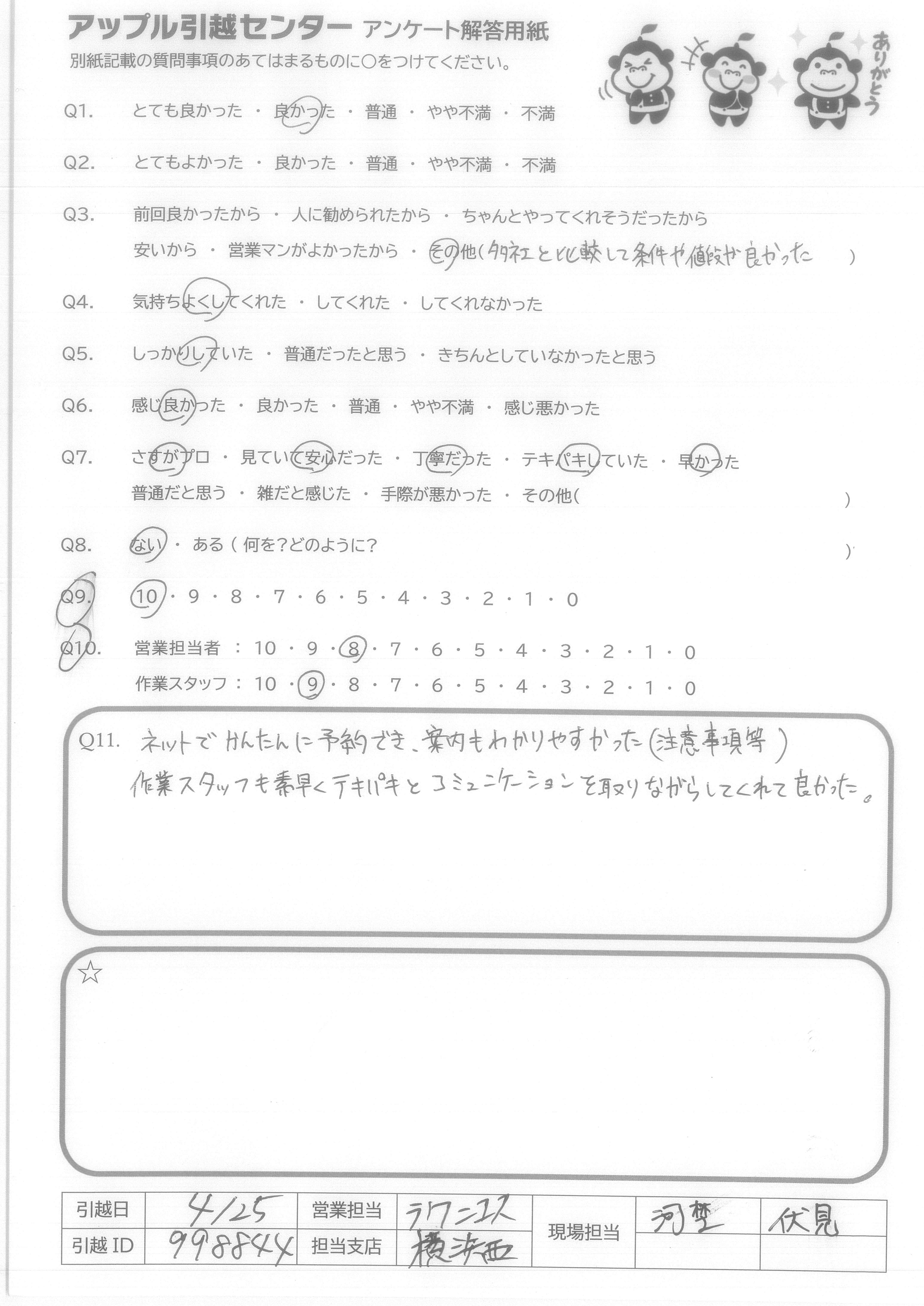 A.電話対応や作業員の対応、早さなど、とても素晴らしかったです。今後も引っ越しをするときはアップル引っ越しセンターを必ず利用します。