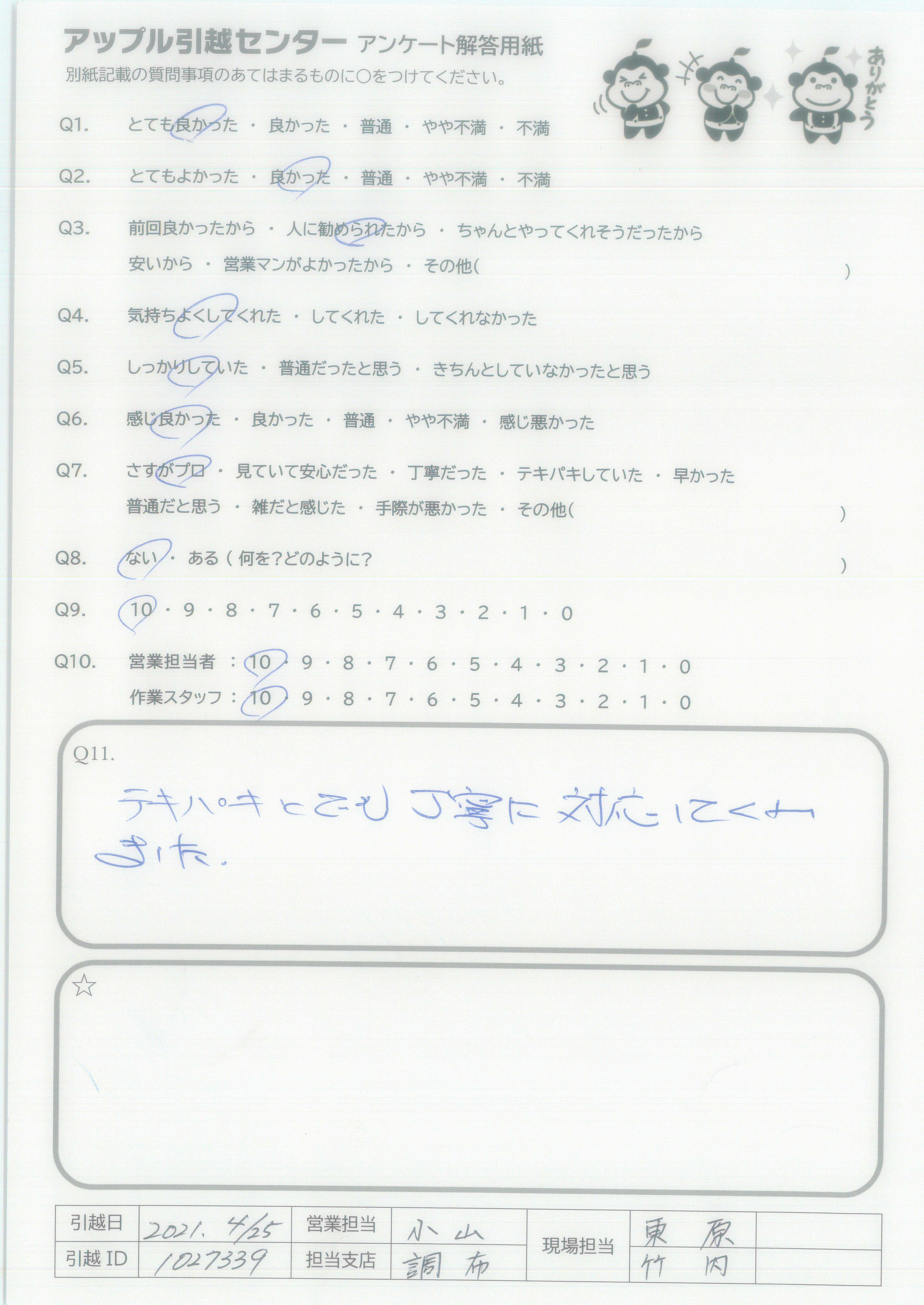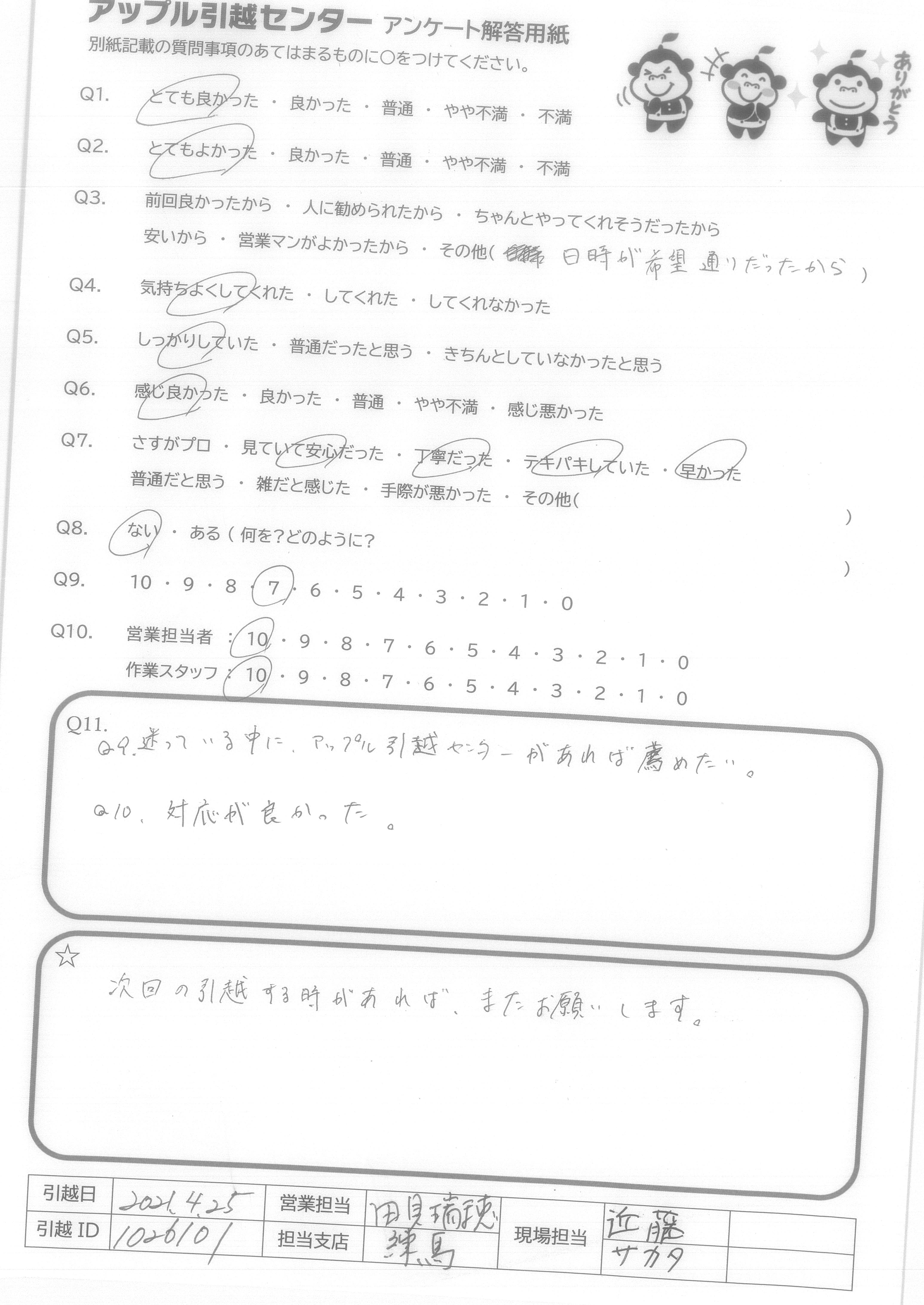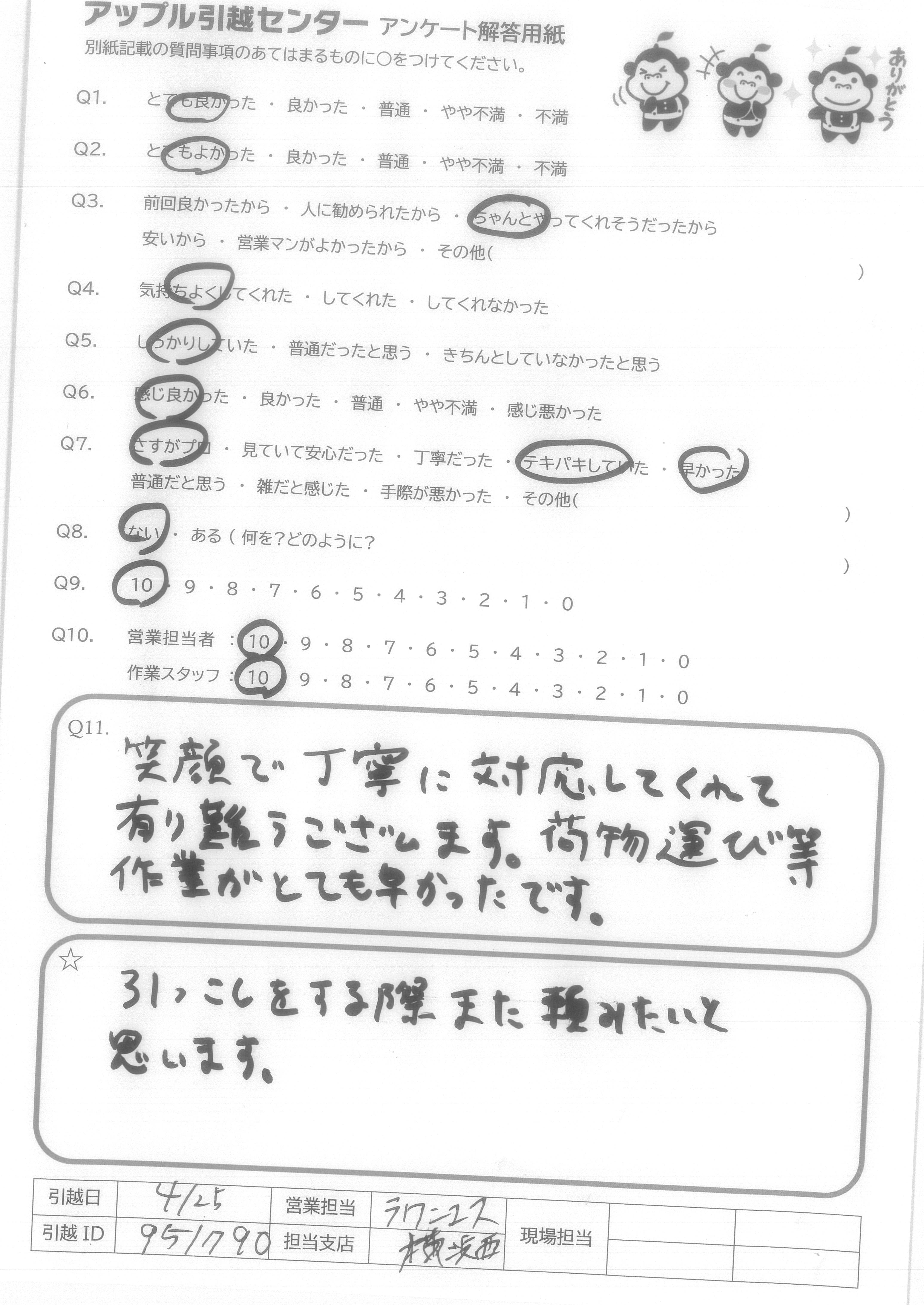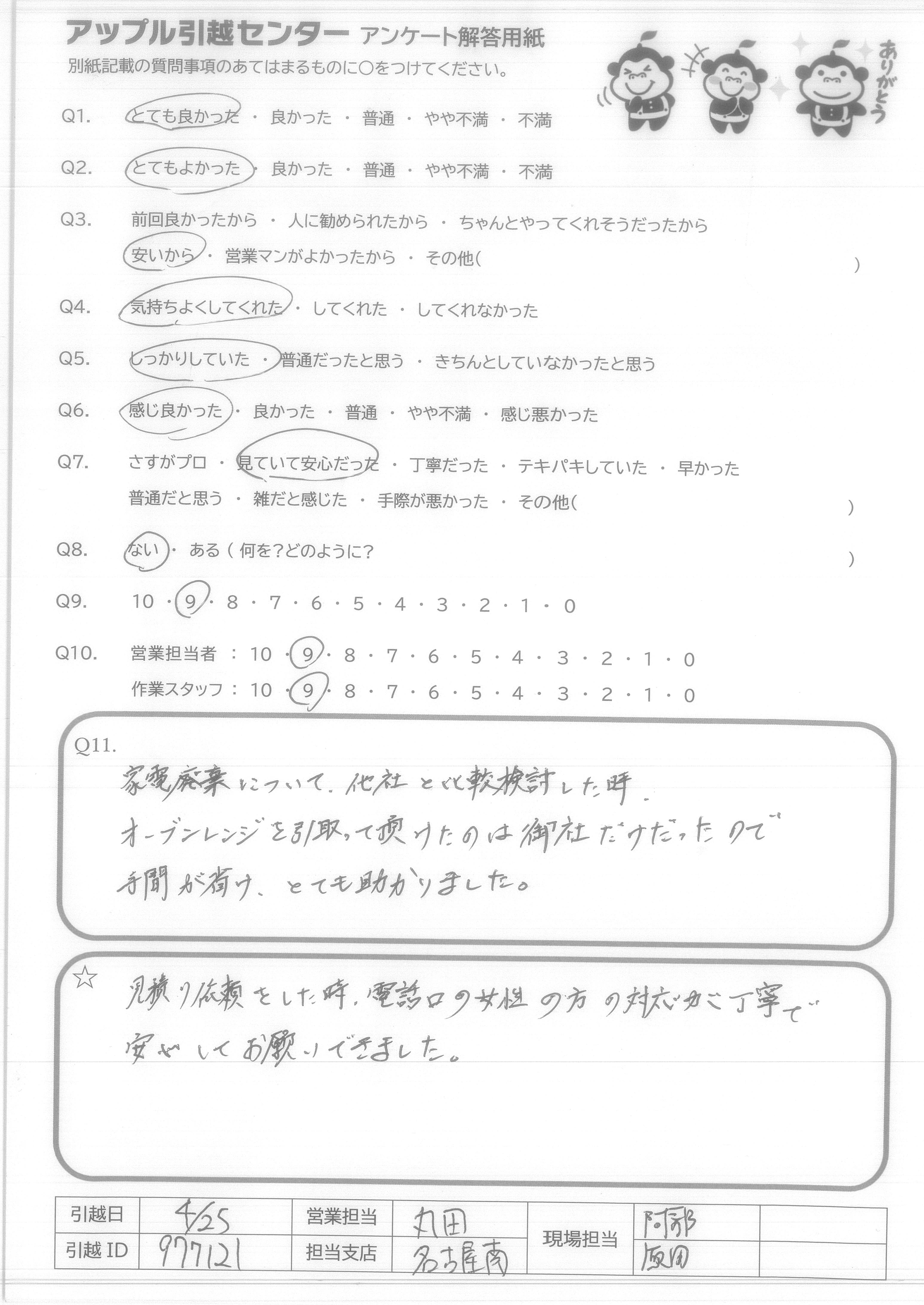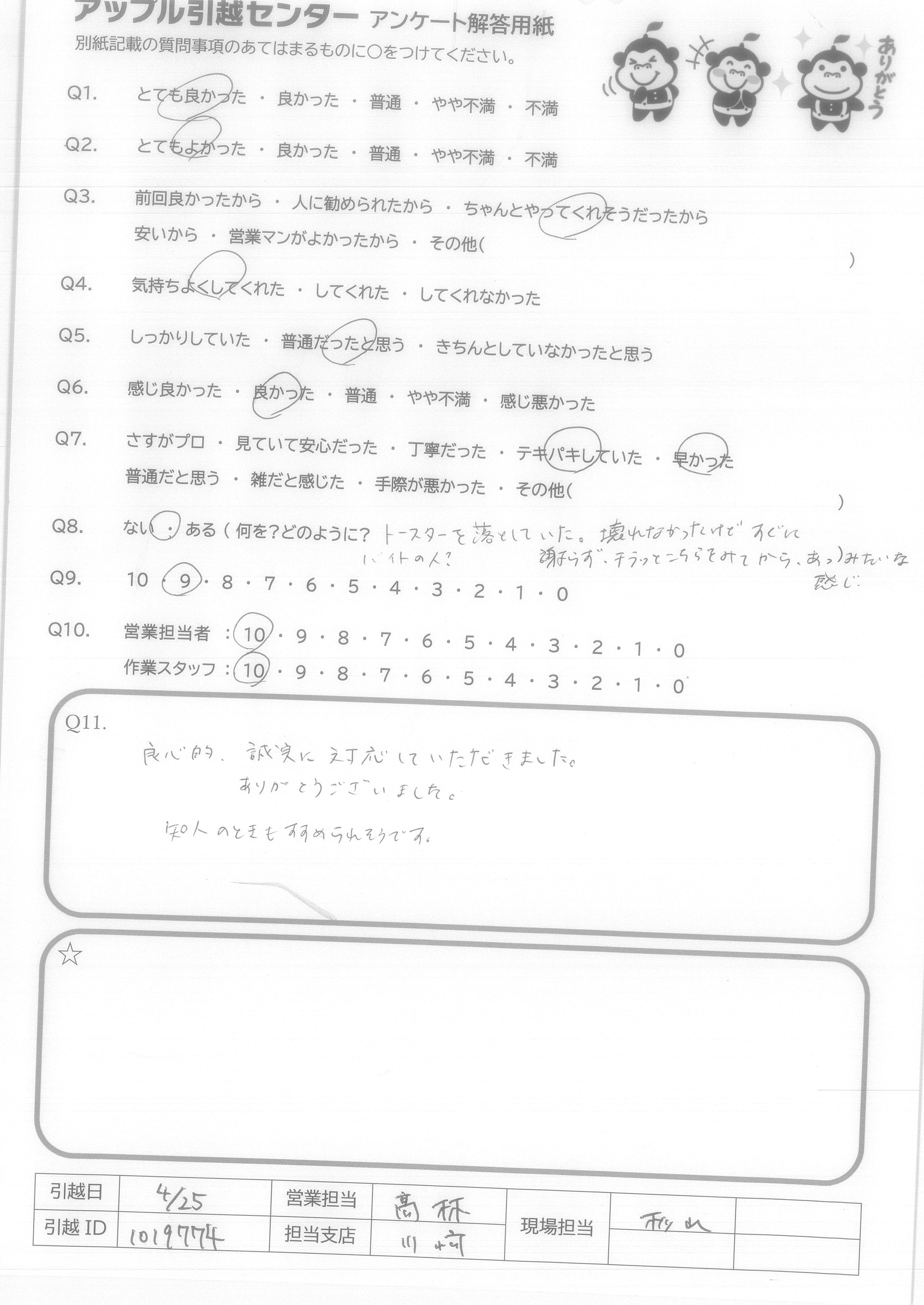 A.Q9.迷っている中に、アップル引越センターがあれば薦めたい。 Q10.対応が良かった。