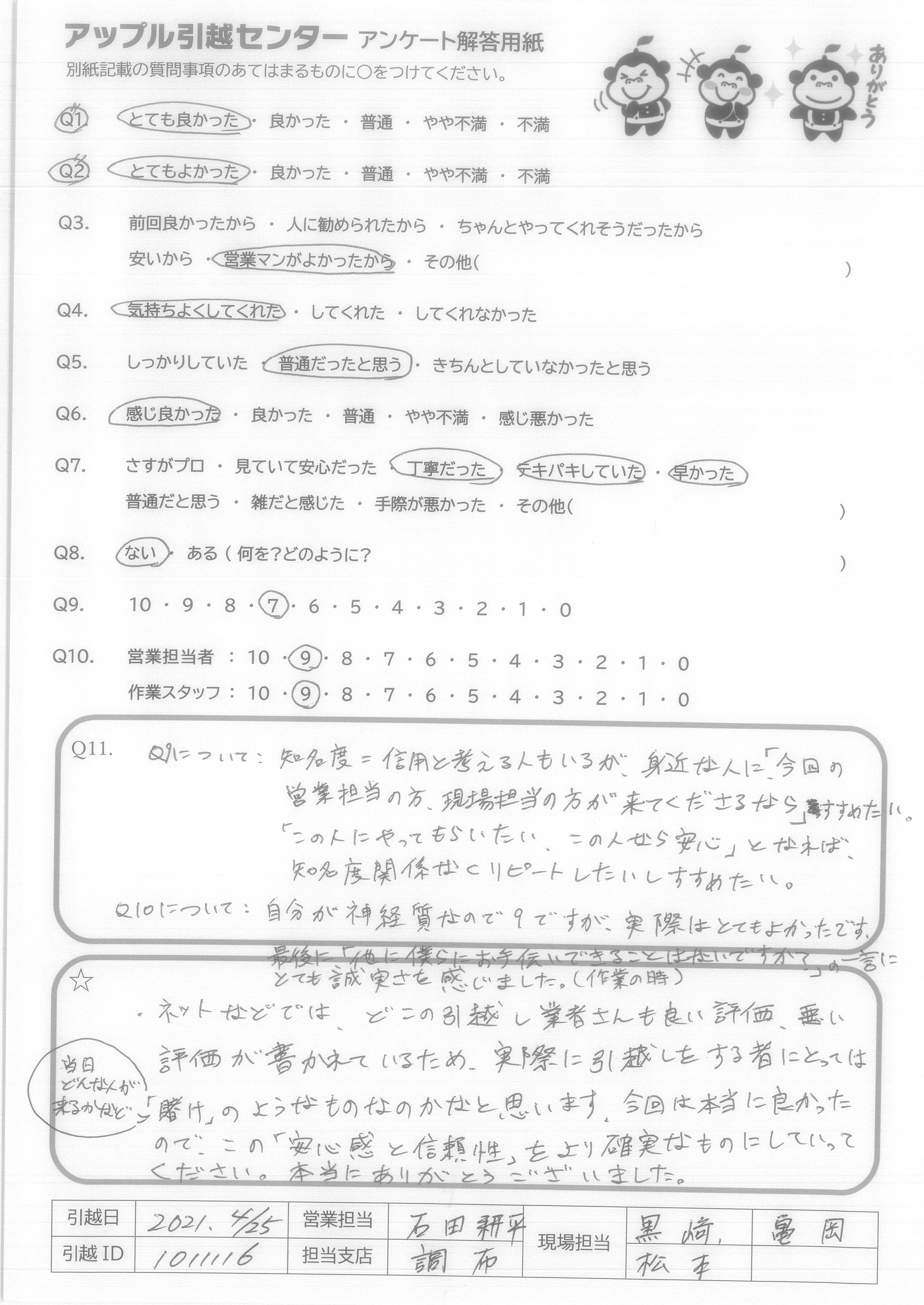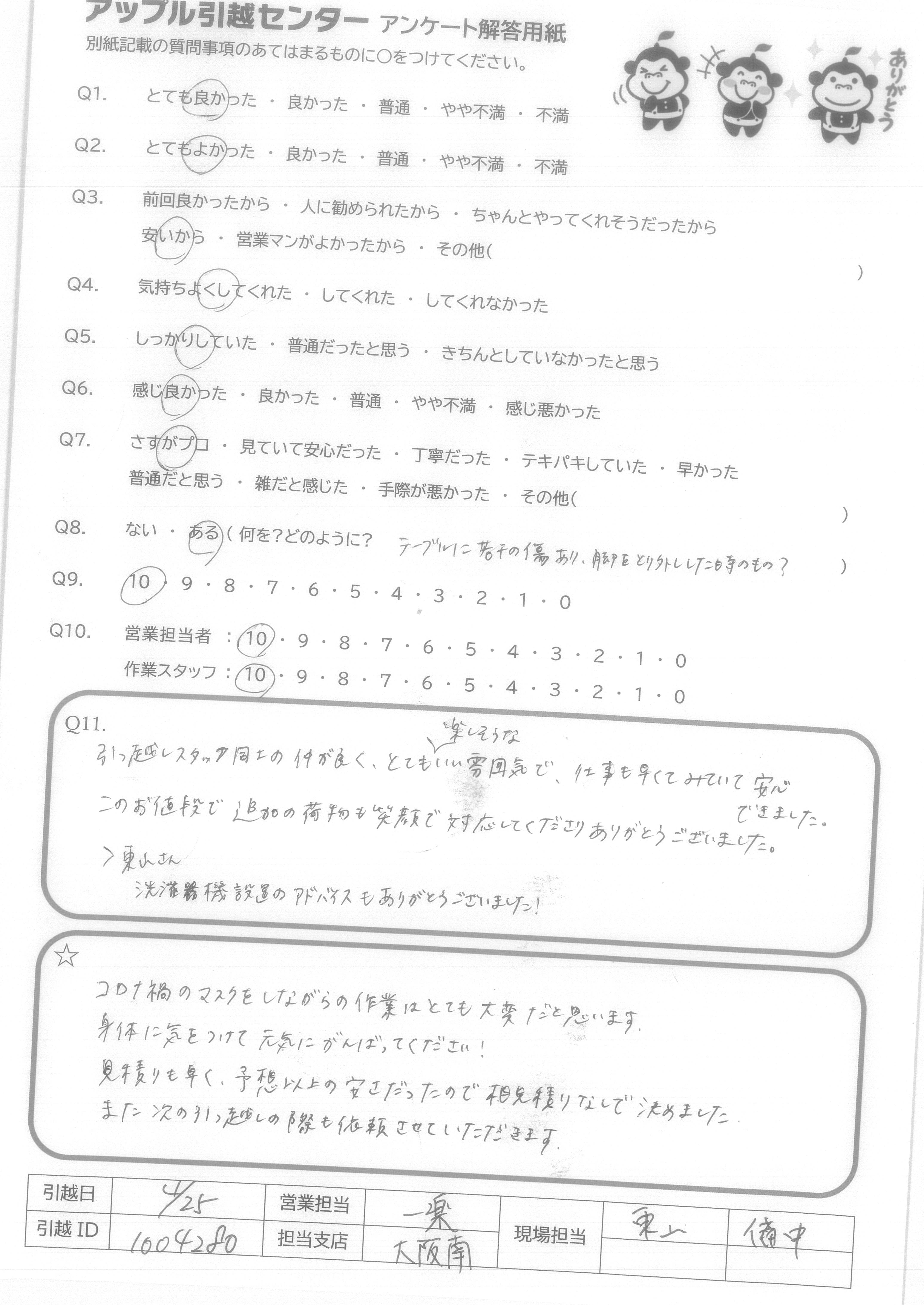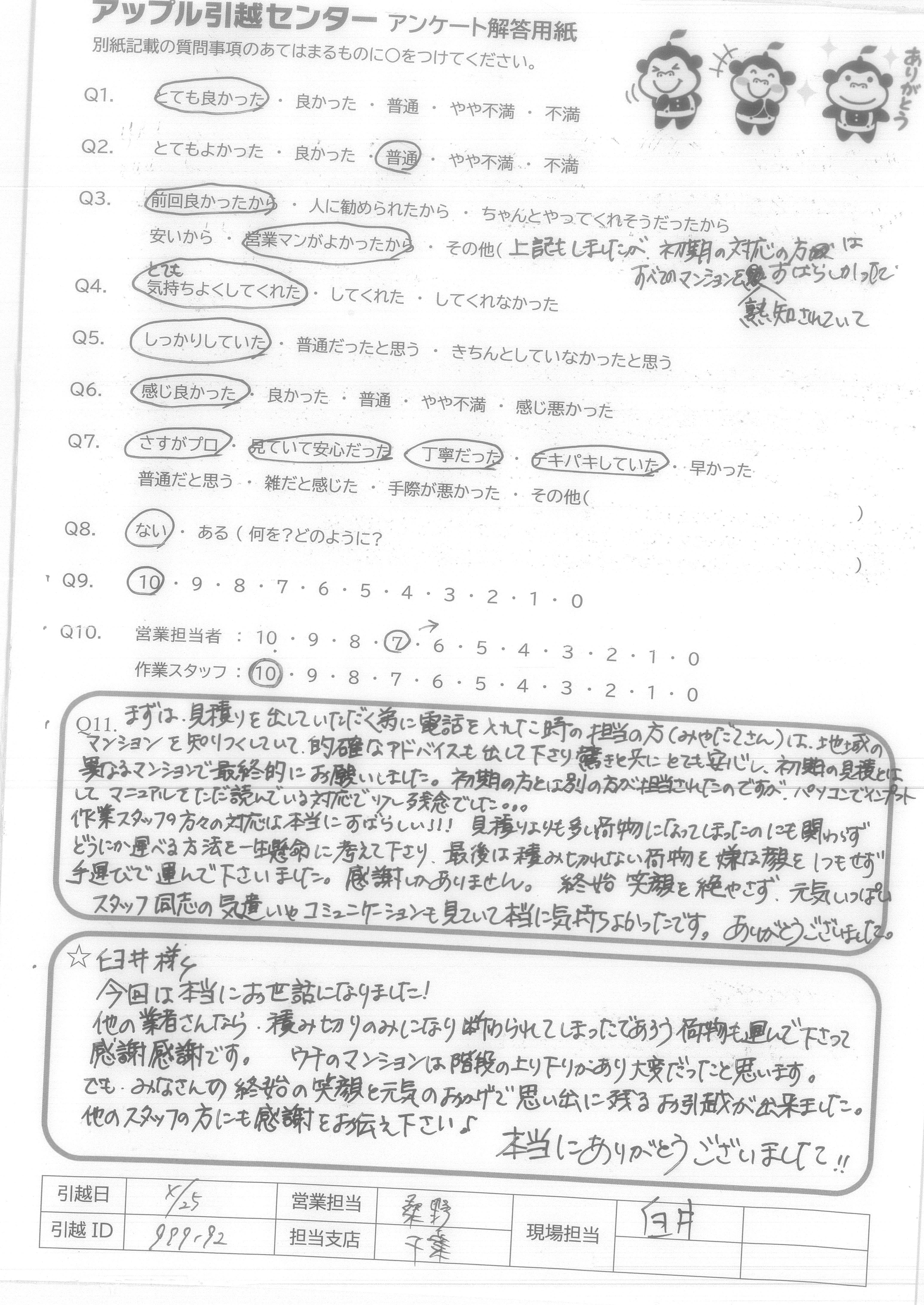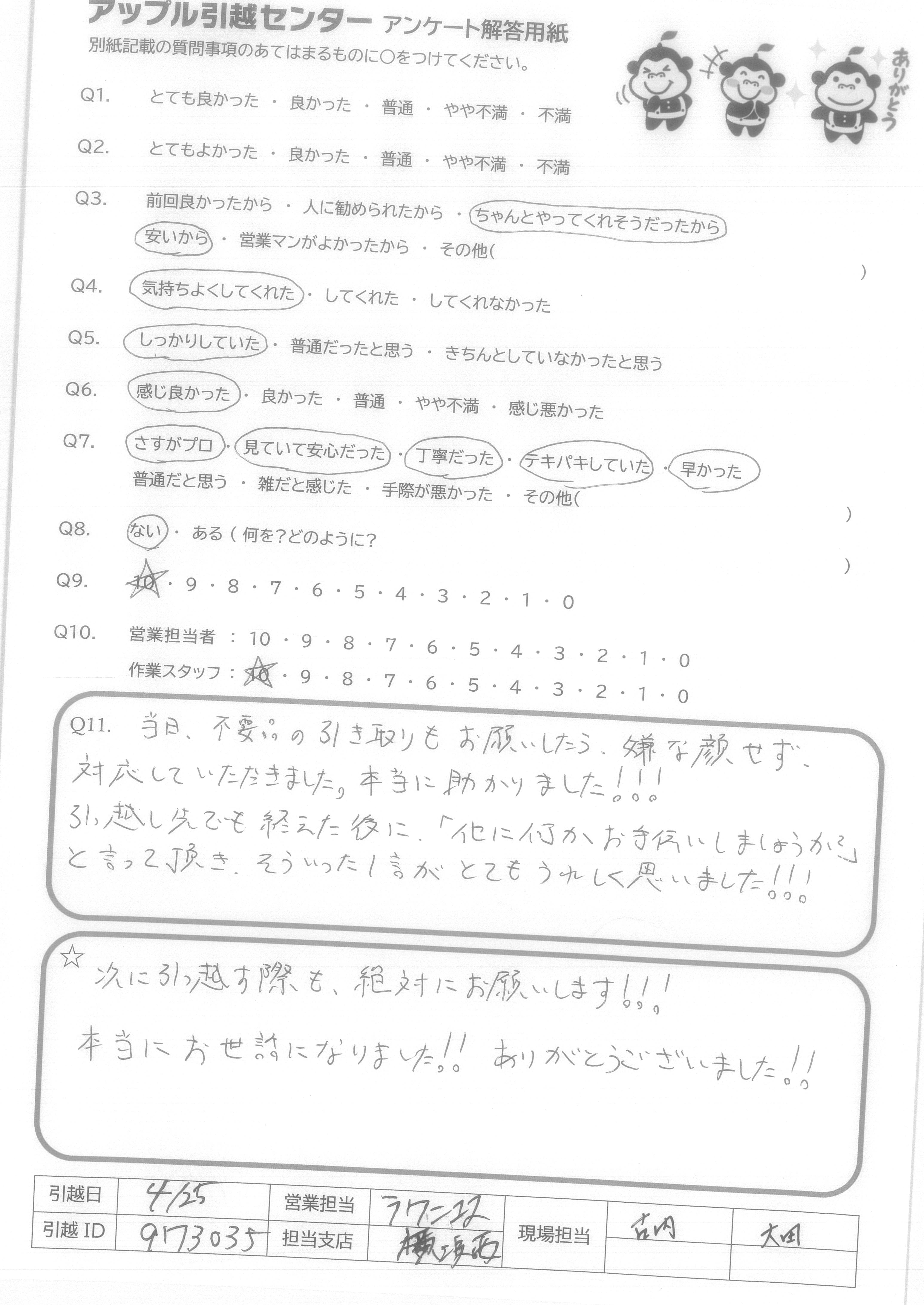 A.Q9.迷っている中に、アップル引越センターがあれば薦めたい。 Q10.対応が良かった。