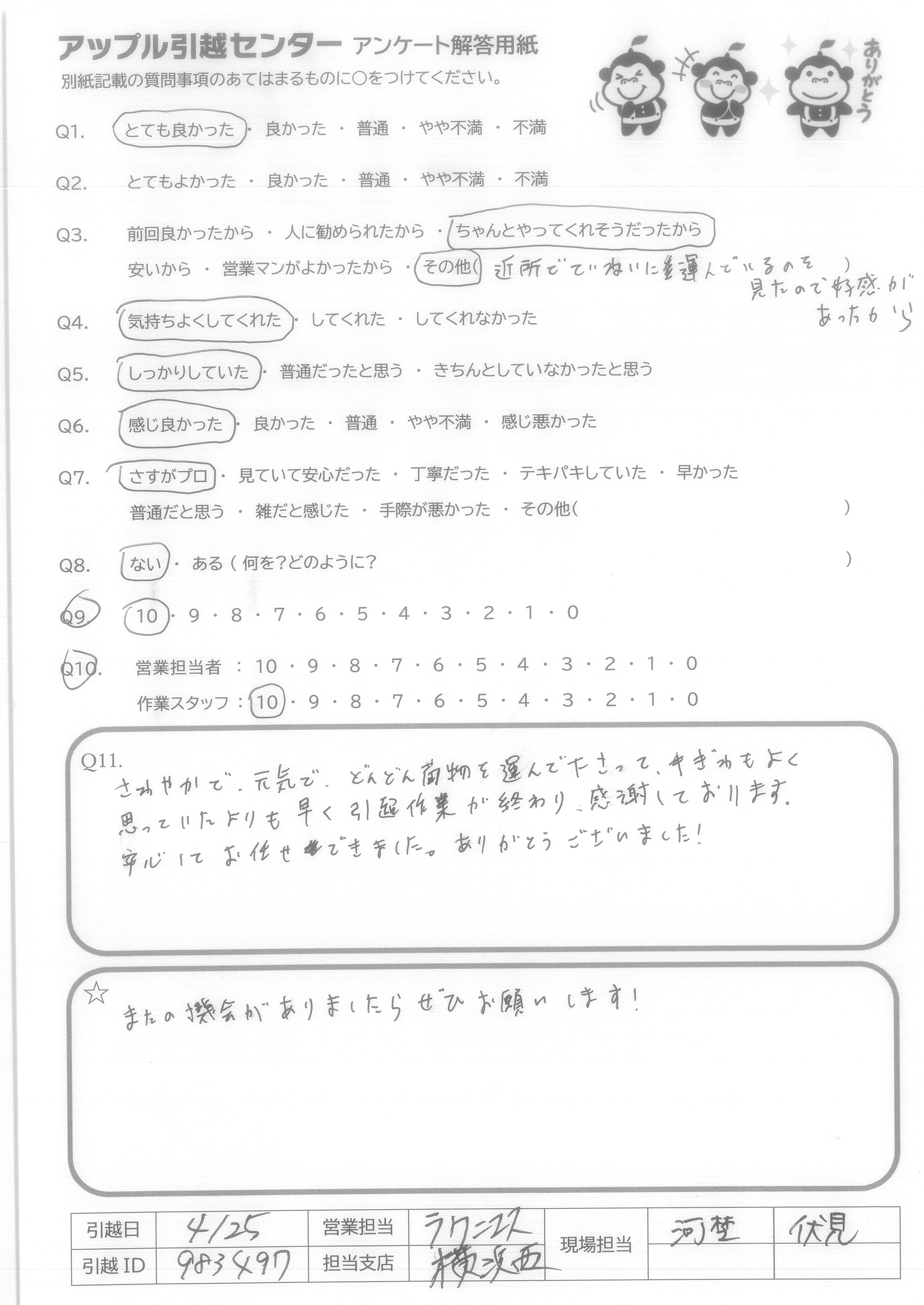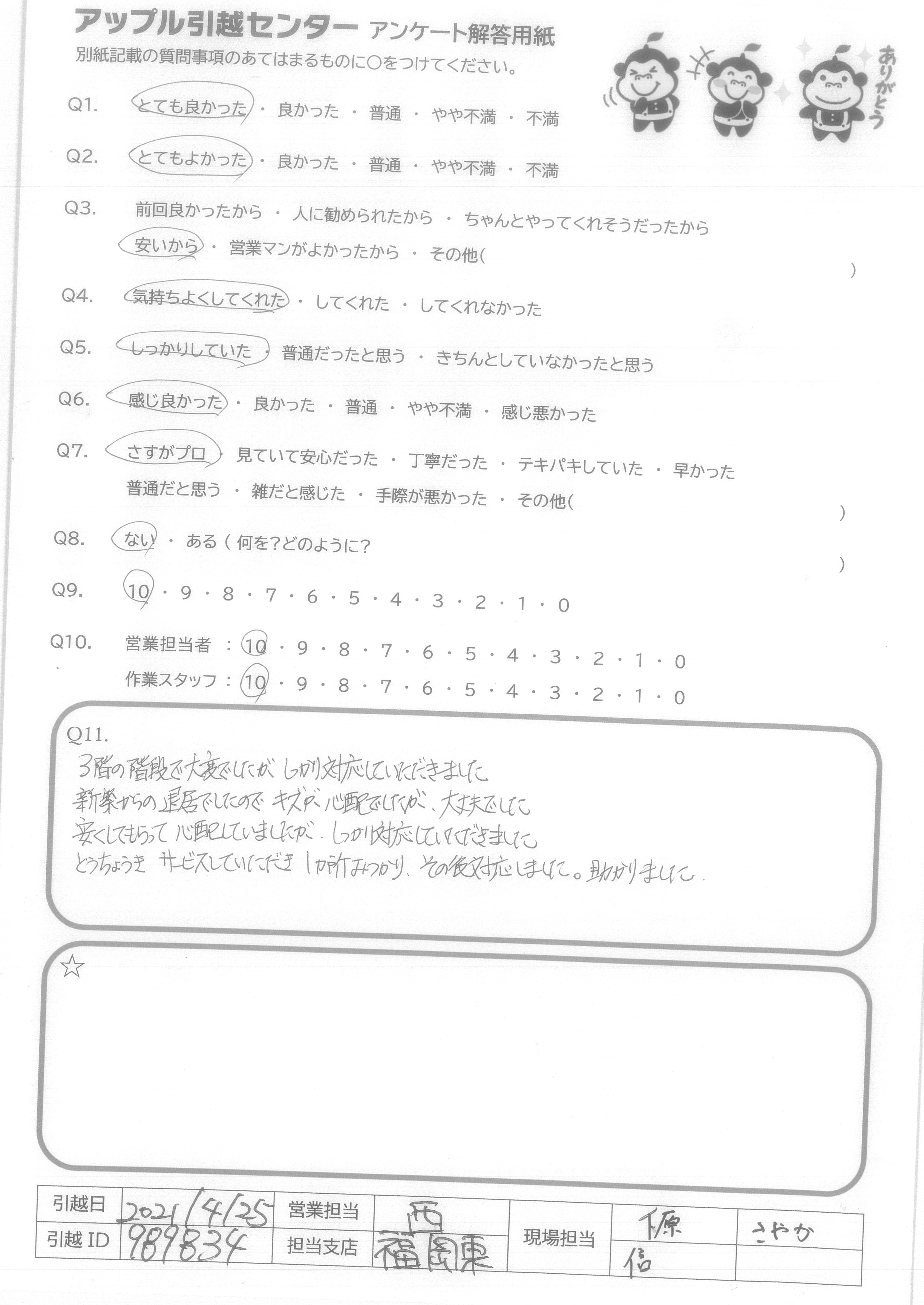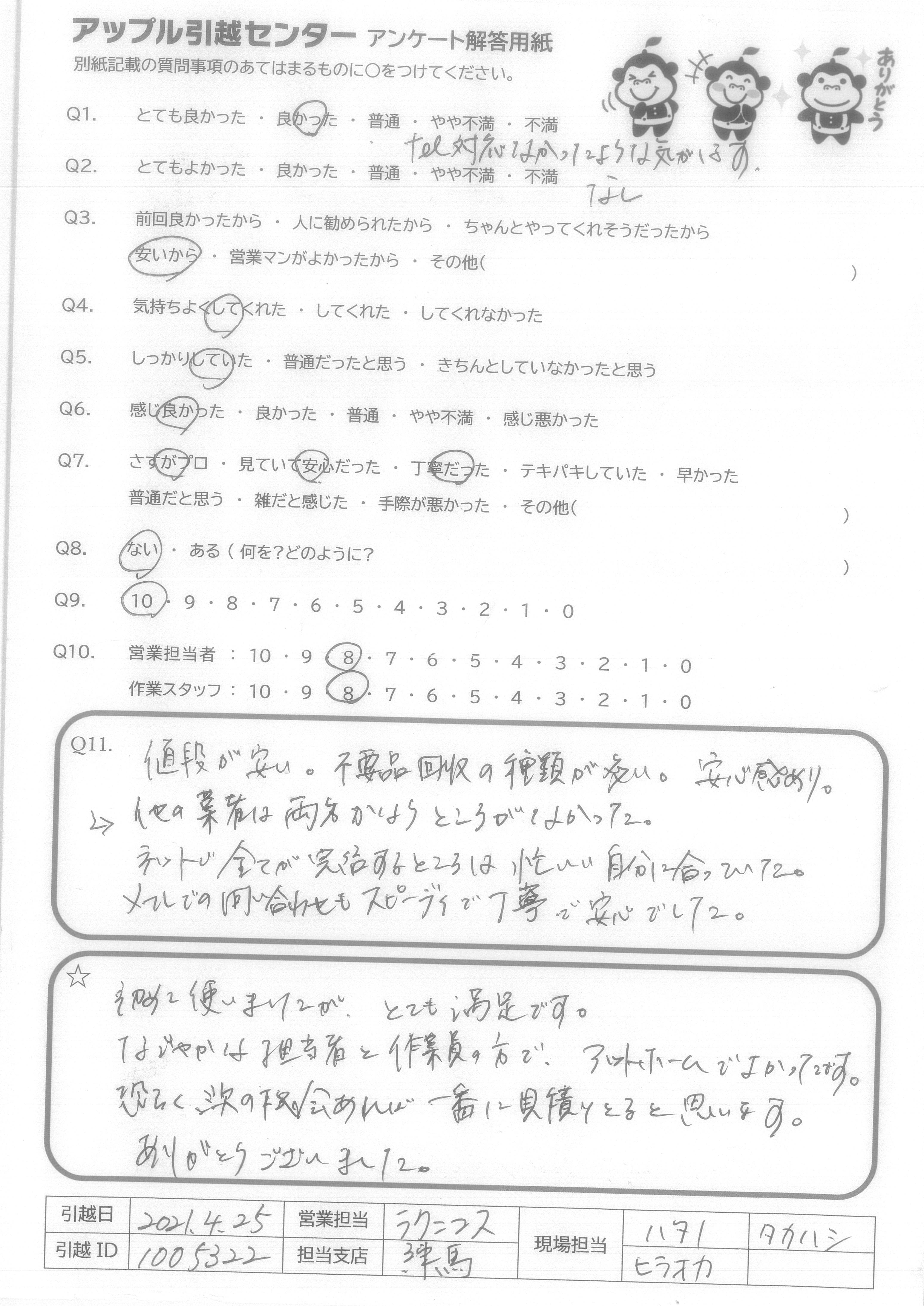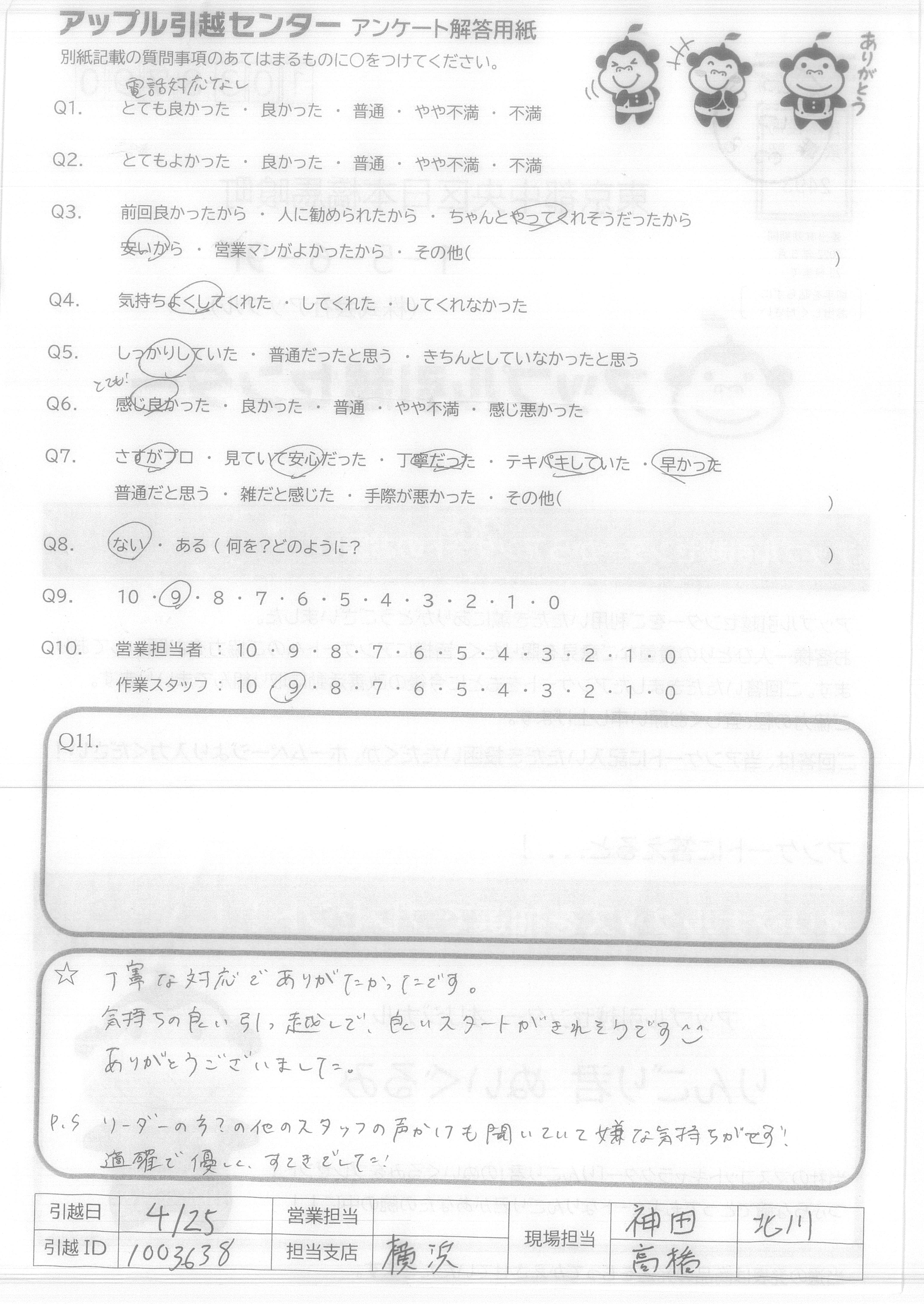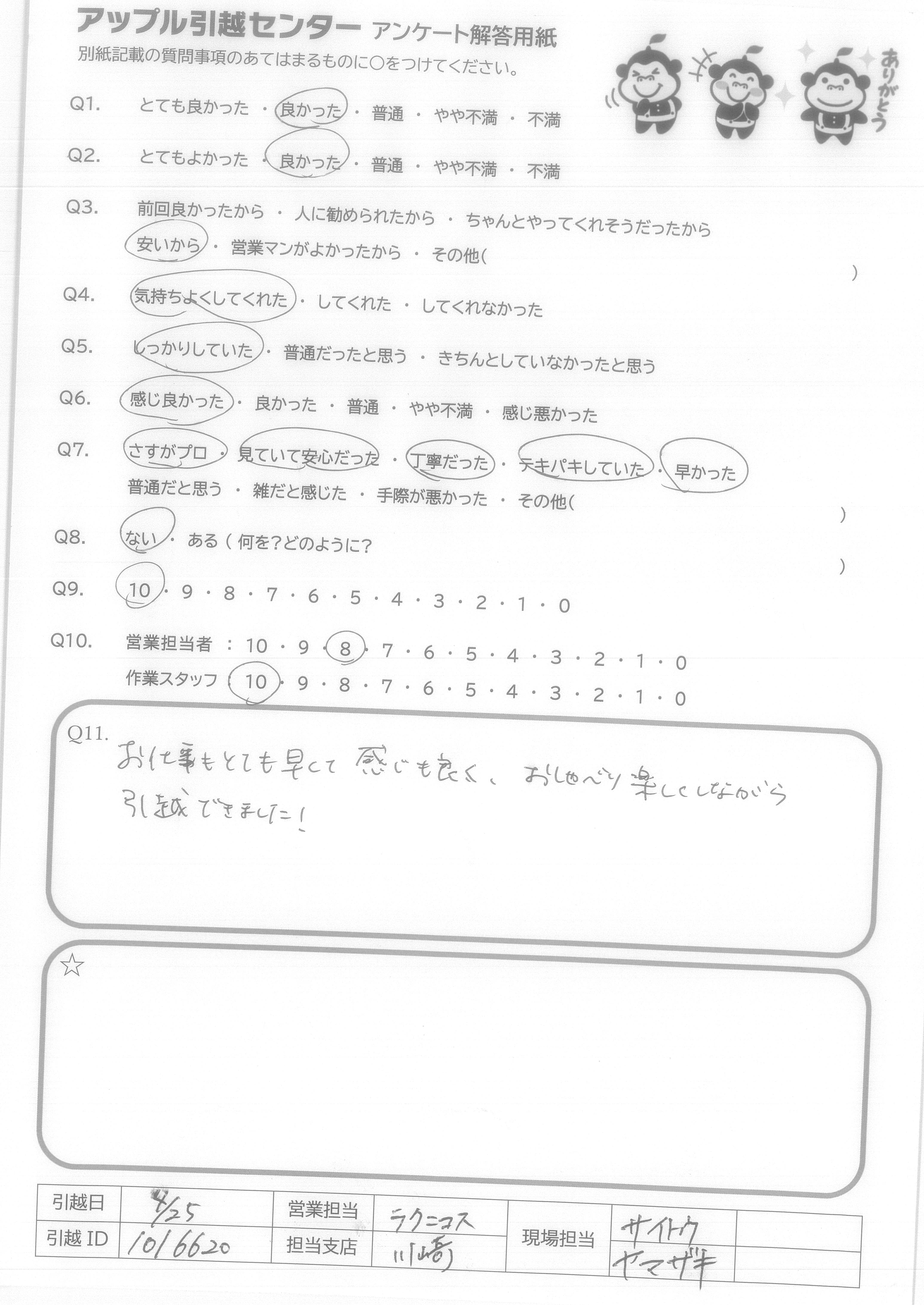 A.Q9.迷っている中に、アップル引越センターがあれば薦めたい。 Q10.対応が良かった。