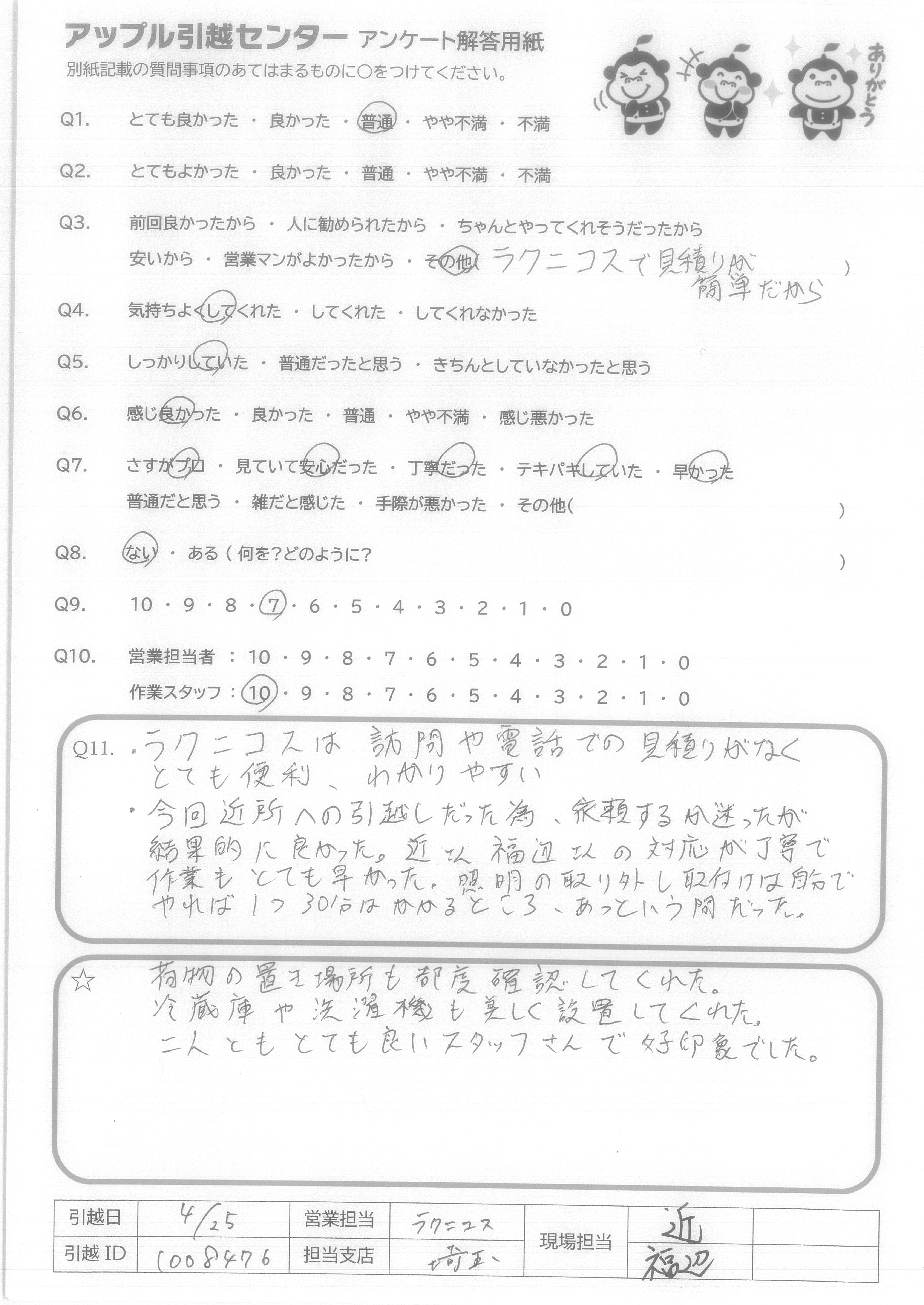 A.・ラクニコスは訪問や電話での見積りがなくとても便利、わかりやすい ・今回近所への引越しだった為、依頼するか迷ったが結果的に良かった。近さん福辺さんの対応が丁寧で作業もとても良かった。照明の取り外し取付けは自分でやれば1つ30分はかかるところ、あっという間だった。