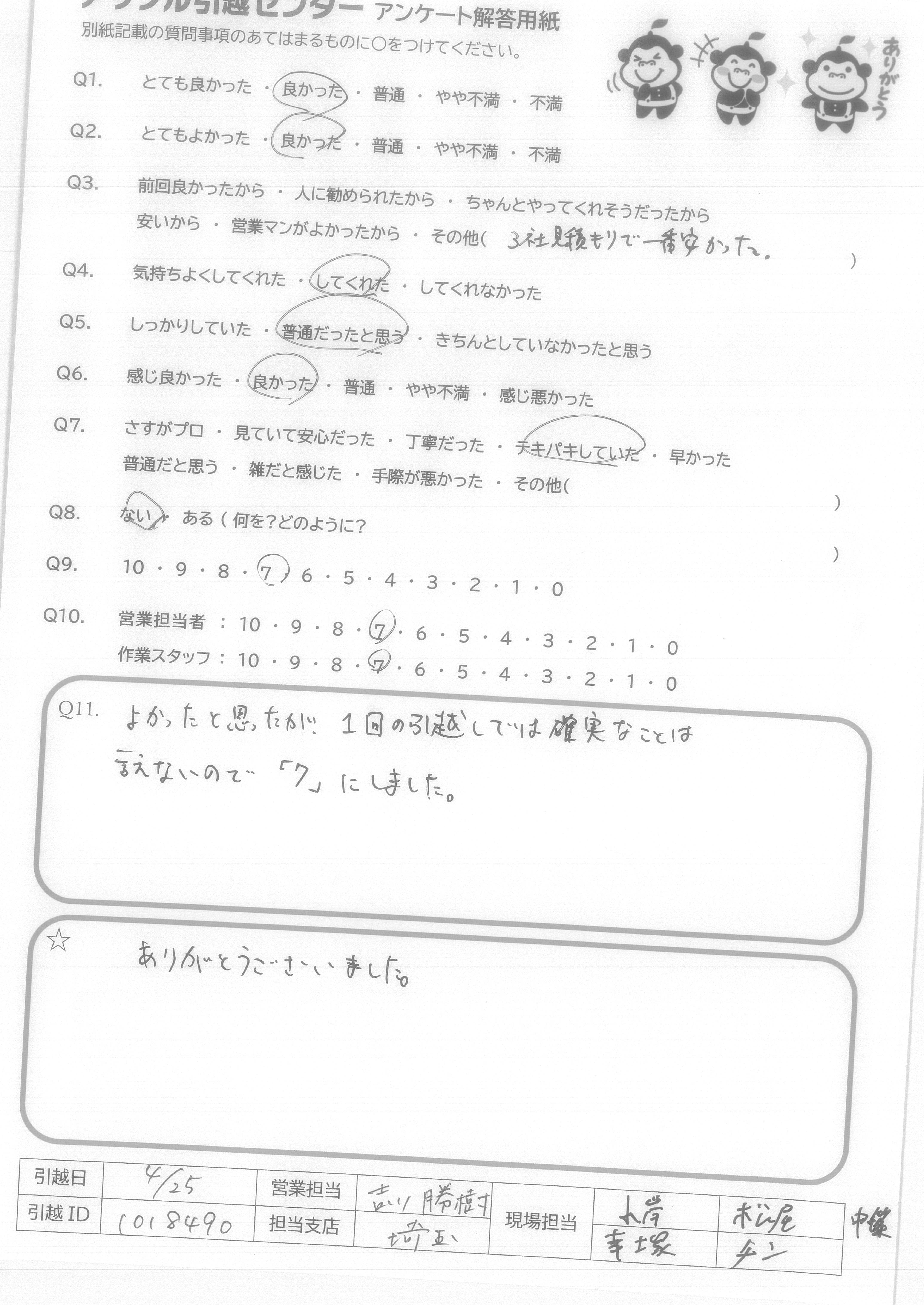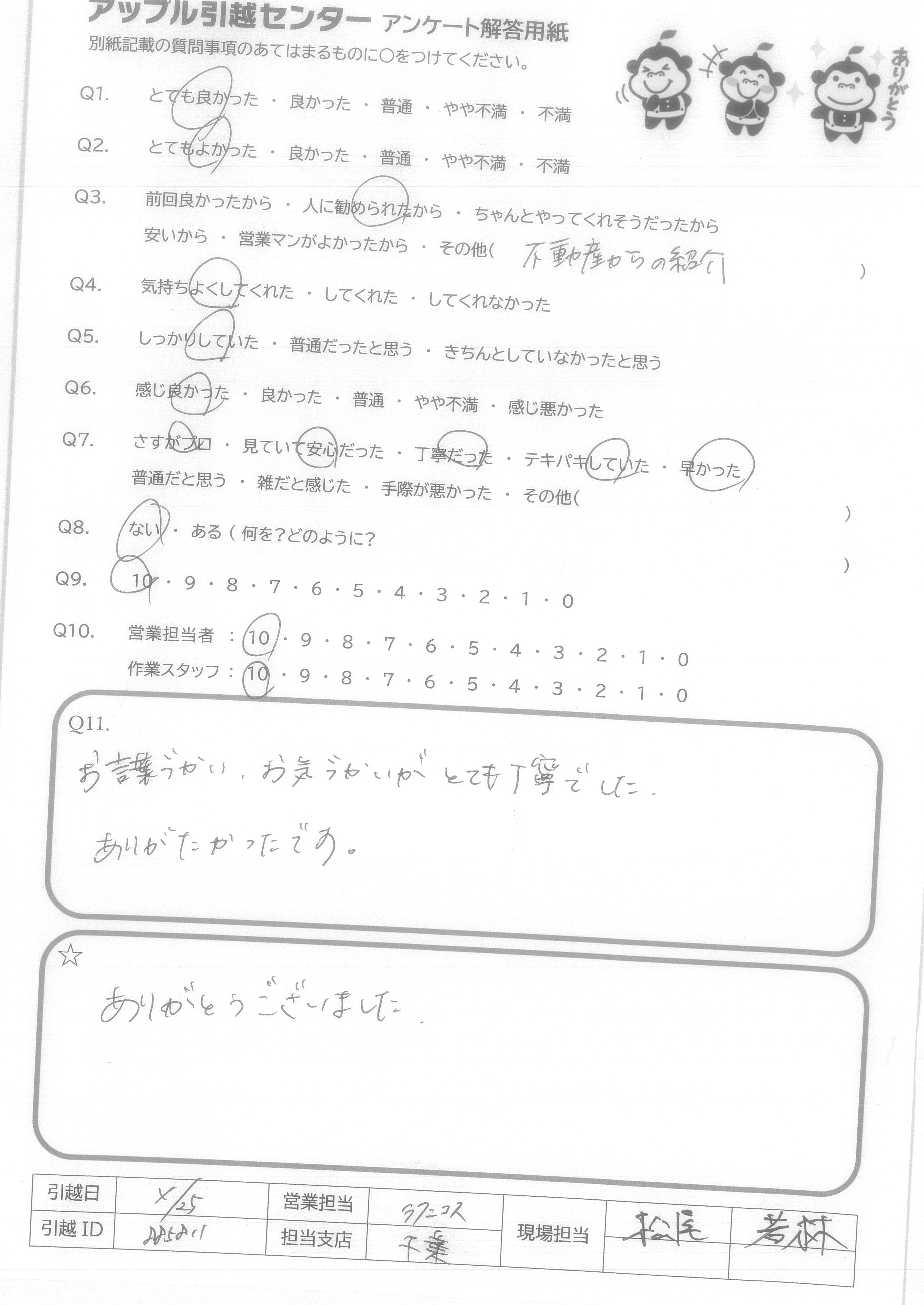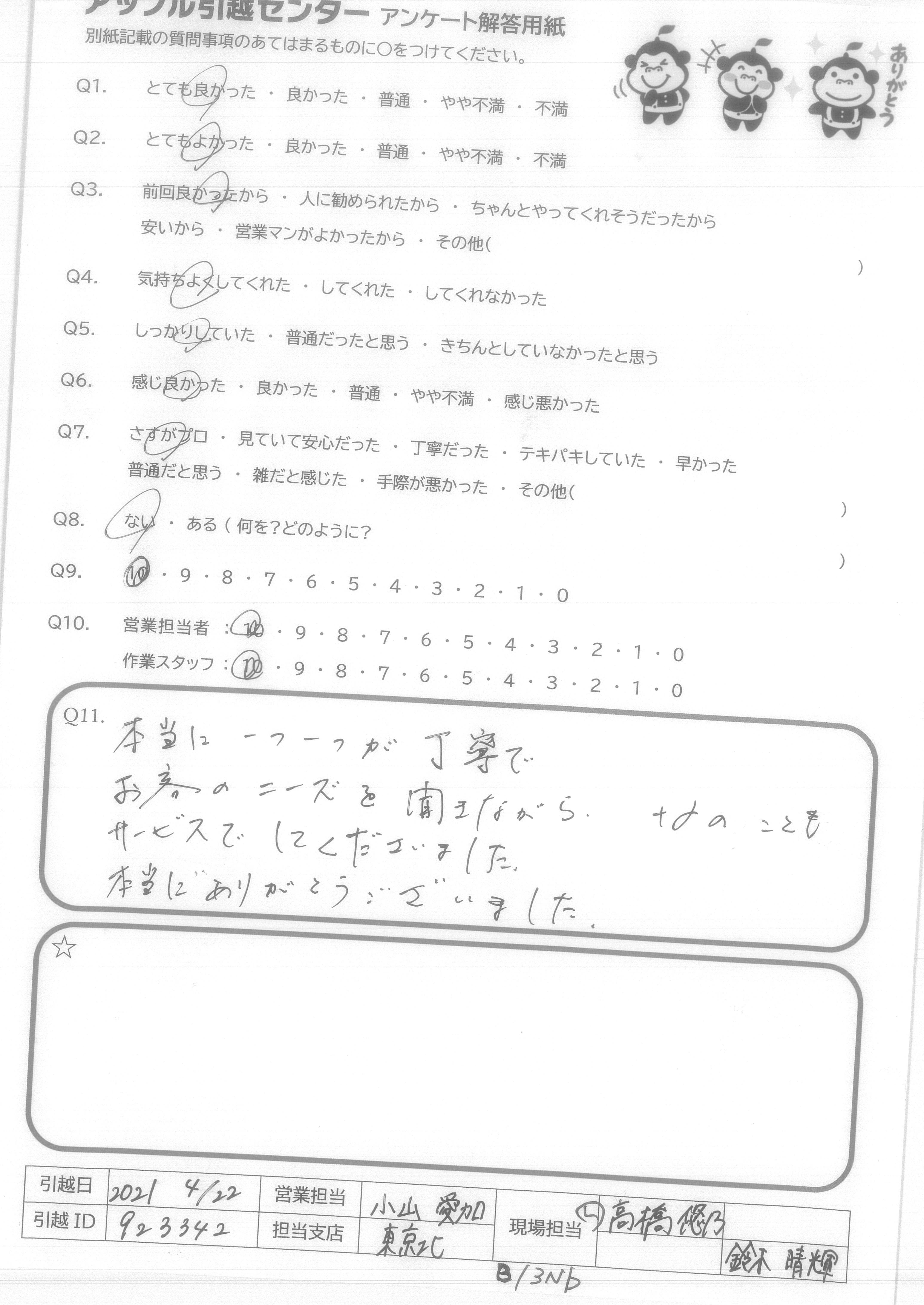 A.笑顔で丁寧に対応してくれて有り難うございます。荷物運び等作業がとても早かったです。