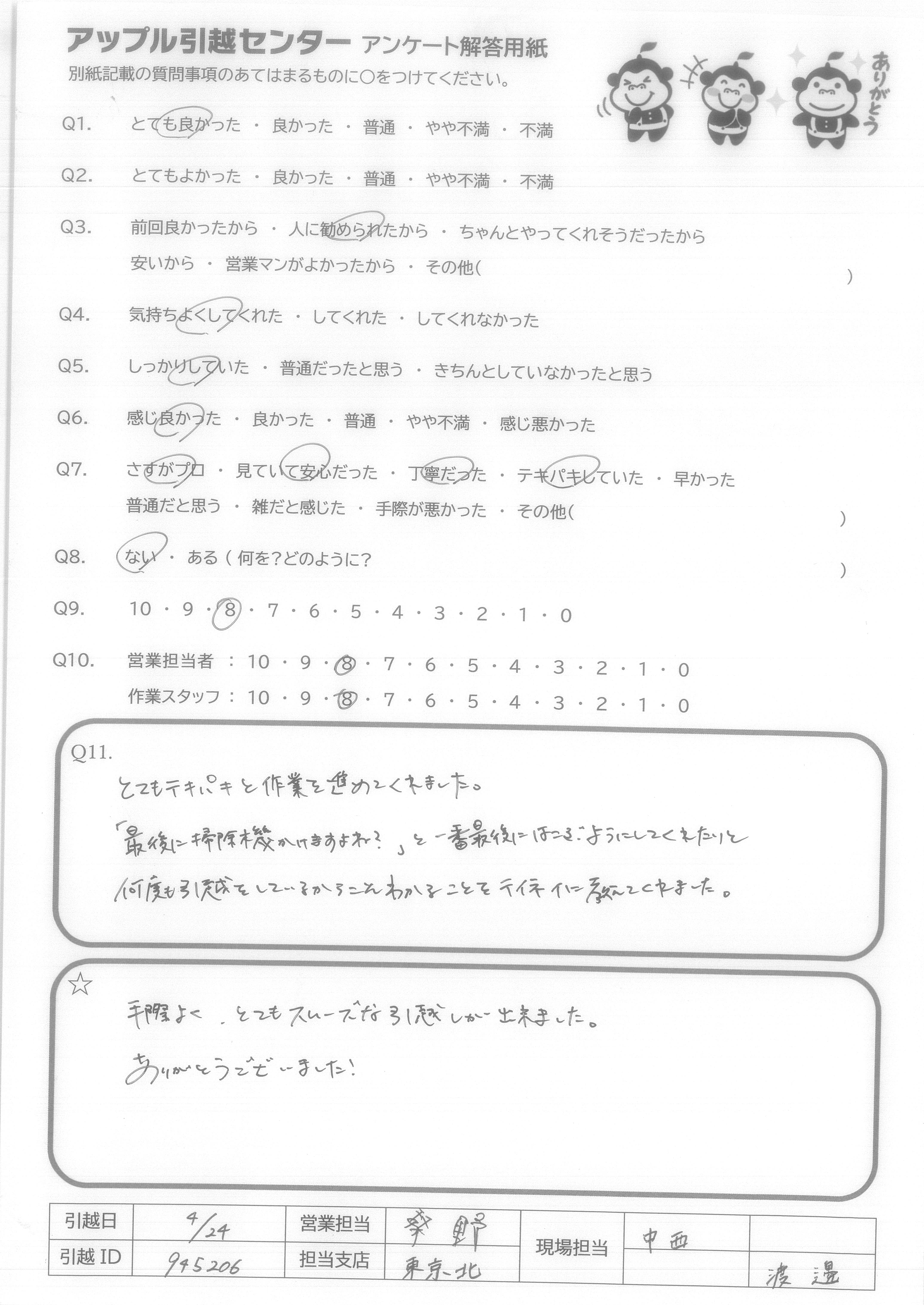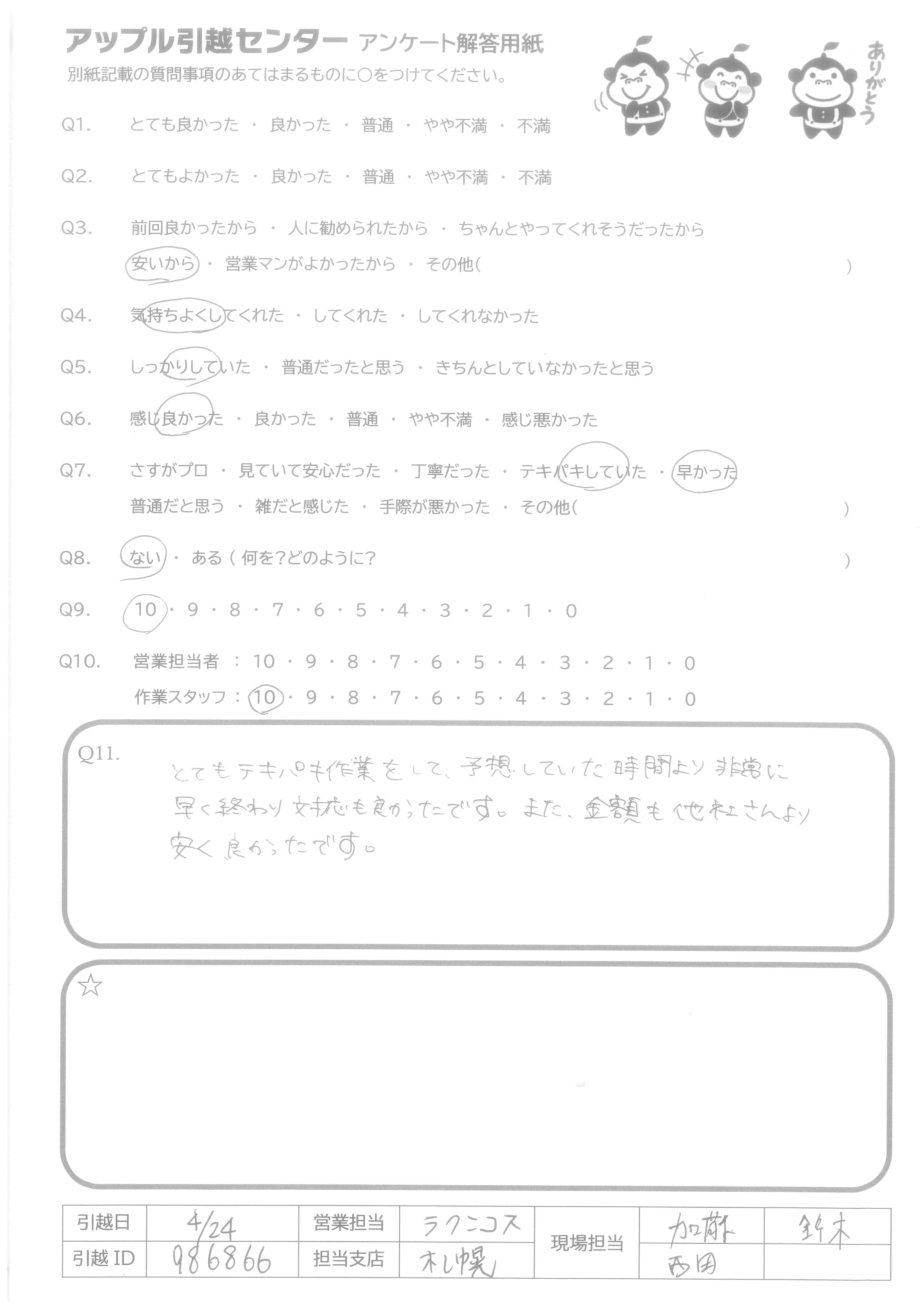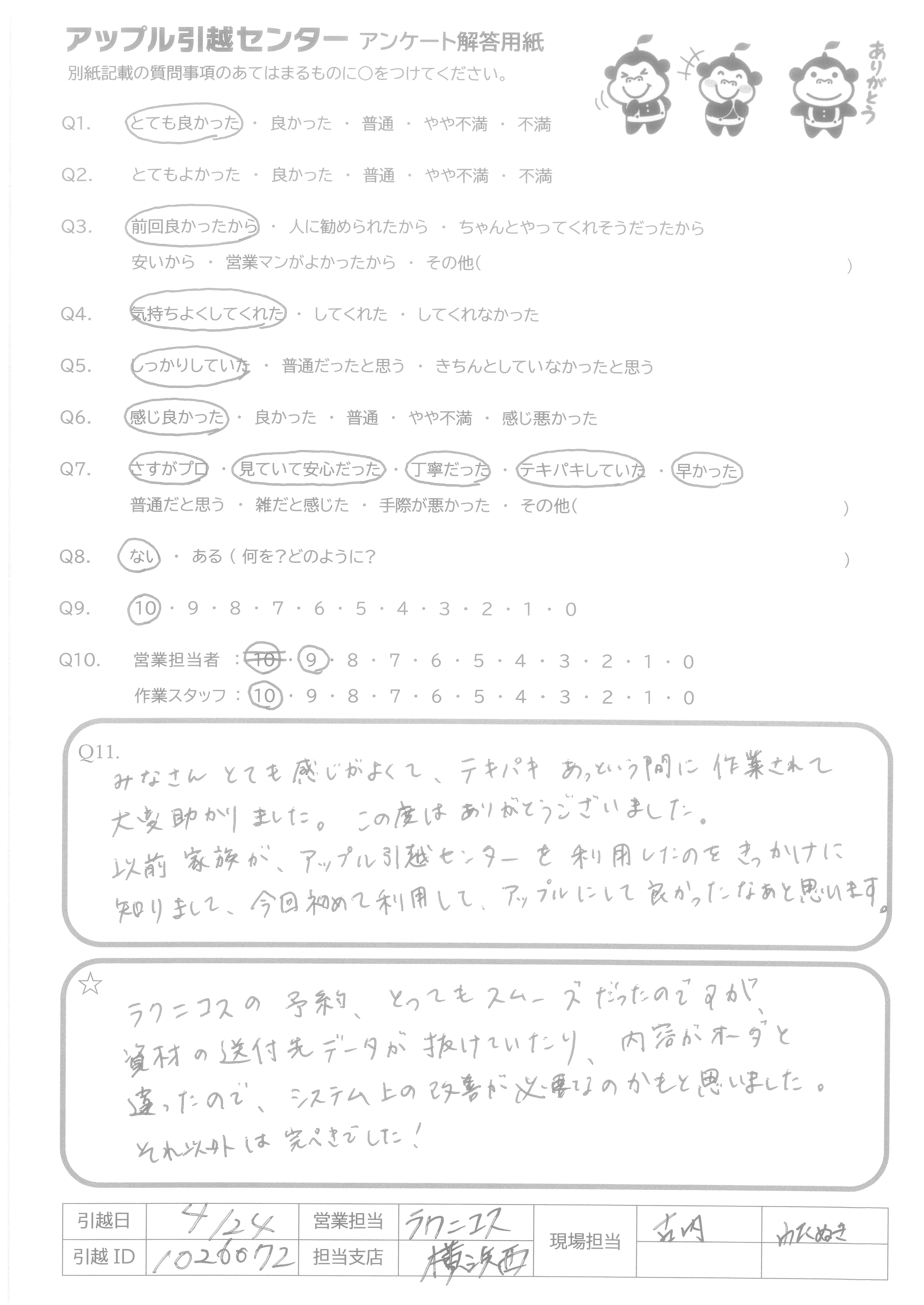 A.みなさんとても感じがよくて、テキパキあっという間に作業されて大変助かりました。この度はありがとうございました。以前家族が、アップル引越センターを利用したのをきっかけに知りまして、今回初めて利用して、アップルにして良かったなあと思います。
