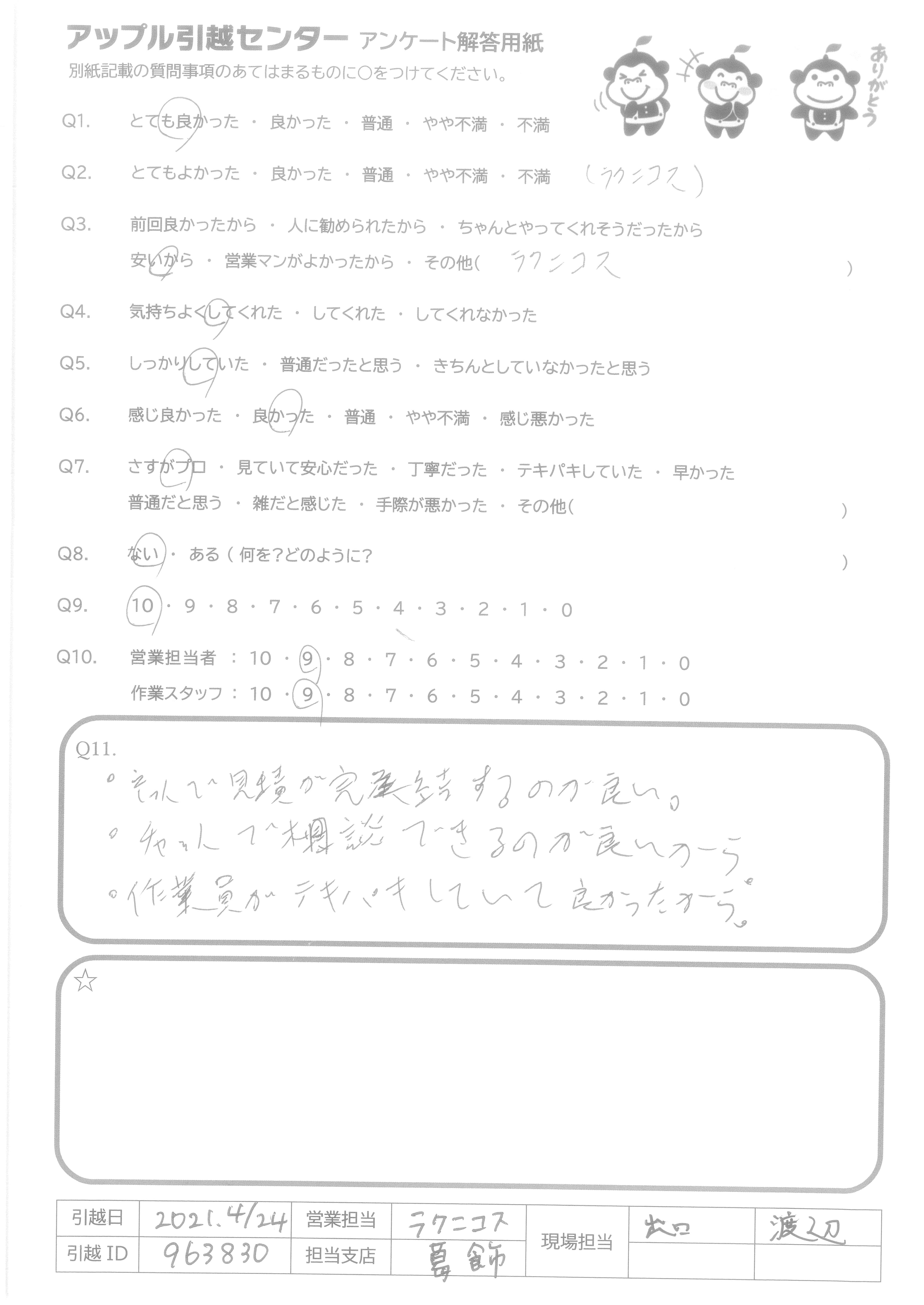 A.引っ越しのご対応ありがとうございました。お世話になりました。 十分な接客、引っ越し対応と思います。引き続きこのサービスレベルを継続していただけるとありがたいです。 次回引っ越しの際も申し込みさせていただきます。