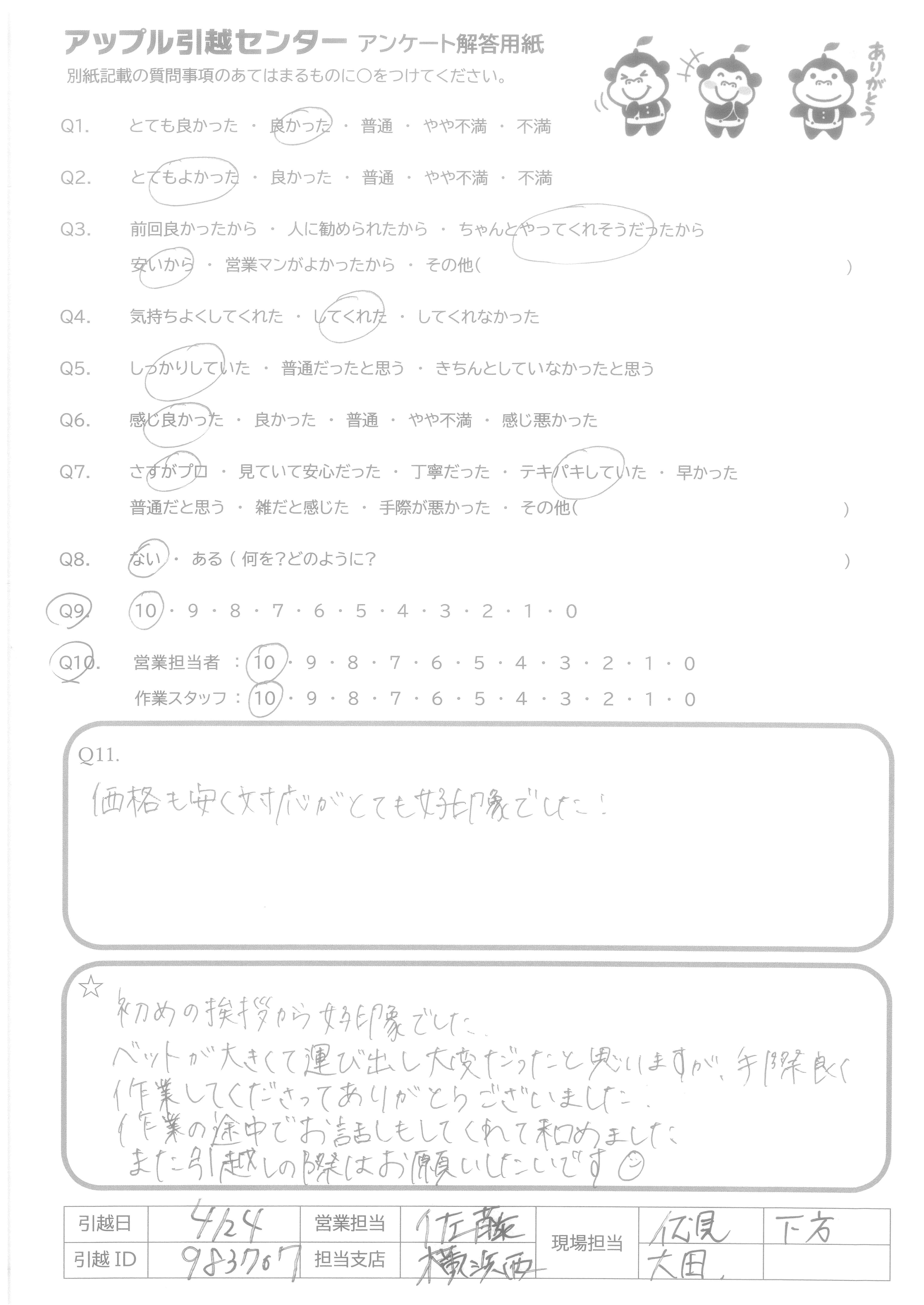 A.また引越しをする機会がありましたらアップル様にお願いしようと思っています。 今回はありがとうございました。