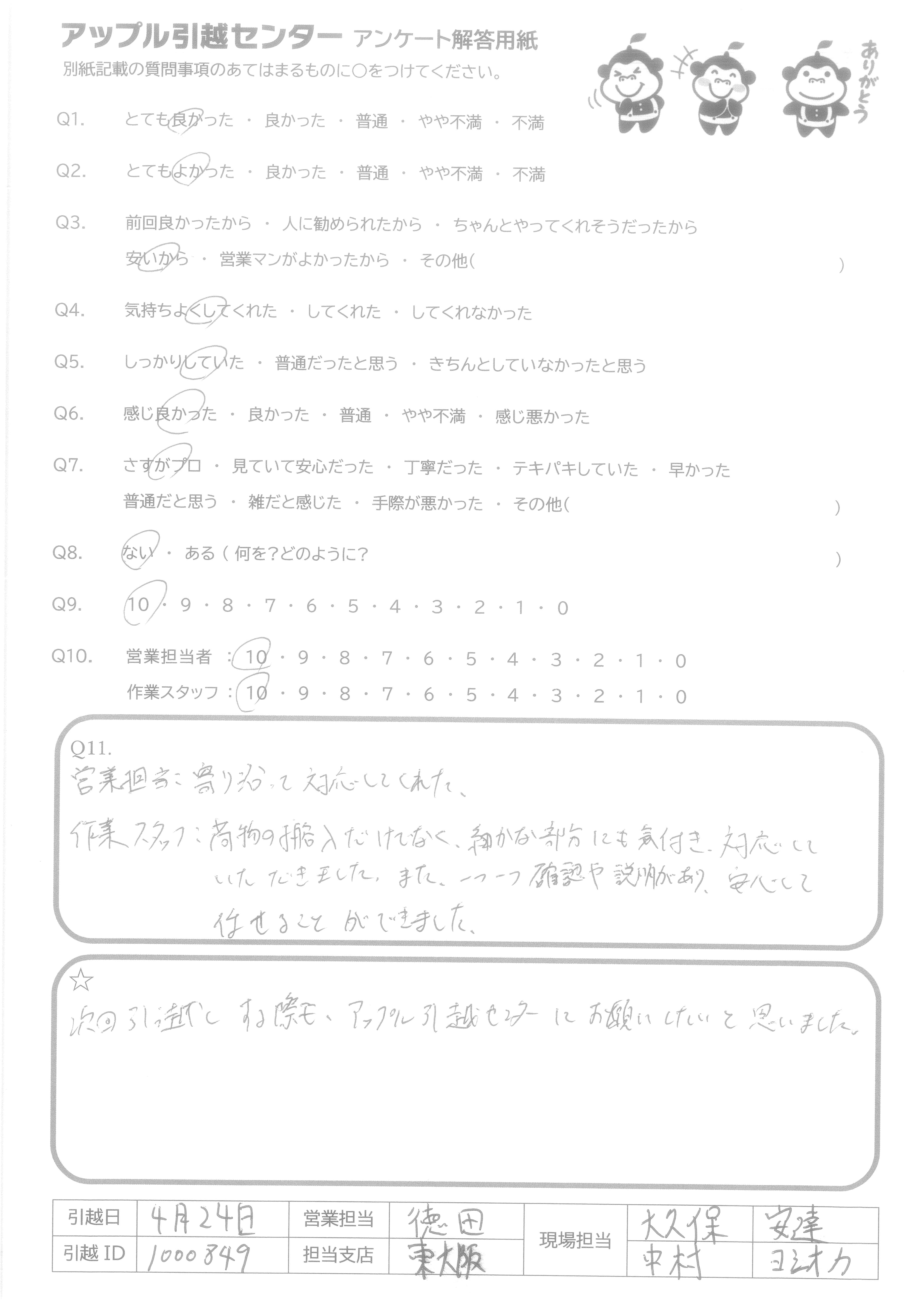 A.次回引っ越しする際も、アップル引越センターにお願いしたいと思いました。