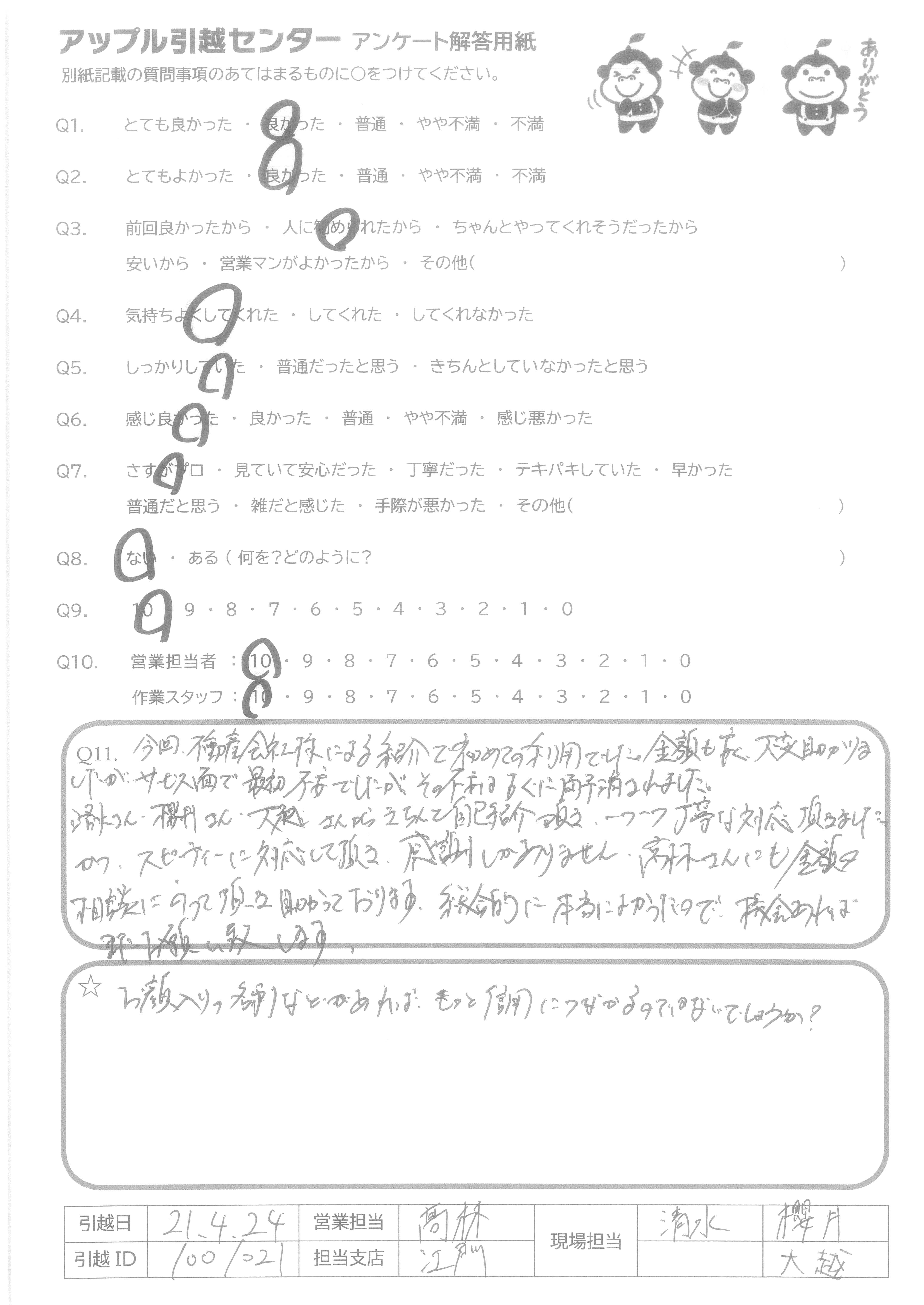 アップル引越センターでは、面映いお褒めの言葉も、胸に突き刺さるお叱りのコメントも、