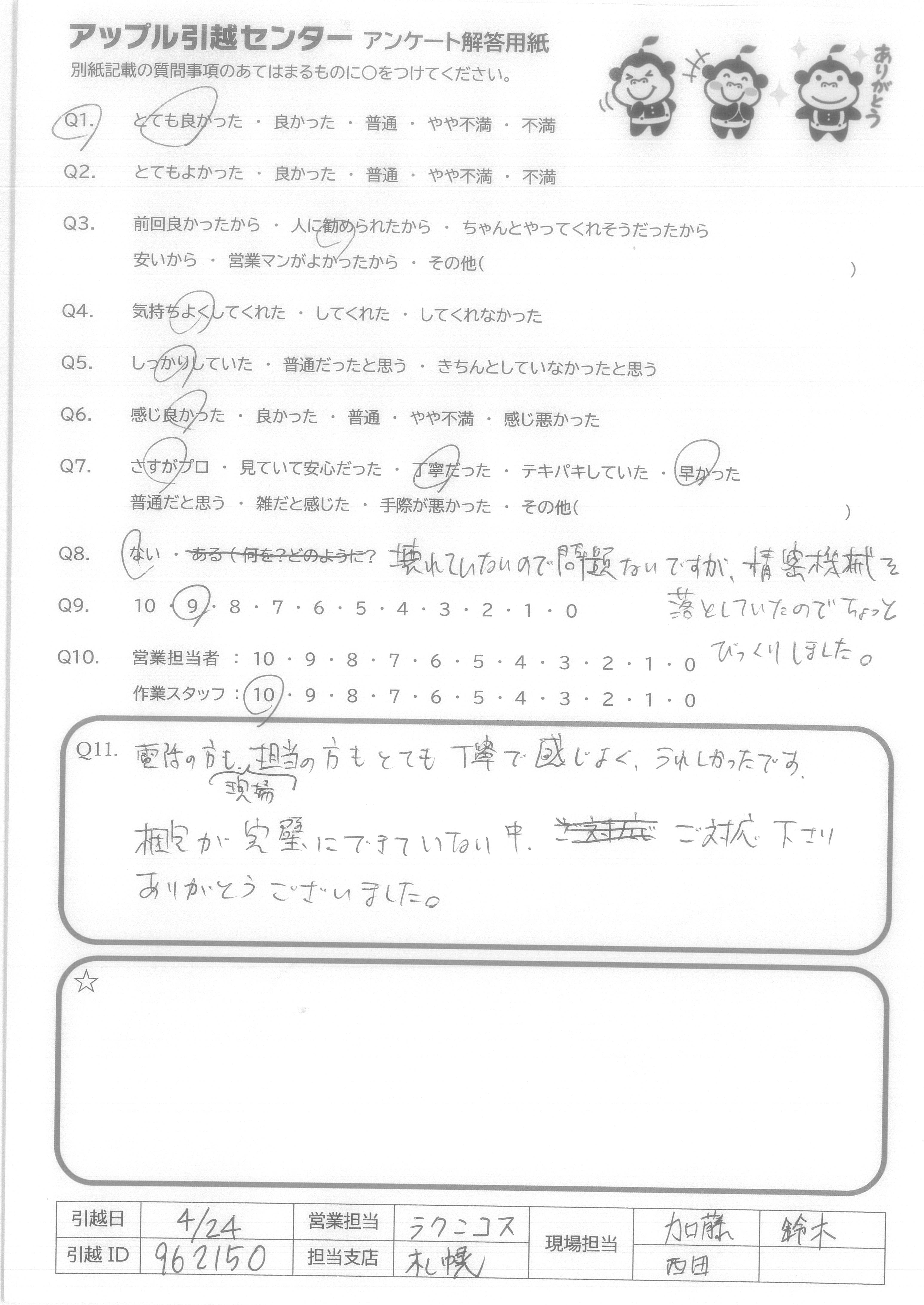 A.リーダーの方が指示を出してテキパキと仕事をされていた。 進行ごとにこちらに確認等しっかりと取ってくれた。 最後に旧居に梱包布を忘れて出発されてしまい、すぐ気づいたので取りに来てもらったが、こちらも確認不足だったためあまり気にしていません。
