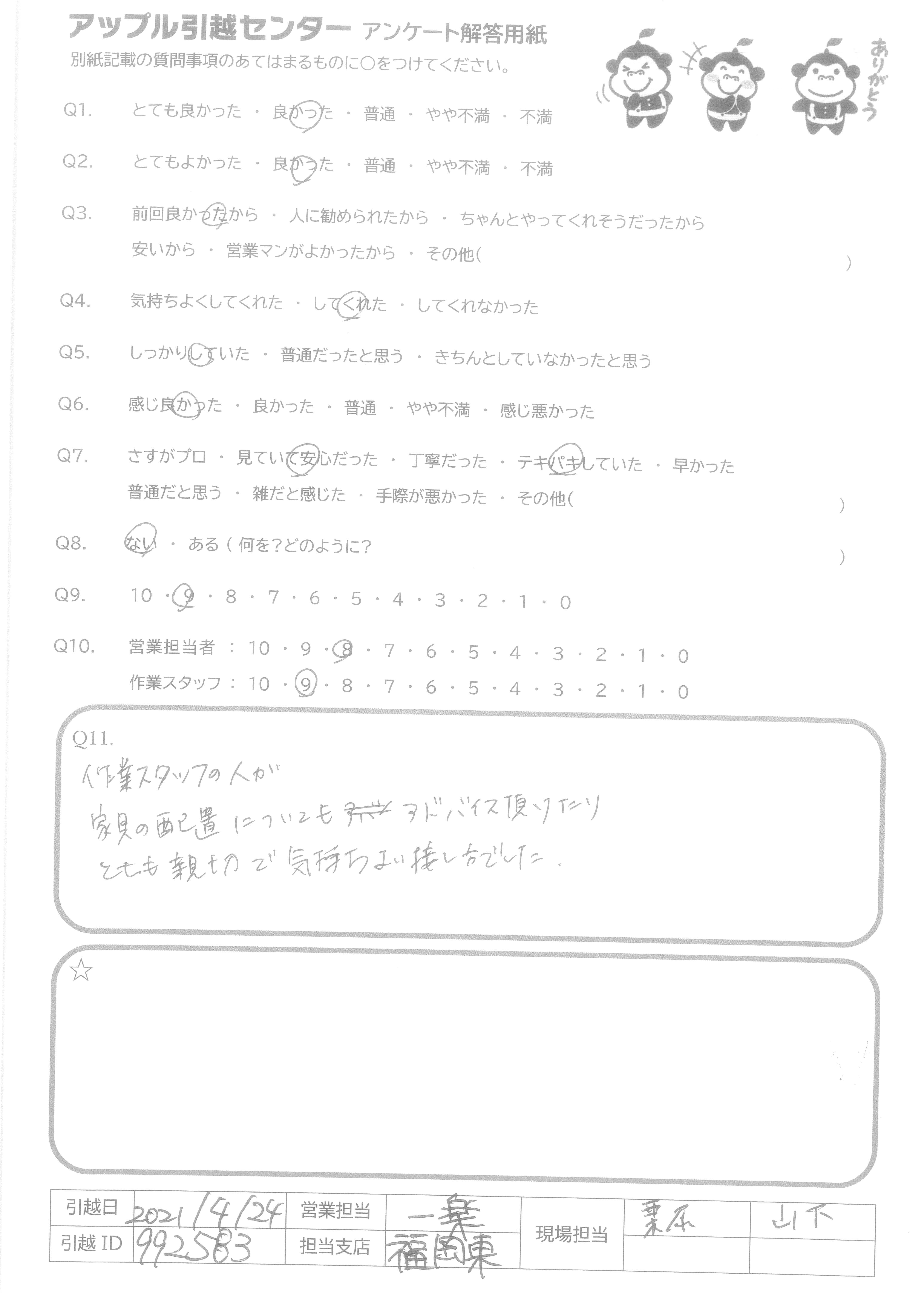 A.引っ越しはかなり経験しておりますが、本当によく頑張ってくださいました。